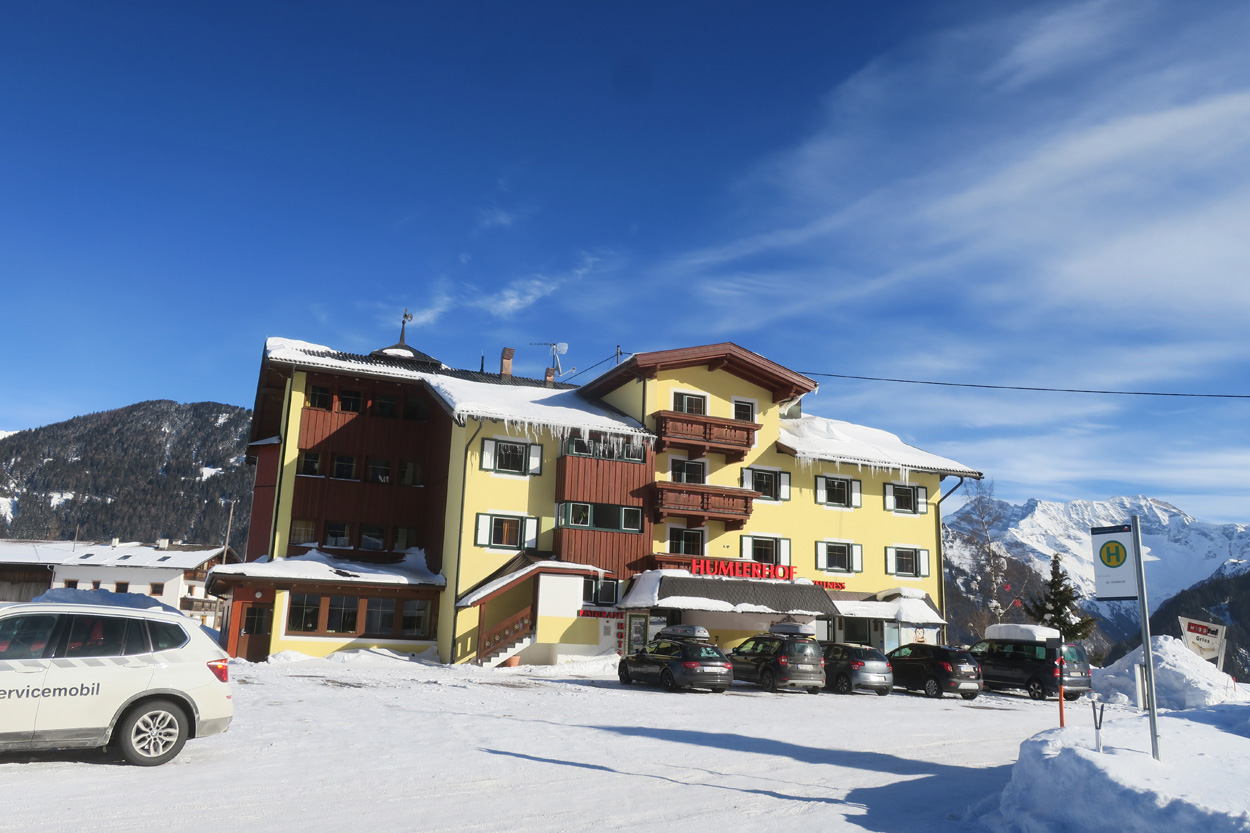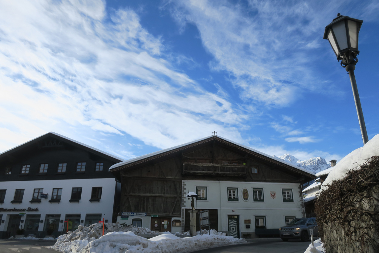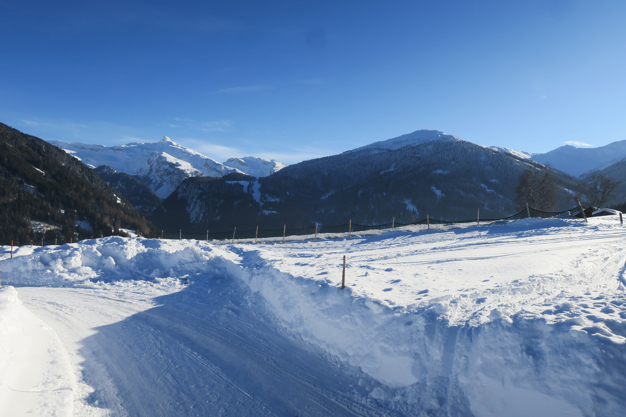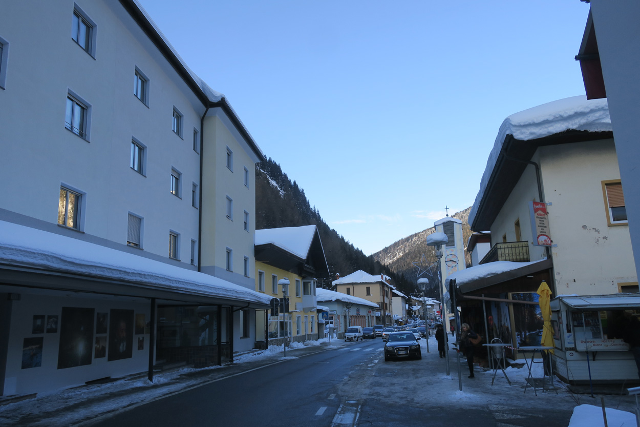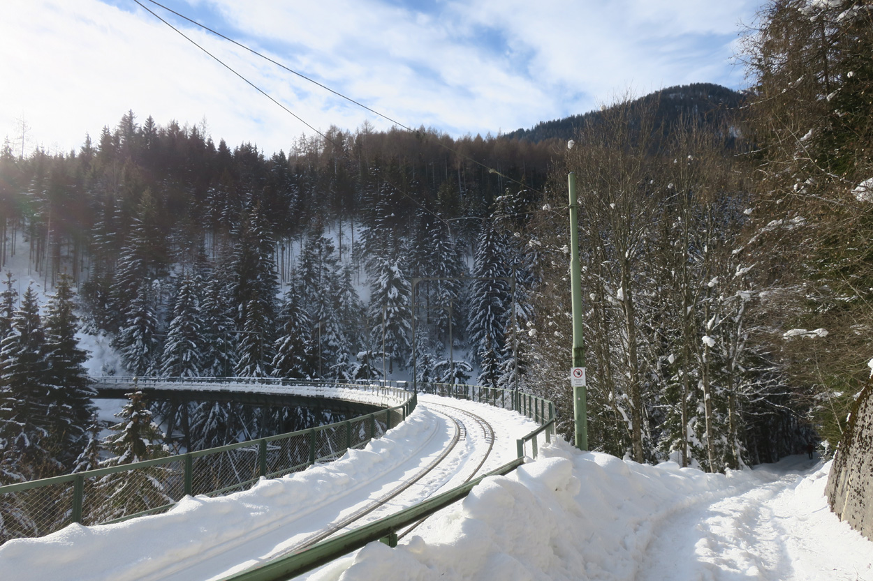 Heute morgen ging es mit dem erst möglichen Zug nach Innsbruck. Schon bei der Anreise durch den Arlberg sah ich, dass zur Zeit extrem viel Schnee liegt. Pünktlich um 10.10Uhr kam ich dann in Innsbruck an. Danach folgte dann bald der Aufstieg beim Bergisel in Richtung Sonnenburgerhof und Natters. Von Natters nach Mutters konnte ich dann dem ersten Schneeschuhtrail folgen. Da es vor einer Woche wohl in den Schnee hineingeregnet hat, waren selbst die Schneeschuhspuren hart genug um darauf fahren zu können. Von Mutters ging es dann auf einem Strässchen zur Kohlstattsiedlung. Von hier an war dann der Fahrweg bis zur Haltestelle Brandegg der Stubaitalbahn, nicht mehr gepfadet. Etliche Fusspuren sorgten jedoch dafür, dass ich trotzdem einen fahrbaren Untergrund hatte. Ab der Haltestelle Brandegg war dann die Bikeroute wieder gepfadet und hatte wenige Autospuren, so dass ich speditiv nach Telfes und Fulpmes kam. In Fulpmes besichtigte ich dann noch kurz die Kirche. In der Kirche fiel mir dann auf dass sich sogar im Weihwasser Eis am bilden war. Die Temperaturen mussten wohl tief unter Null gewesen sein. Auf der Strasse ging es dann nach Matrei am Brenner. Dort folgte ich dann dem Radweg entlang nach Steinach. Auch hier hatte es schneebedeckte aber noch gepfadete Feldwege. In Steinach begann ich dann um 12.45Uhr mit dem Aufstieg nach Nösslach. Leider war dieses Asphaltsträsschen gesalzen. Aber auch so blieb der Schnee liegen. Es war wohl zu kalt, dass das Salz noch Wirkung hatte. Lediglich etwas aufgeweicht war der Schnee. Um 13.30Uhr kehrte ich dann in Aussernösslach auf 1384m im Restaurant des Hotels Hummlerhof ein. Im Angebot war hier noch Wieneschnitzel mit Pommes. Nach dem ich gegessen und mich aufgewärmt hatte ging es gegen 14.30Uhr wieder weiter. Auf der schneebedeckten Straße ging es dann noch 50hm weiter bis Nösslach hinauf. Dort ging es ebenfalls auf der Scheefahrbahn hinunter nach Vinaders. Ab hier waren dann die Strassen zu stark gesalzen und folglich aper. In Gries auf 1150m begann dann noch der Schlussaufstieg auf der Bundesstrasse zum Brennerpass. Etwa um 15.30Uhr überschritt ich dann auf 1370m die Grenze nach Italien. Hier oben war wegen den vielen Shops und Einkaufszentren reger Verkehr und deshalb recht dreckige Luft. Um nach Sterzing zu kommen wollte ich dann den Radweg auf dem Bahntrasse nehmen. Doch der Radweg war nicht geräumt. Es lag etwa ein Meter Schnee drauf. So war die einzige Möglichkeit die Hauptstrasse. Um 16.20 Uhr erreichte ich dann das schöne Städtchen Sterzing. Auch hier war es immer noch bitter kalt. Sogar so kalt, dass sich die Apfelschorle im Bidon vom flüssigen in den festen Zustand verwandelt hatte. Aber irgendwie hatte ich das Gefühl dass es noch etwas zu früh sei un ein Hotel zu nehmen. Deshalb ging es dann auf dem Radweg und einem nicht gepfadeten Feldweg nach Stilfes. Der nicht gepfadete Feldweg war gerade noch fahrbar, aber recht anstrengend. Kurz nach Sonnenuntergang war ich dann in Stilfes. Hier war das Hotel leider wegen Umbau geschlossen. Aber einen Kilometer weiter in Freienfeld gab es dann noch im Hotel Lener ein Zimmer mit ausgezeichneter Halbpension und einer Pizza als Hauptgang.