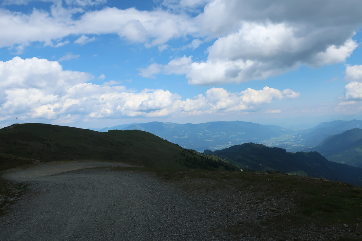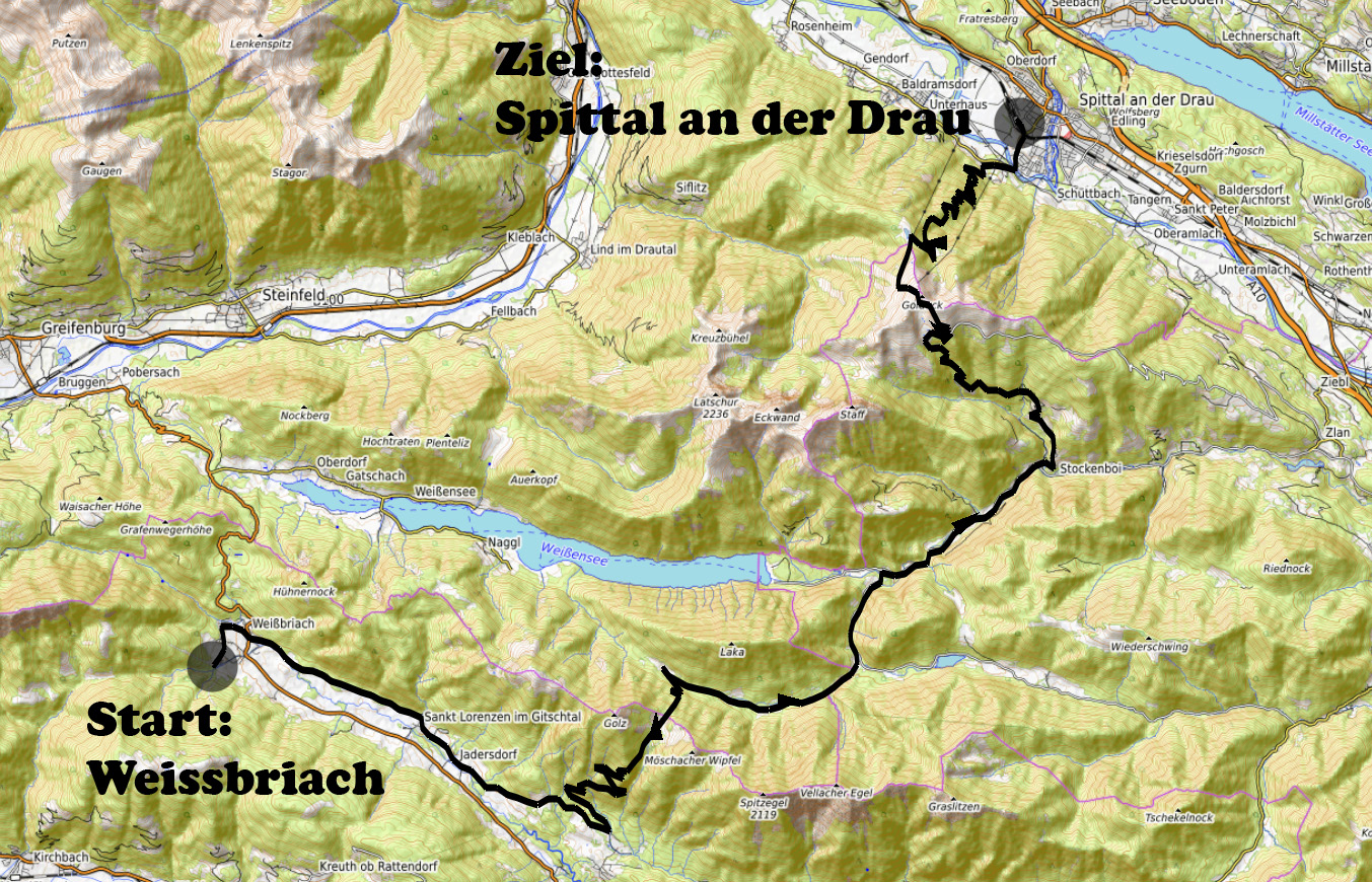 Heute Morgen schaffte ich es um 7.30Uhr ans Morgenessen. Etwa um 8.30Uhr startete ich dann. Im Talgrund oder am Rande davon ging es dann auf Pisten und Trails in Richtung Radnig bei Hermagor. Dort begann dann der Aufstieg zum Radniger Sattel. Ich kam in diesem Aufstieg flott voran und erreichte die Passhöhe auf 1558m wie kalkuliert um 11Uhr. Obwohl der Abstieg zur Hermagorer Bodenalm schon in der Karte mit einem Bikeverbot markiert war, konnte ich alles fahren. Auf der idyllischen Hermagorer Bodenalm kehrte ich dann ein. Danach folgte eine schöne offizielle Bikeroute nach Weissenbach. Auf diesem Abschnitt waren viele Radler unterwegs. Dann ging es auf der Strasse bis Stockenboi. Dort begann dann der Lange Aufstieg zum Goldeck auf 2100m. Bis auf 1250m gab es Asphalt und danach eine Forststrasse mit Bikeverbot bis zur Wieserhütte. In der Neuen Wieserhütte auf 1900m kehrte ich dann um 14Uhr für das Mittagessen ein. Während dem Essen hörte ich zufälligerweise noch einen Wetterbericht im laufenden Radio. Er war nicht gut für morgen und ein Blick ins Internet bestätigte dies....Da ich schon am ersten Tag dieser Tour, als es Nass war ordentlich Probleme mit der Kette hatte und zudem gestern auch noch merkte, dass es zwischen dem Tretlager und dem Carbonrahmen spiel hat, behielt ich mir die Option offen die Tour vorzeitig in Spittal an der Drau zu beenden. Nach dem Essen ging es um 14.30Uhr noch auf den Goldeck Gipfel auf 2100m. Dort radelte ich dann auf der direkten Naturstrasse hinunter nach Schwaig bei Spittal an der Drau. Diese Strecke war in der Kompass Karte als Bikeroute markiert, doch es hatte überall wieder Gatter und Bikeverbotsschilder. Ich Ignorierte jedoch alles. Auch unzählige andere Mountainbiker kamen mir hier entgegen. Um 15.37Uhr, 3 min bevor der Zug fuhr war ich dann am Bahnhof. Ich schaute nochmals schnell das Tretlager am Bike an und musste sage dass es wohl besser ist jetzt zu beenden bevor der Schaden irreparabel ist. Ohne Tickets stieg ich dann in den gerade einfahrenden Zug ein. Das Billet kaufte ich aber dann sogleich On Line.....