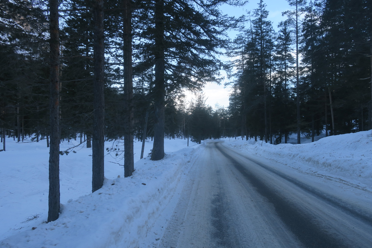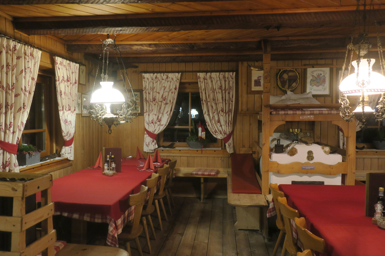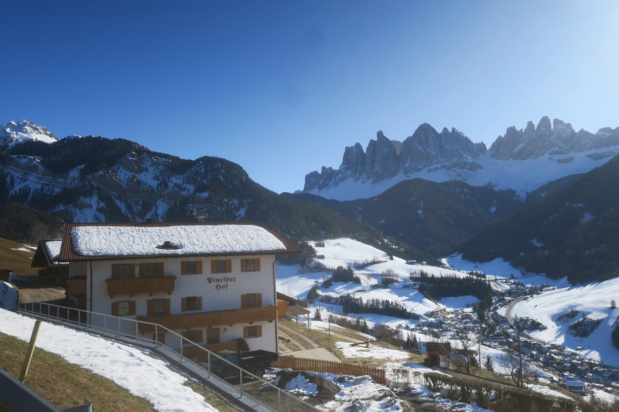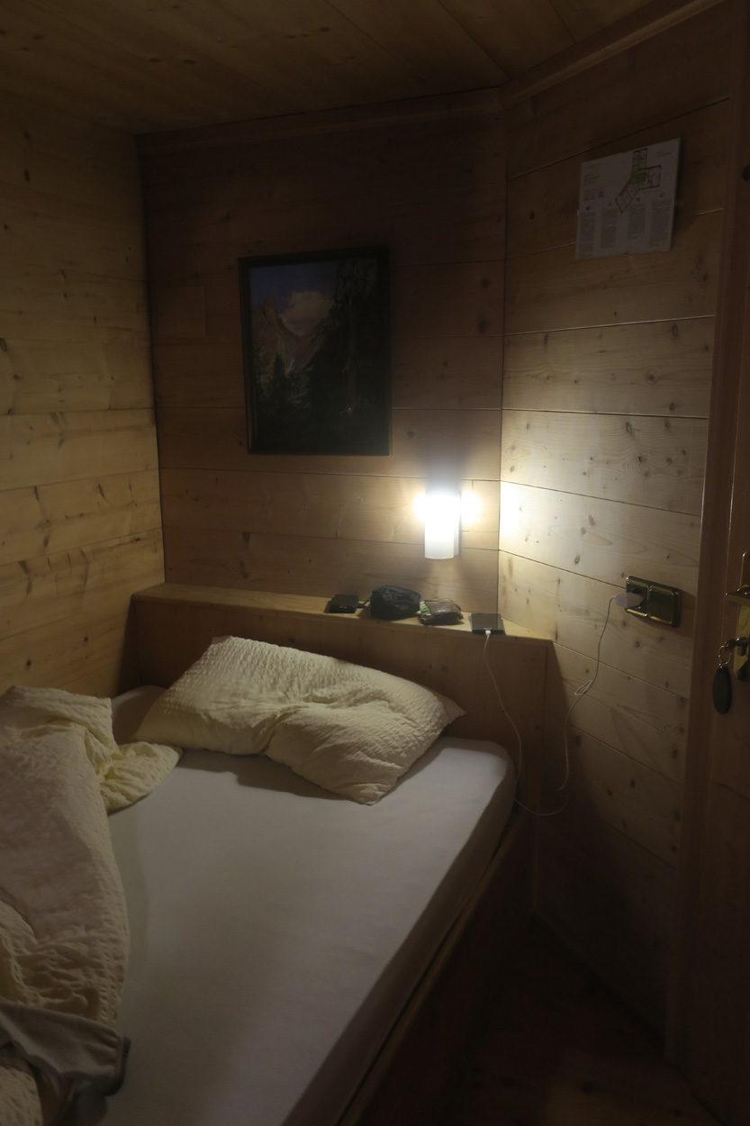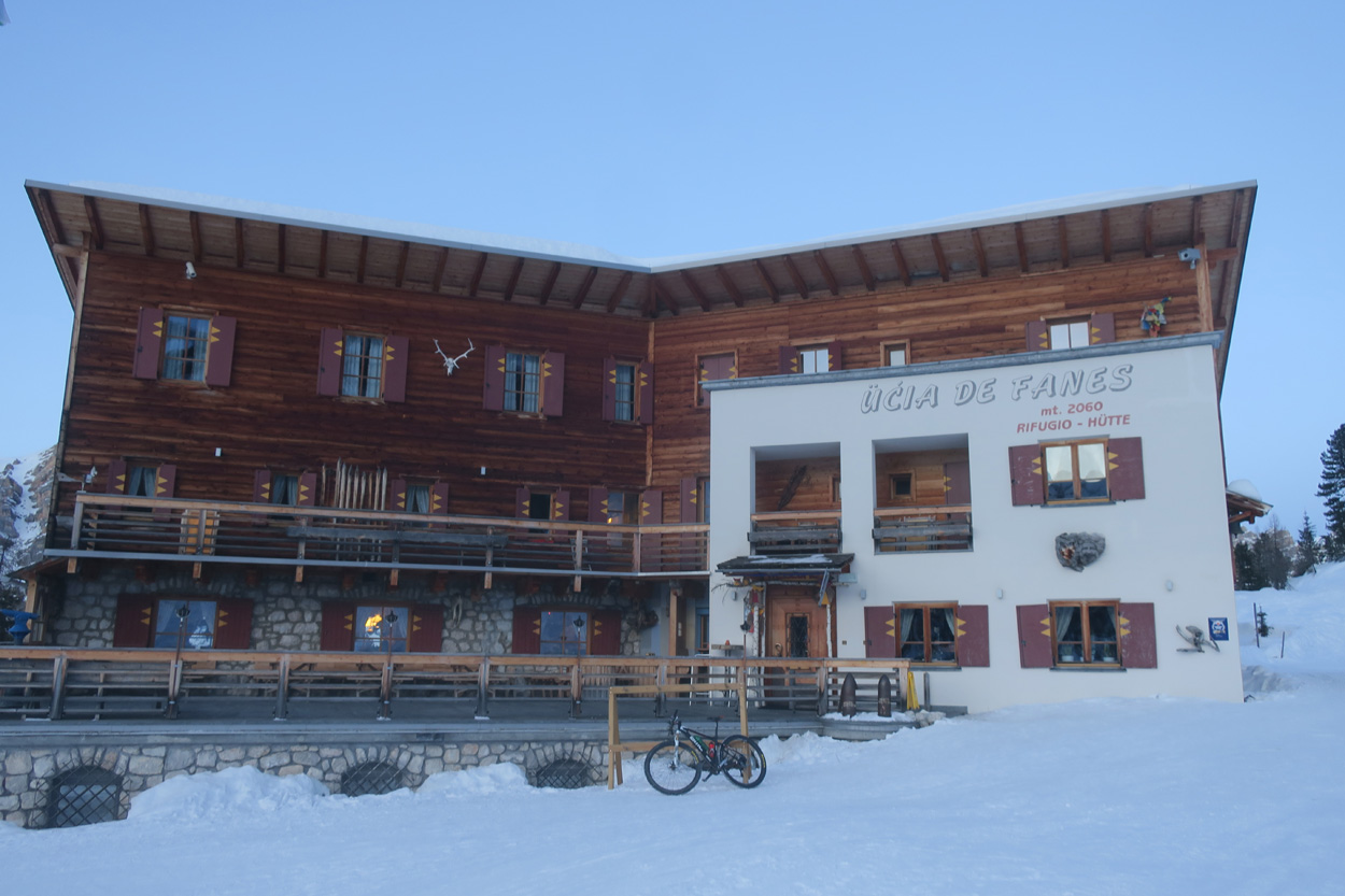Heute Morgen gab es um 7.30Uhr ein gutes Morgenessen. Um 8.30Uhr startete ich dann mit der Abfahrt nach Klausen. Etwa die Hälfte davon war auf dem Wanderweg. In Klausen kaufte ich dann noch Saft und begann danach mit dem Aufstieg in Richtung Fonteklaus. Leider war dann die Trailverbindung von Fonteklaus nach Gufidaun wegen Unwetterschäden gesperrt. Ich versuchte es trotzdem, musste aber dann ziemlich bald wegen umgestürzter Bäume wieder umkehren und nach Klausen hinunter zurückfahren. Insgesammt verlor ich hier fast eine Stunde. Danach ging ich dann auf Nummer sicher und nahm die Hauptstrasse bis zum Würzjoch. Die Hauptstrasse war bis zum Russiskreuz auf 1729m offen und geräumt. Die letzten 9Km bis zum Würzjoch gab es dann einen gepisteten Loipenwanderweg welcher bis auf die ersten 2 Kilometer, die etwas weicher waren, sehr gut fahrbar waren. Um Punkt 13Uhr erreichte ich dann das Würzjoch. Hier auf 2008m kehrte ich für 15min in den Alpengasthof ein. Da ich bei Klausen wegen dem gesperrten Weg Zeit verlor, verzichtete ich auf ein grosses Mittagessen und begnügte mich mit Kuchen und Alk. freiem Bier. Die ersten 2.6km der Abfahrt in Richtung Untermoi konnte ich auf einer Schlittebahn machen. Danach nahm ich die Strasse. Bei Untermoi fuhr ich dann das kleine Höhensträsschen nach Welschellen. Dort ging es dann hinunter nach Zwischenwasser. Im sehr kalten Talgrund nahm ich dann die Hauptstrasse nach St. Vigil. Ab St. Vigill fuhr ich dann etwa zur Hälfte auf der salzschneebedeckten Strasse und auf der hartgepressten Loipe zum Rifugio Pederü. Dort auf 1548m war ich dann kurz vor 16Uhr. Nun folgten noch die letzten 500Höhenmeter auf der gut gepisteten Schlittelpiste hinauf zur Faneshütte. Genau bei Sonnenuntergang um 17Uhr hatte ich dann die Hütte erreicht. In diesem Schnee Aufstieg konnte ich alles fahren. In der Hütte bekam ich ein kleines Einzelzimmer und konnte dann um 18.30Uhr im schönen Speisesaal das Abendmenü geniessen. Da diese Hütte mitten in der Dolomitenwildniss liegt gibt es hier kein Händyempfang und das WLAN verträgt wohl nur ein Gerät aufs mal....