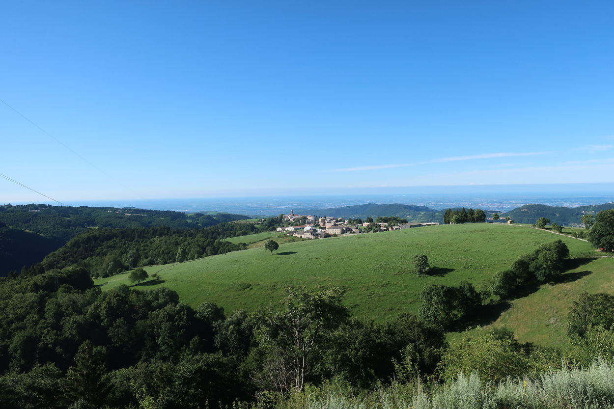 Blick zurück auf Erbezzo mit der Po Ebene im Hintergrund