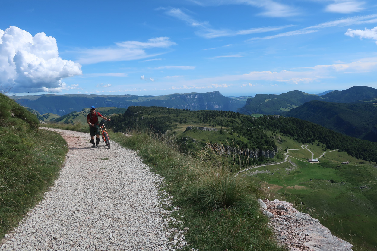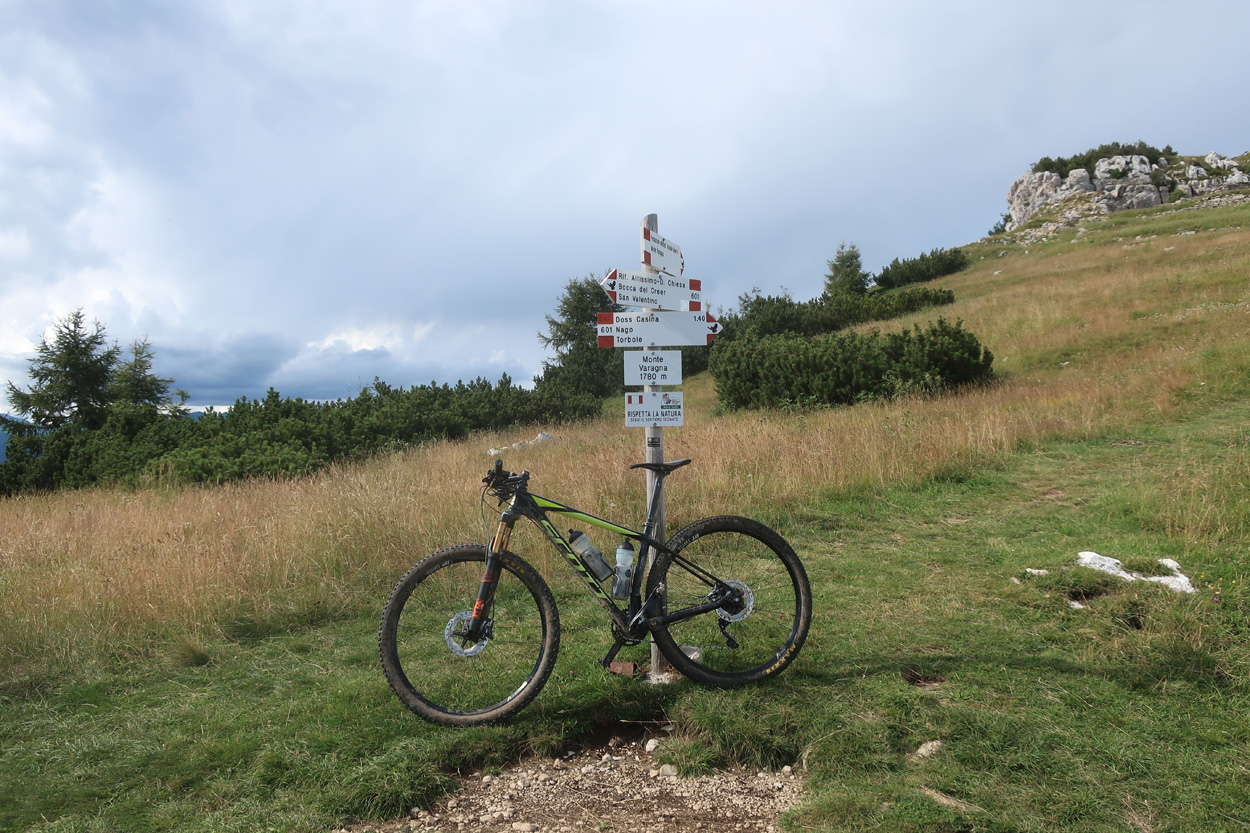 Heute Morgen gab es um 7.30Uhr ein sehr gutes Frühstück. Um 8.45 startete ich dann zur Monte Lessini Hochebene in Richtung Rifugio Castelberto. Dort war ich dann etwa um 10 Uhr. Danach ging es auf der Naturstrasse durch die Hochebene weiter bis zur Bocca Gaiba. Dort begann dann der Abstieg auf dem 110Trail ins Val di Ronchi. Dieser Trail war mehrheitlich fahrbar, es gab jedoch immer wieder ein Paar kleine Stellen wo die Weg Qualität zu schlecht war um zu fahren. Danach ging es talauswärts nach Ala. Dort folgten dann ca. 6km auf dem Radweg der Etsch entlang abwärts. Dabei ist mir noch aufgefallen, dass der Etsch gröber Hochwasser hatte. In Avio begann dann der knapp 2000hm umfassende Aufstieg zum Monte Altissimo di Nago. Um 16Uhr hatte ich dann den Gipfel mit dem Rifugio Damiano Chiesa erreicht. Hier kehrte ich dann noch kurz ein. Danach ging es auf der direktesten Route hinunter nach Nago, wo ich um 17.30Uhr ankam. In Nago kaufte ich dann noch Treibstoff für die nächsten 800Höhenmeter hinauf nach Ronzo Chienis. Leider wurde ich dann 15min vor dem erreichen des Tageszieles noch grober verregnet..... Auch hier gabe es ein sehr gutes Pizzeria Restaurant im Hotel.