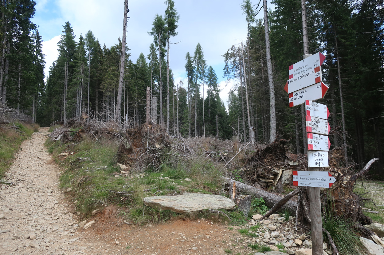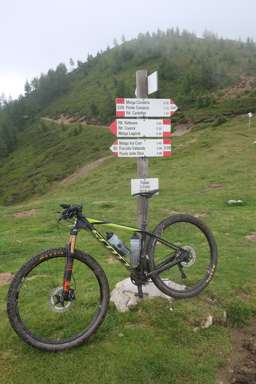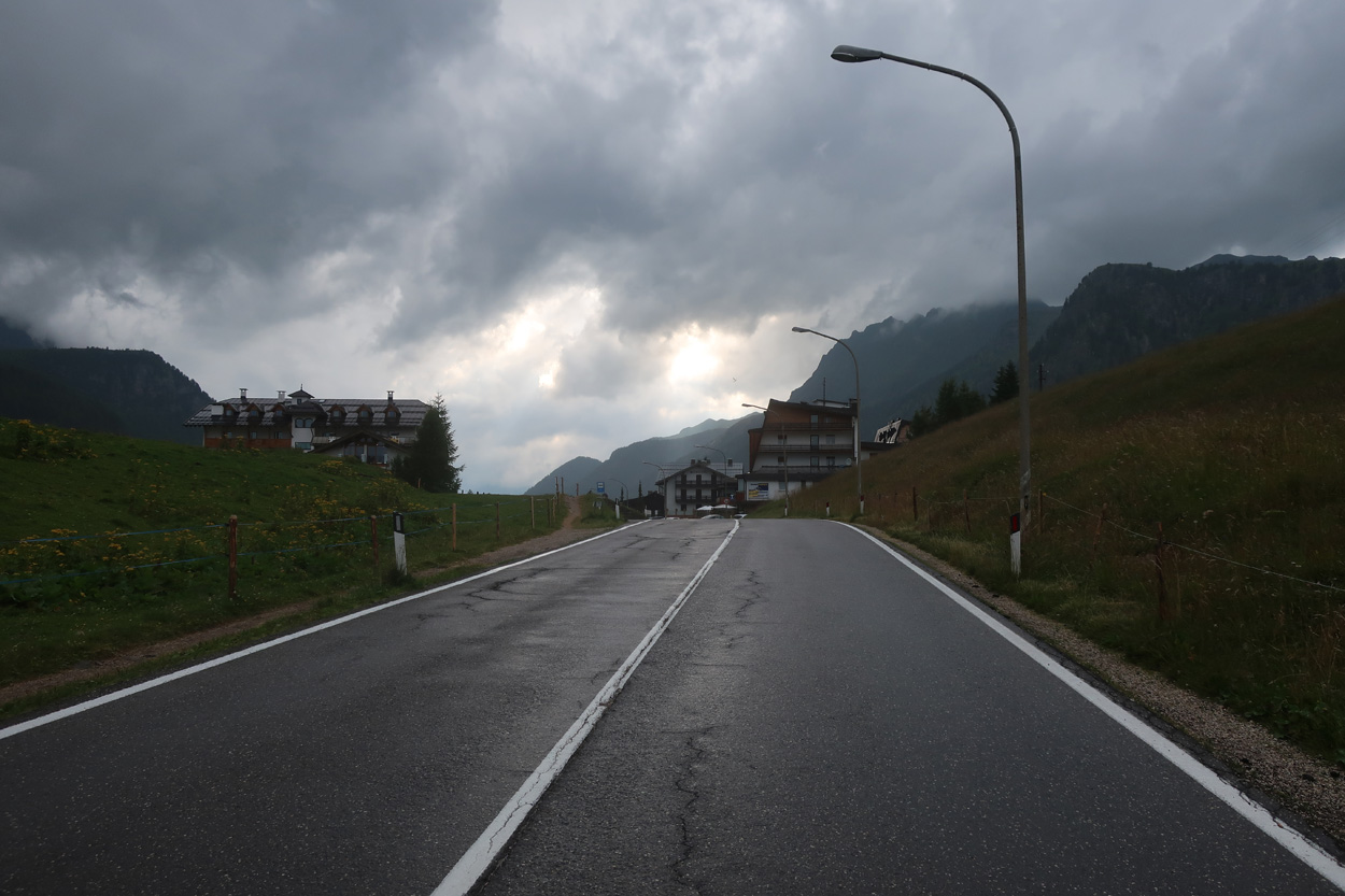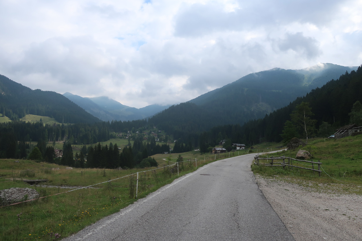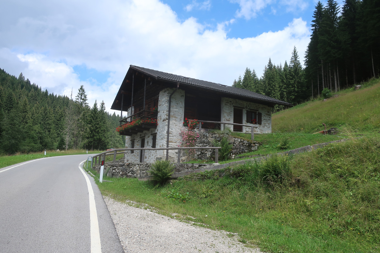 Heute Morgen gab es um 7.30Uhr ein Frühstücksbüffet das keine Wünsche offen liess. Um 8.45Uhr war ich dann startbereit. Nach 300hm Abfahrt begann dann der Aufstieg durchs Val Campelle zum Passo Cinque Croci. Um 11Uhr hatte ich dann die Passhöhe auf 2018m erreicht. Danach ging es auf der Naturstrasse bis Capriolo. Unterwegs konnte man überall noch die Sturmschäden vom Herbst 2018 im Wald sehen. Kurz vor 12Uhr kaufte ich dann im Dorfladen von Caoria noch Proviant. Danach radelte ich noch talauswärts bis anfangs Canal San Bolvo. Dort folgte dann der Aufstieg in Richtung Lago di Calaita wo ich um 13.50Uhr ankam. Leider waren im Restaurant am See sehr viele Leute so dass ich dort auf eine Einkehr verzichtete. Über den Kopfsteinweg ging es dann zur Forcella Calaita. Dort folgte dann ein schöner Höhenweg nach San Martino di Castrozza. Leider sah ich dann in dieser Touristenhochburg nicht grad ein Lebensmittelladen an meiner Route. Trotzdem radelte ich dann in Richtung Passo Rolle weiter. Bis fast zur Passhöhe gab es abseits der Hauptstrasse einen neuen Bikeweg. Kurz nach der Passhöhe kehrte ich dann in der Malga Iuribello ein. Danach ging es teilweise auf Trails hinunter zur Piano del Cason. Hier unten auf 1700m begann es dann zu Regnen. Trotzdem machte ich mich dann auf den Weg zum Passo di Valles. Um 17Uhr erreichte ich dann die Passhöhe auf 2031m. Da der Regen wieder nachliess, entschied ich mich hier noch über die Forcella die Pradazzo zum Passo di San Pellegrino zu fahren. Im Abschnitt von der Forcella di Pradazzo und dem Col ca Viette musste ich dann noch etwa 10 bis 15min auf einer etwas verblockten Wiese laufe. Nach einer teilweise steilen Skipistenabfahrt erreichte ich dann um 18.30Uhr den Passo San Pellegrino. Hier gab es etliche Hotels. Nach 3 verschiedenen Anfragen entschied ich mich dann für das Hotel Cristallo direkt auf der Passhöhe. Hier konnte ich dann auch ein gutes Abendessen genießen