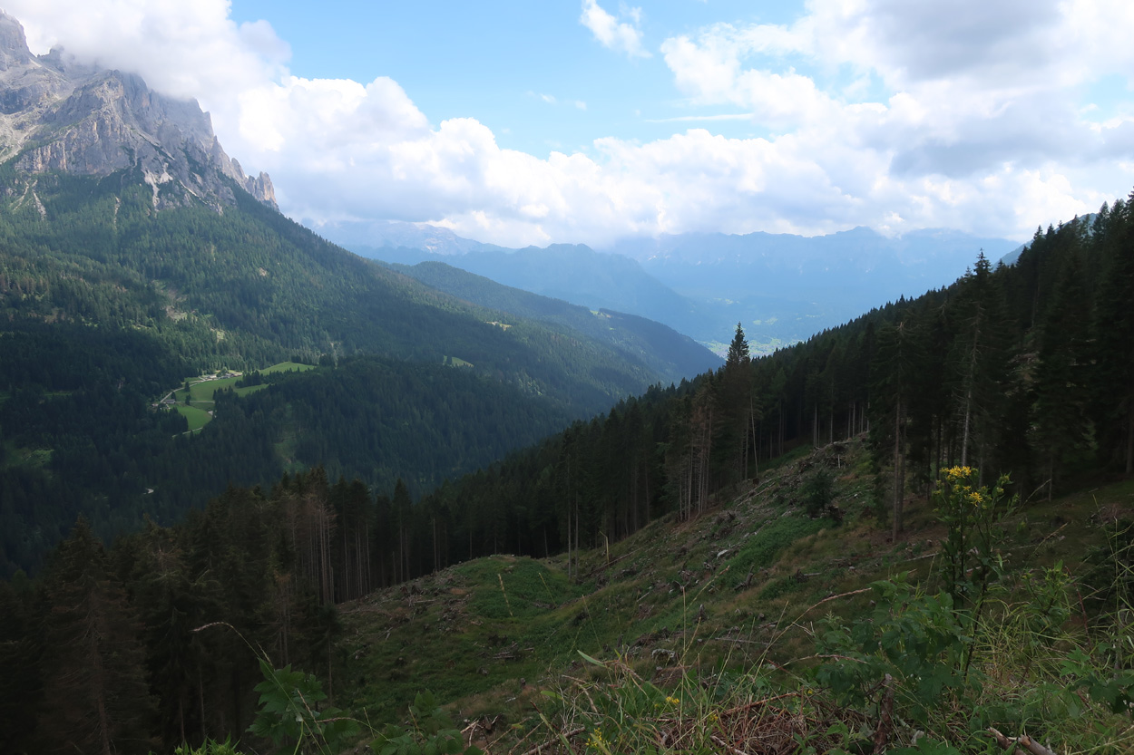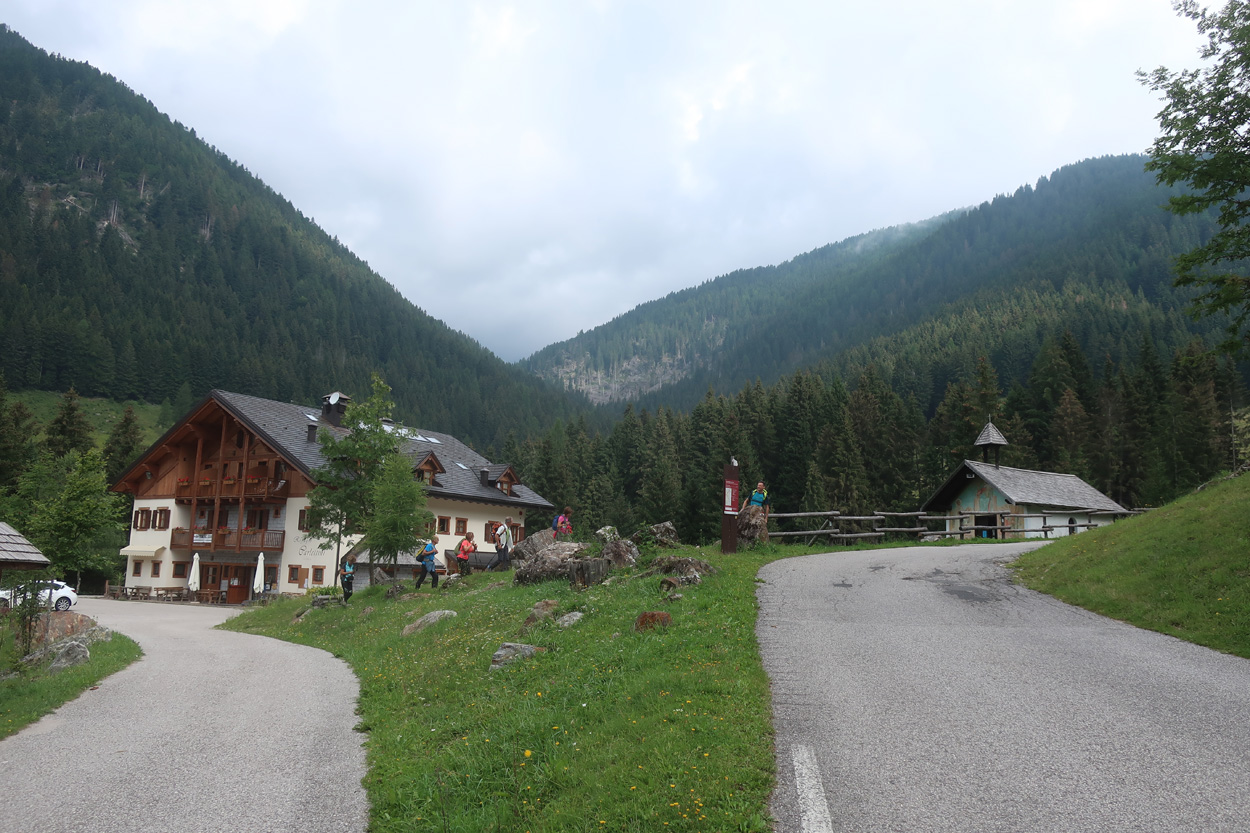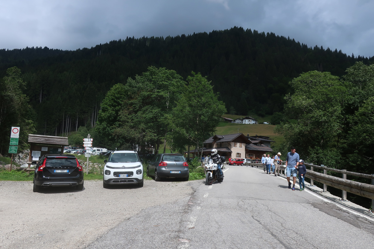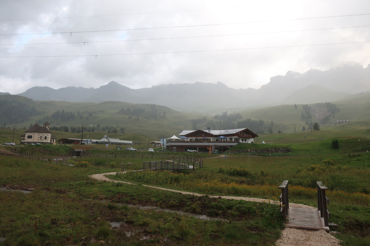 Heute Morgen gab es um 7.30Uhr ein Frühstücksbüffet das keine Wünsche offen liess. Um 8.45Uhr war ich dann startbereit. Nach 300hm Abfahrt begann dann der Aufstieg durchs Val Campelle zum Passo Cinque Croci. Um 11Uhr hatte ich dann die Passhöhe auf 2018m erreicht. Danach ging es auf der Naturstrasse bis Capriolo. Unterwegs konnte man überall noch die Sturmschäden vom Herbst 2018 im Wald sehen. Kurz vor 12Uhr kaufte ich dann im Dorfladen von Caoria noch Proviant. Danach radelte ich noch talauswärts bis anfangs Canal San Bolvo. Dort folgte dann der Aufstieg in Richtung Lago di Calaita wo ich um 13.50Uhr ankam. Leider waren im Restaurant am See sehr viele Leute so dass ich dort auf eine Einkehr verzichtete. Über den Kopfsteinweg ging es dann zur Forcella Calaita. Dort folgte dann ein schöner Höhenweg nach San Martino di Castrozza. Leider sah ich dann in dieser Touristenhochburg nicht grad ein Lebensmittelladen an meiner Route. Trotzdem radelte ich dann in Richtung Passo Rolle weiter. Bis fast zur Passhöhe gab es abseits der Hauptstrasse einen neuen Bikeweg. Kurz nach der Passhöhe kehrte ich dann in der Malga Iuribello ein. Danach ging es teilweise auf Trails hinunter zur Piano del Cason. Hier unten auf 1700m begann es dann zu Regnen. Trotzdem machte ich mich dann auf den Weg zum Passo di Valles. Um 17Uhr erreichte ich dann die Passhöhe auf 2031m. Da der Regen wieder nachliess, entschied ich mich hier noch über die Forcella die Pradazzo zum Passo di San Pellegrino zu fahren. Im Abschnitt von der Forcella di Pradazzo und dem Col ca Viette musste ich dann noch etwa 10 bis 15min auf einer etwas verblockten Wiese laufe. Nach einer teilweise steilen Skipistenabfahrt erreichte ich dann um 18.30Uhr den Passo San Pellegrino. Hier gab es etliche Hotels. Nach 3 verschiedenen Anfragen entschied ich mich dann für das Hotel Cristallo direkt auf der Passhöhe. Hier konnte ich dann auch ein gutes Abendessen genießen