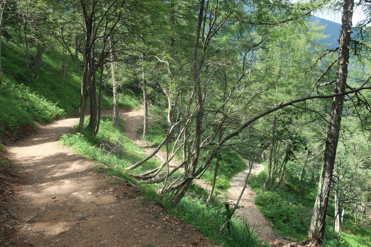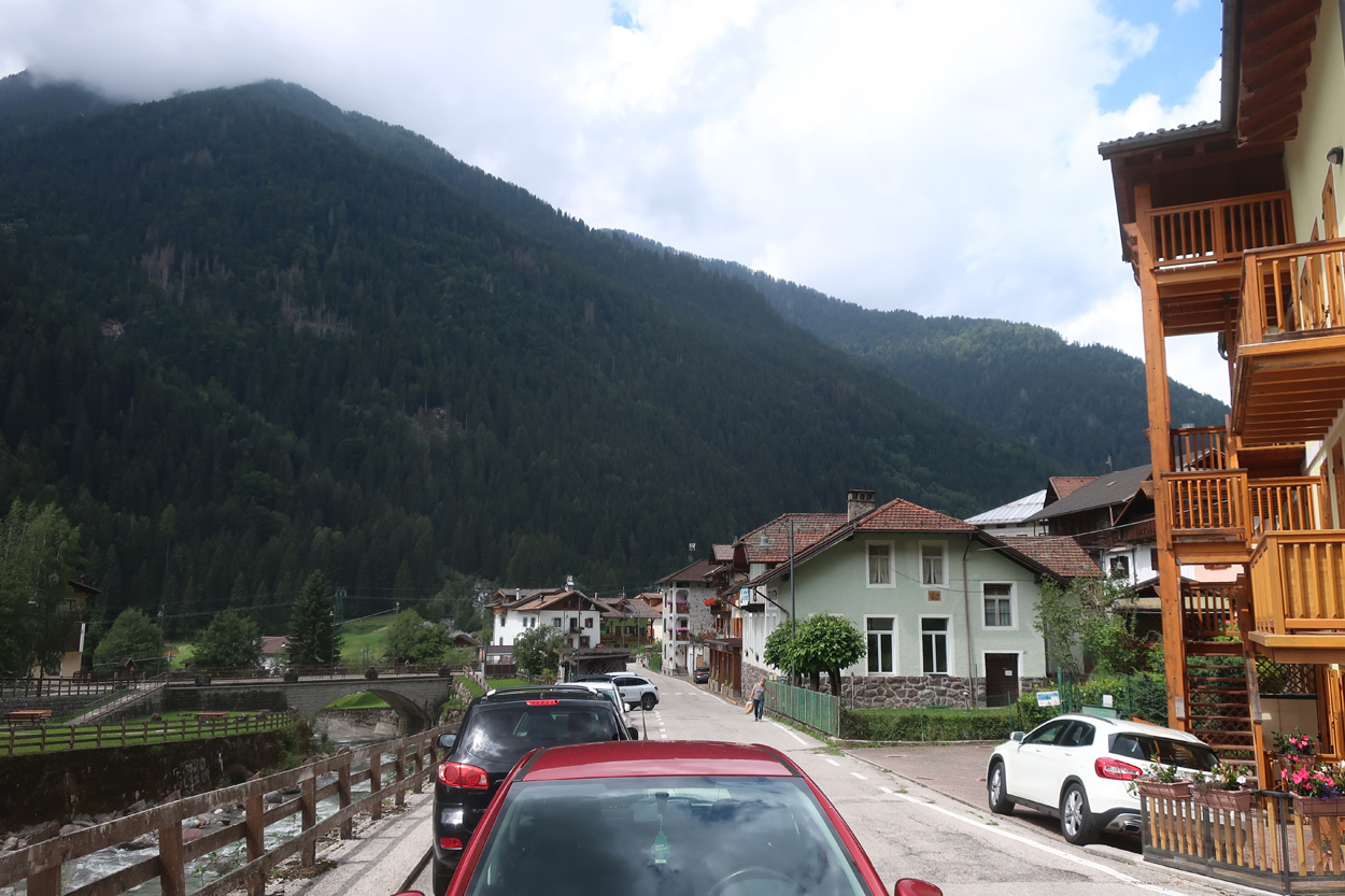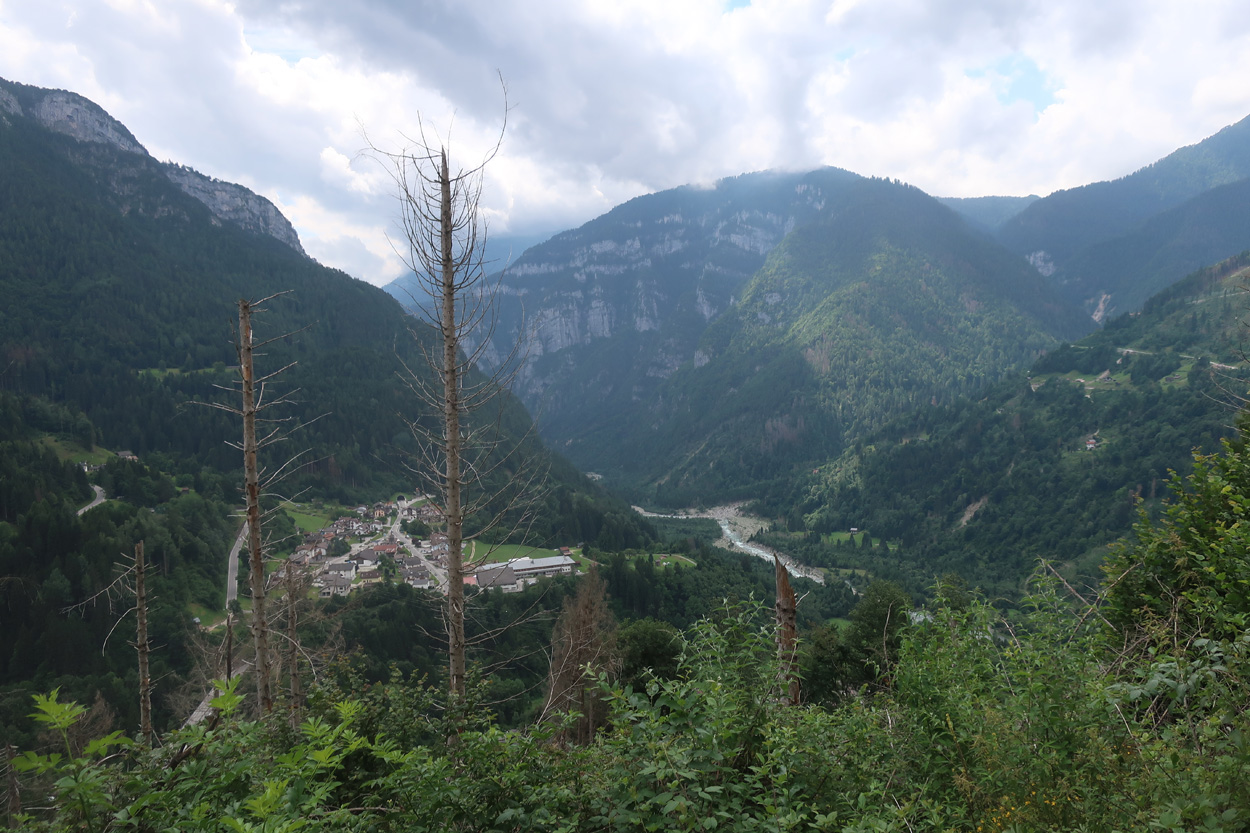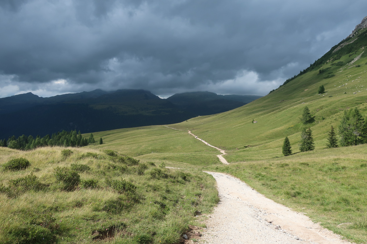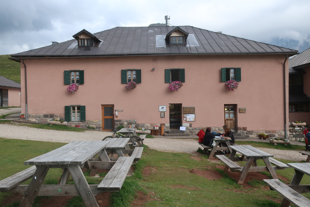 Heute Morgen gab es um 7.30Uhr ein Frühstücksbüffet das keine Wünsche offen liess. Um 8.45Uhr war ich dann startbereit. Nach 300hm Abfahrt begann dann der Aufstieg durchs Val Campelle zum Passo Cinque Croci. Um 11Uhr hatte ich dann die Passhöhe auf 2018m erreicht. Danach ging es auf der Naturstrasse bis Capriolo. Unterwegs konnte man überall noch die Sturmschäden vom Herbst 2018 im Wald sehen. Kurz vor 12Uhr kaufte ich dann im Dorfladen von Caoria noch Proviant. Danach radelte ich noch talauswärts bis anfangs Canal San Bolvo. Dort folgte dann der Aufstieg in Richtung Lago di Calaita wo ich um 13.50Uhr ankam. Leider waren im Restaurant am See sehr viele Leute so dass ich dort auf eine Einkehr verzichtete. Über den Kopfsteinweg ging es dann zur Forcella Calaita. Dort folgte dann ein schöner Höhenweg nach San Martino di Castrozza. Leider sah ich dann in dieser Touristenhochburg nicht grad ein Lebensmittelladen an meiner Route. Trotzdem radelte ich dann in Richtung Passo Rolle weiter. Bis fast zur Passhöhe gab es abseits der Hauptstrasse einen neuen Bikeweg. Kurz nach der Passhöhe kehrte ich dann in der Malga Iuribello ein. Danach ging es teilweise auf Trails hinunter zur Piano del Cason. Hier unten auf 1700m begann es dann zu Regnen. Trotzdem machte ich mich dann auf den Weg zum Passo di Valles. Um 17Uhr erreichte ich dann die Passhöhe auf 2031m. Da der Regen wieder nachliess, entschied ich mich hier noch über die Forcella die Pradazzo zum Passo di San Pellegrino zu fahren. Im Abschnitt von der Forcella di Pradazzo und dem Col ca Viette musste ich dann noch etwa 10 bis 15min auf einer etwas verblockten Wiese laufe. Nach einer teilweise steilen Skipistenabfahrt erreichte ich dann um 18.30Uhr den Passo San Pellegrino. Hier gab es etliche Hotels. Nach 3 verschiedenen Anfragen entschied ich mich dann für das Hotel Cristallo direkt auf der Passhöhe. Hier konnte ich dann auch ein gutes Abendessen genießen