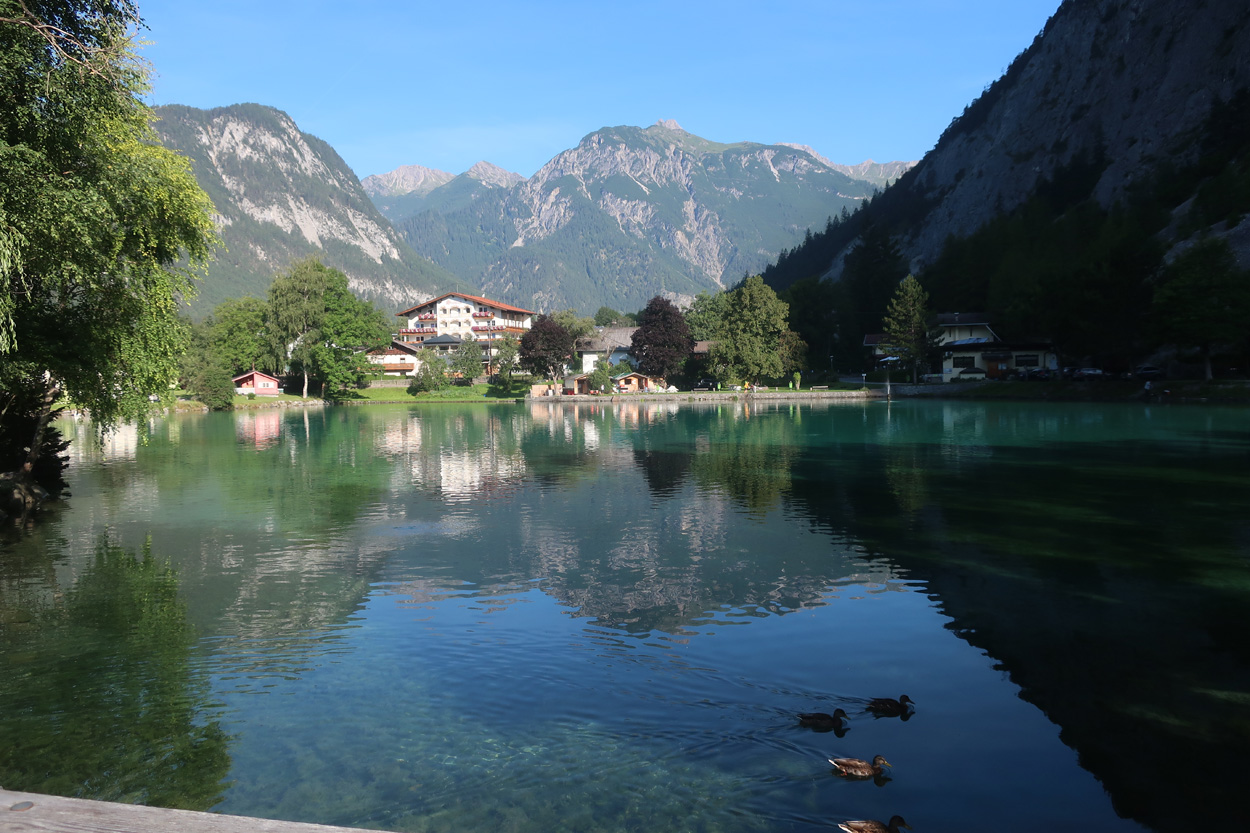 kurz nach dem Start am Nassereithersee mit dem Hotel hinter dem See wo ich