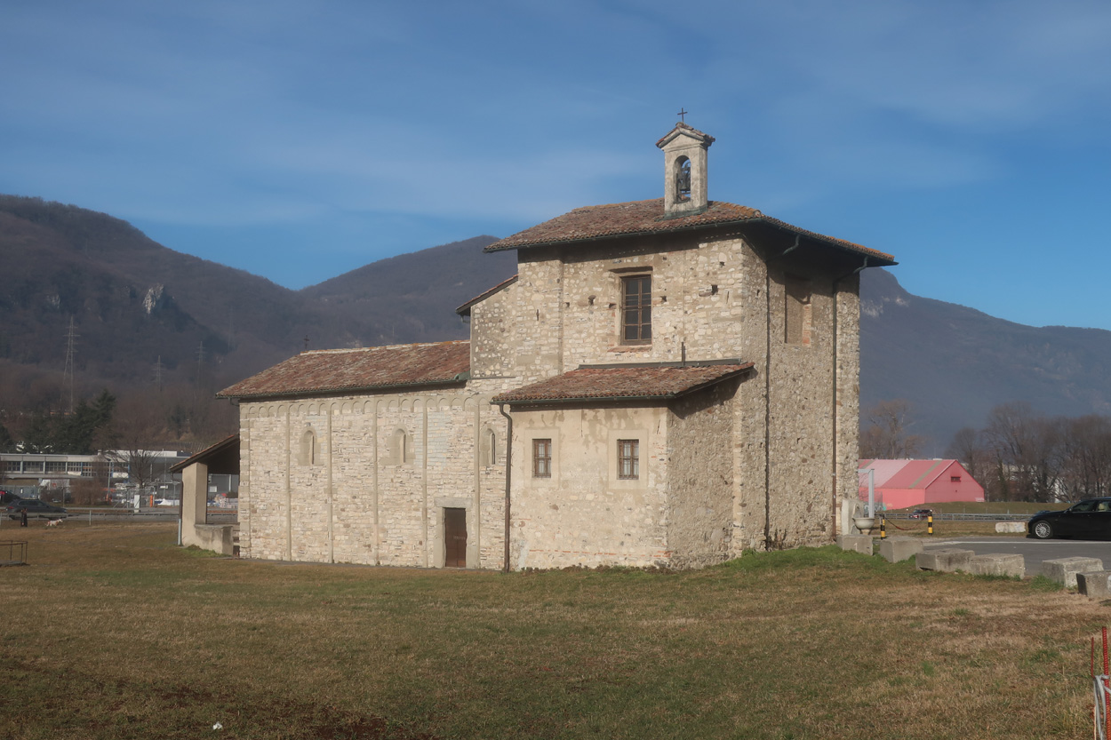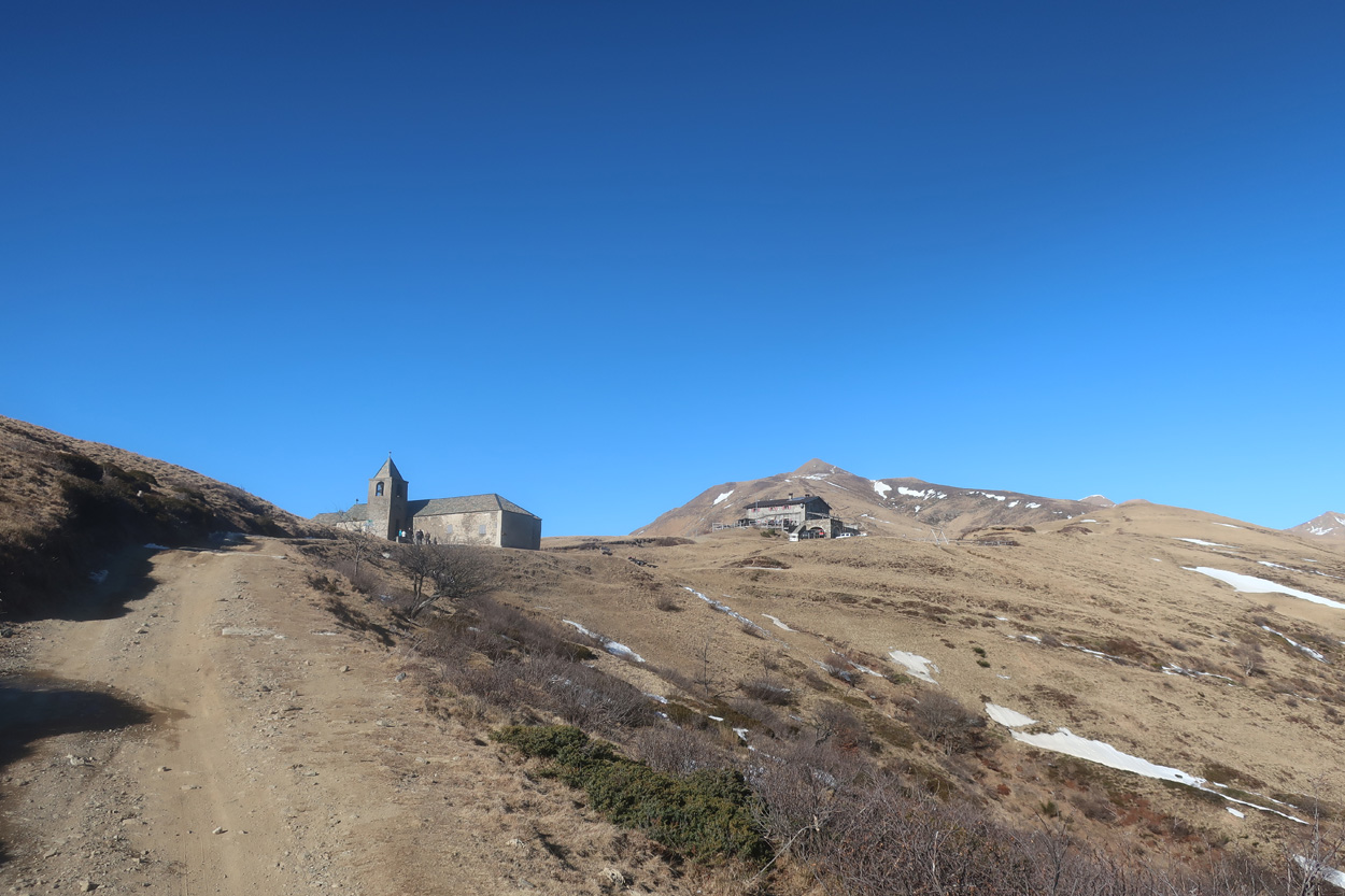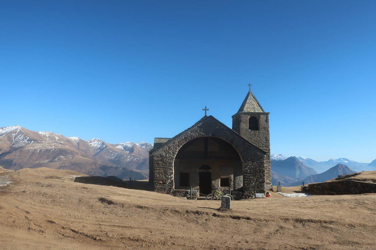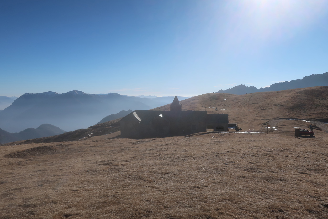 Kapelle auf dem Passo di San Lucio, mit Italien im Hintergrund