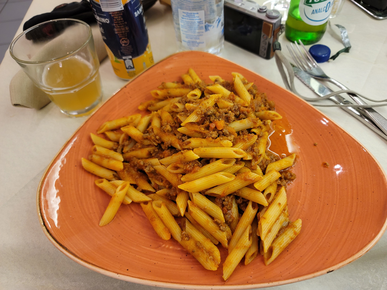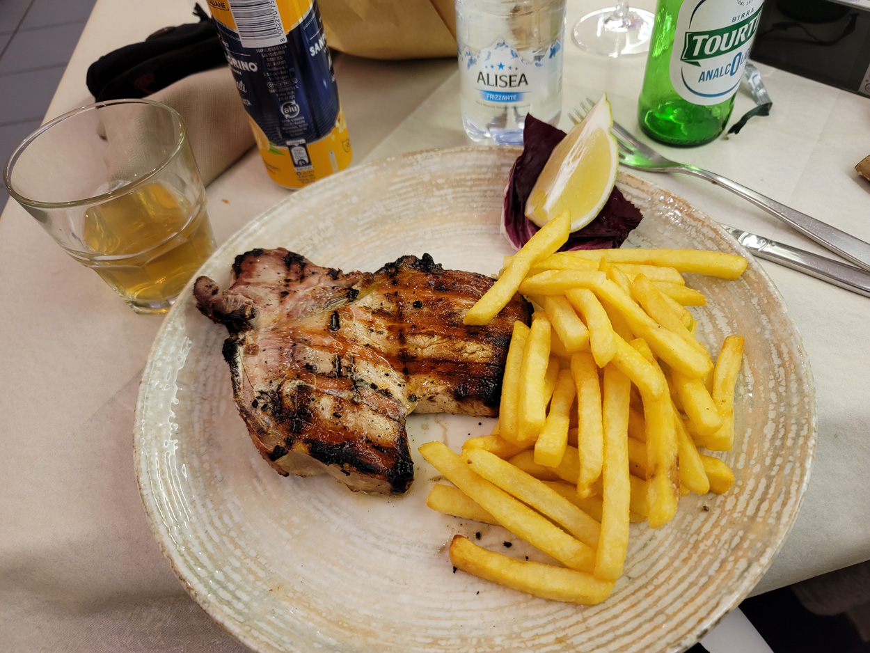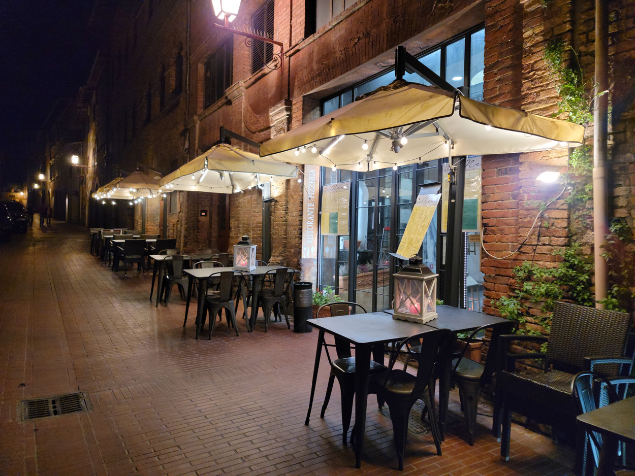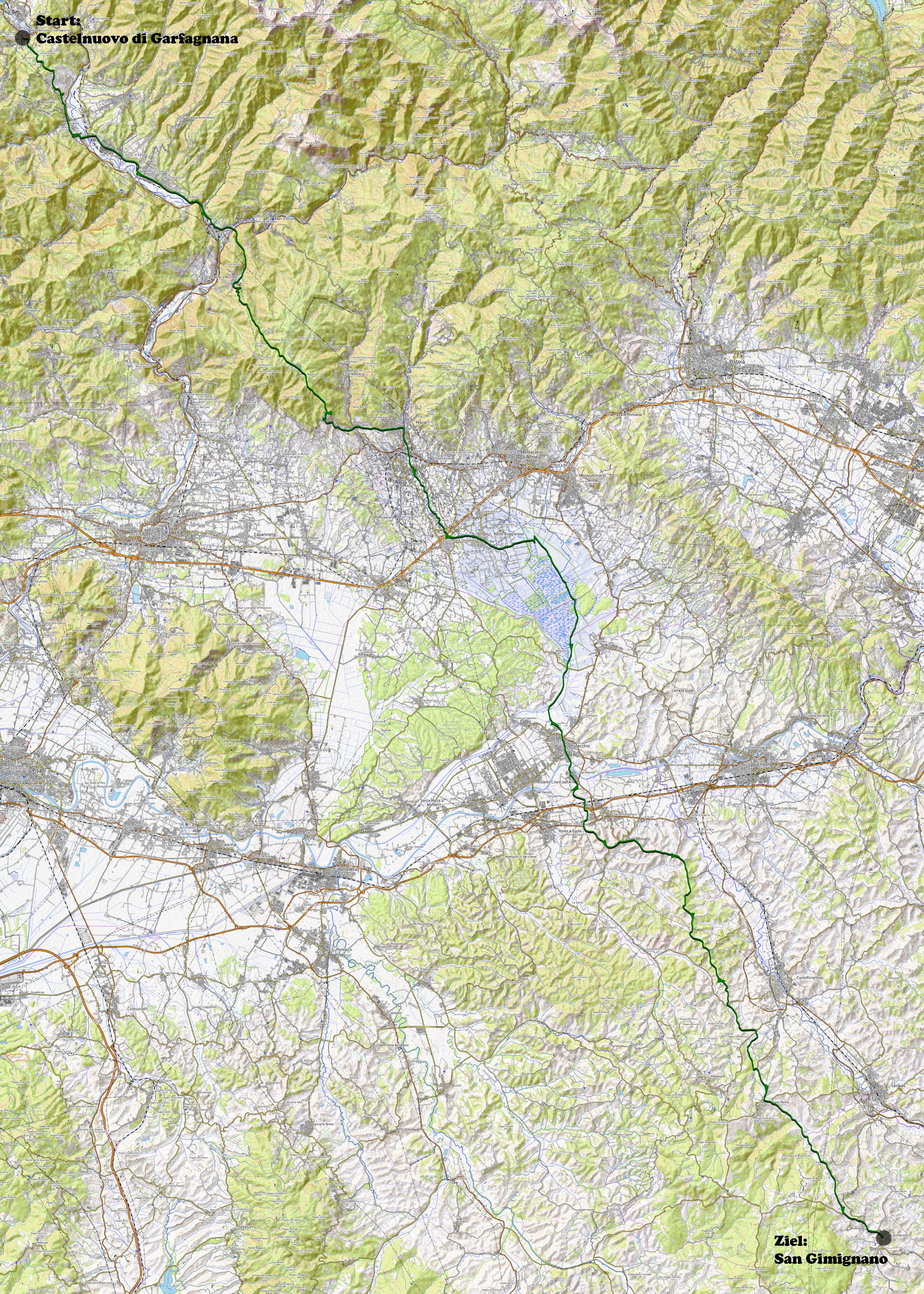Heute Morgen gab es um 7Uhr ein einfaches Morgenessen. Etwa um 8Uhr startete ich dann. Zuerst ging es etwa 200hm hinauf nach Monteperpoli um nicht auf der Transitstrasse fahren zu müssen. Dort fuhr ich dann hinunter nach Gallicano. Hier wechselte ich dann auf die andere Seite des Flusses Serchio. Auf einer ordentlich von stinkigen Autos befahrenen Straße ging es dann im Dunst nach Fornoli. Dort begann dann der Aufstieg praktisch ohne Verkehr zum Bergdorf Corsagna. Dort kaufte ich dann noch kurz Saft. Danach ging es weiter auf Trails und Naturstrassen zur Waldsiedlung Pizzone auf 900m ü M. Hier ging es dann zuerst auf einer ausgewaschenen Piste und dann auf einer schönen Naturstrasse hinunter nach Petrognana. Hier ging es dann meist auf wunderschönen Wanderwegen durch die Olivenplantagen bis zur Ortschaft Pescia. Dort radelte ich dann auf dem Damm des Bewässerungskanales in Richtung Naturschutzgebiet Padule di Fucechio. In diesem Feuchtgebiet war ich dann kaum mehr als 10m übef der Meereshöhe. Hier ass ich dann um 13.30 Uhr noch ein Stück Pizza welches ich heute Vormittag gekauft hatte. Nach dem Naturschutzgebiet folgte ich dann bei der Ortschaft Fucecchio dem Franziskus Pilgerweg hinauf nach San Miniato. Dort kehrte ich dann um 14.30Uhr noch kurz in einer Bar ein. Danach folgte ich dann weiter dem Franzikus Pilgerweg bis San Gimignano. Der Pilgerweg war auch als Bikeroute markiert. Er führte fast ausschließlich über schöne Naturstrassen. Leider brach dann noch irgendwo mein zweiter Bidonhalter, so dass ich meine gefüllte Trinkflasche verlor. Bei Einbruch der Dunkelheit erreichte ich dann um 17.30Uhr das wunderschöne Städtchen San Gimignano. Hier nahm ich dann das Hotel Leon Bianco mitten im Zentrum. Zum Abendessen ging es dann in ein Restaurant in der Altstadt.