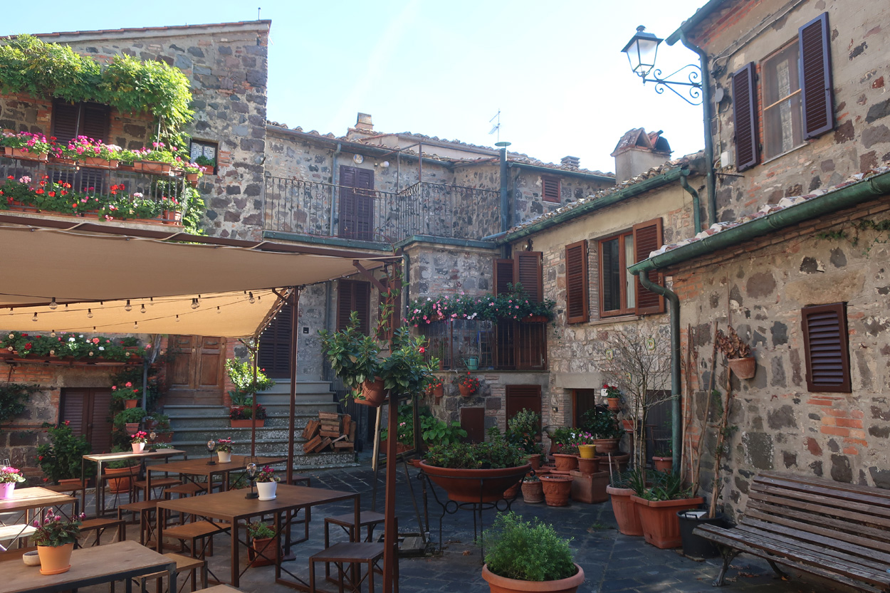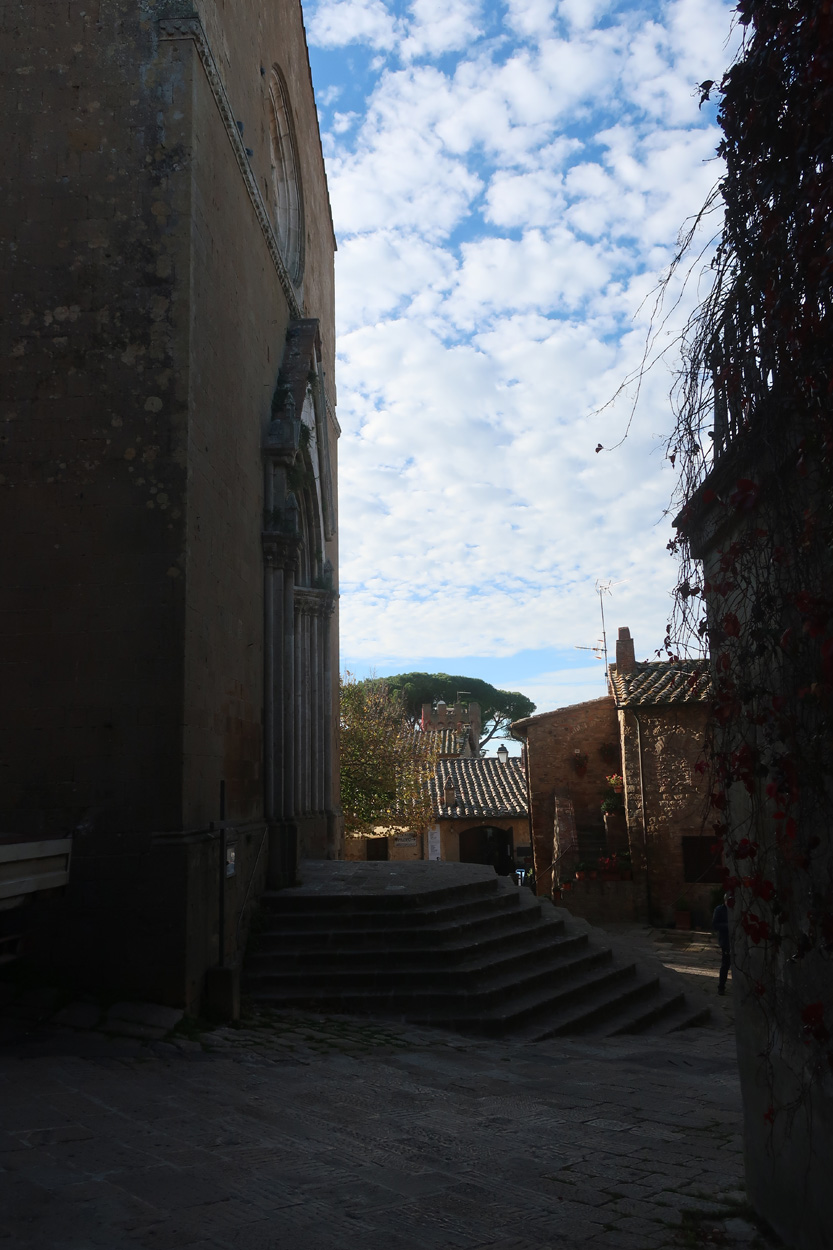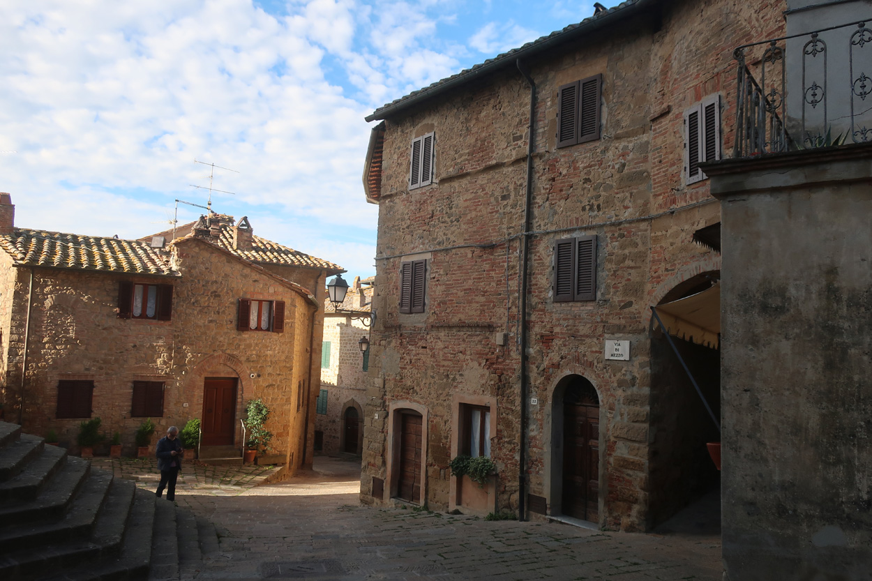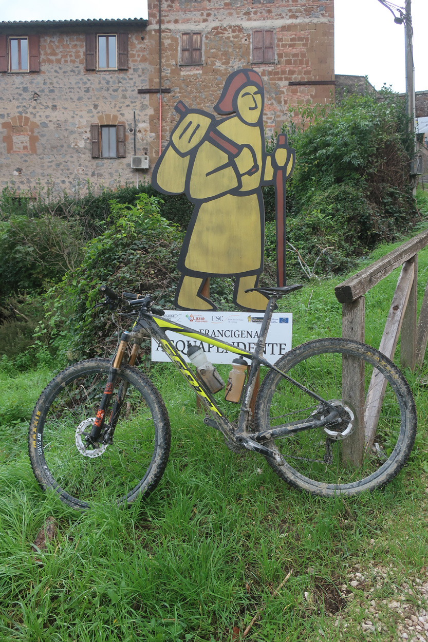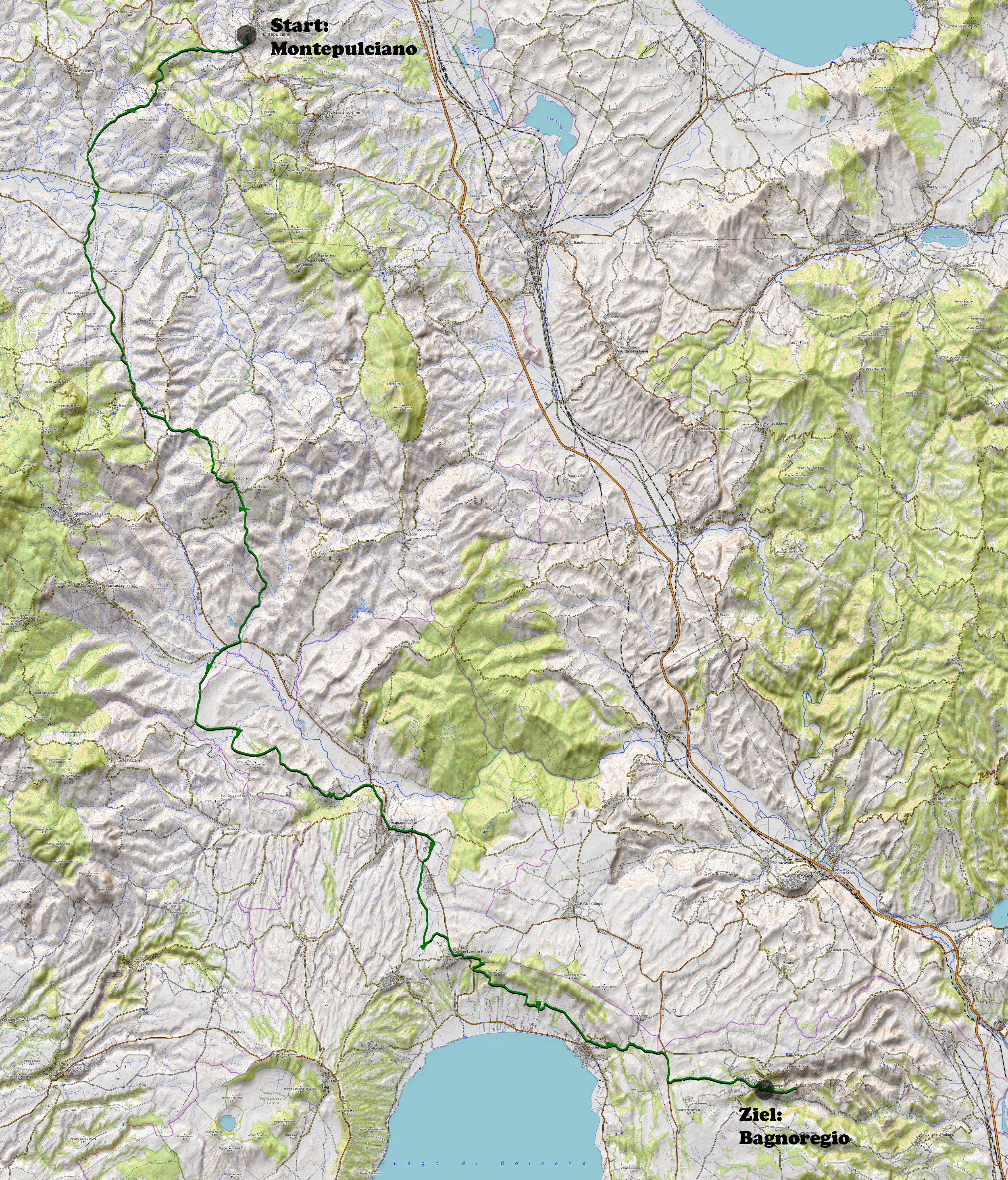 Heute Morgen gab es um 7.45Uhr ein sehr gutes Morgenessen, obwohl das Hotel nicht so toll bewertet war. Etwa um 8.30Uhr startete ich dann. Nach kurzer Zeit auf der Hauptstraße folgte dann eine Piste und danach ein Wanderweg zur sehr sehenswerten Ortschaft Montichiello zuoberst auf einem Hügel. Danach traf ich dann bald einmal auf die Via Francigena, dem Rom Pilgerweg. Diesem folgte ich dann etwa für die nächsten 70km. Er diente auch als Bikeroute. Unterwegs machte ich dann in der sehr schönen Ortschaft Radicofani noch Mitagspause bei einem kleinen Laden. Etwa um 15.45Uhr verließ ich dann bei Bolsena die Pilgerroute und fuhr nach Bagnoregio weiter. Hier kam ich dann um 16.30Uhr an. Nach einem kurzen Einkauf in einem Alimentari machte ich mich dann auf den Weg zur Civita, dem historischen Ortsteil welcher auf einem Sandsteinfelsen lag und das Touristische Highlight der Region darstellt. Hierfür musste ich noch die Mautstelle passieren. Der Eintritt hätte 5€ gekostet und Velos wären verboten gewesen. Dem Mann an der Mautstelle sagte ich dann, dass ich dort oben übernachten möchte. Darum liess er mich dann fahrend und ohne Maut das große Viadukt zur Civita passieren. Oben angekommen musste ich dann feststellen dass die Restaurants gerade am Feierabend machen waren. Ein Zimmer hätte ich in diesem wunderbaren Örtchen zwar bekomme, aber leider nichts zu Essen. Daher zog ich es vor, wieder hinunter nach Bagnoregio zu fahren. Dort bekam ich dann ein sehr schönes Appartement in der Nähe eines guten Restaurants.