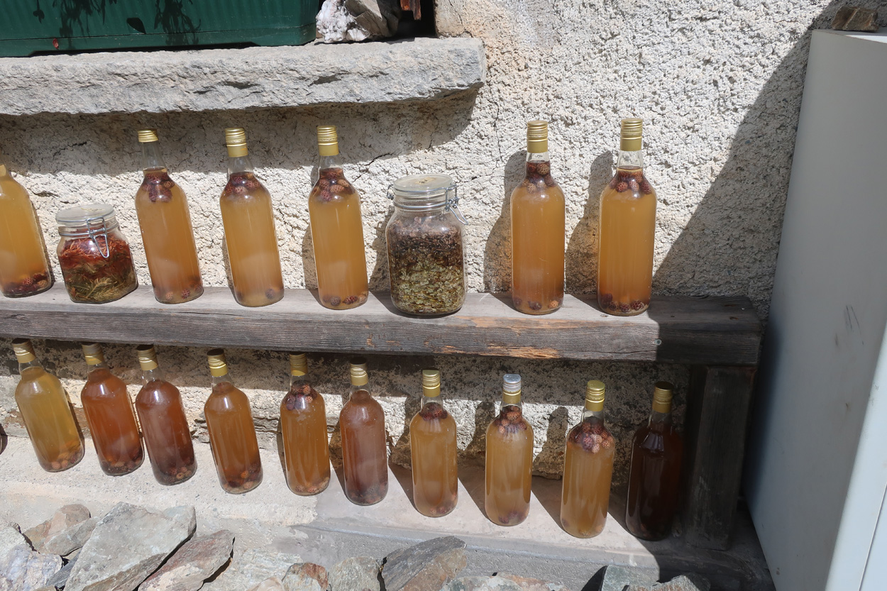 Grappa Flaschen am der Aussenwand des Gasthauses