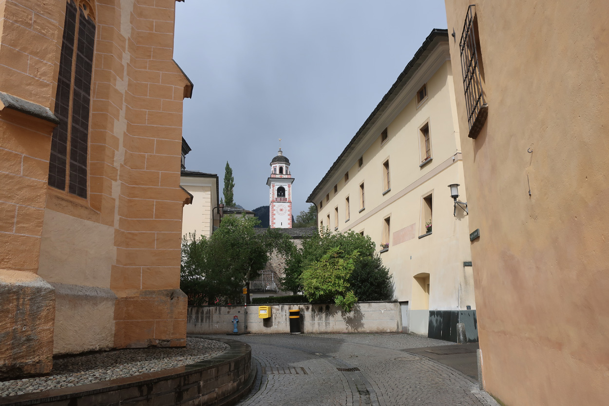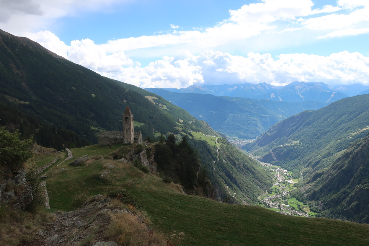 Blick zurück zum Gasthaus und auf die Kapelle San Romerio