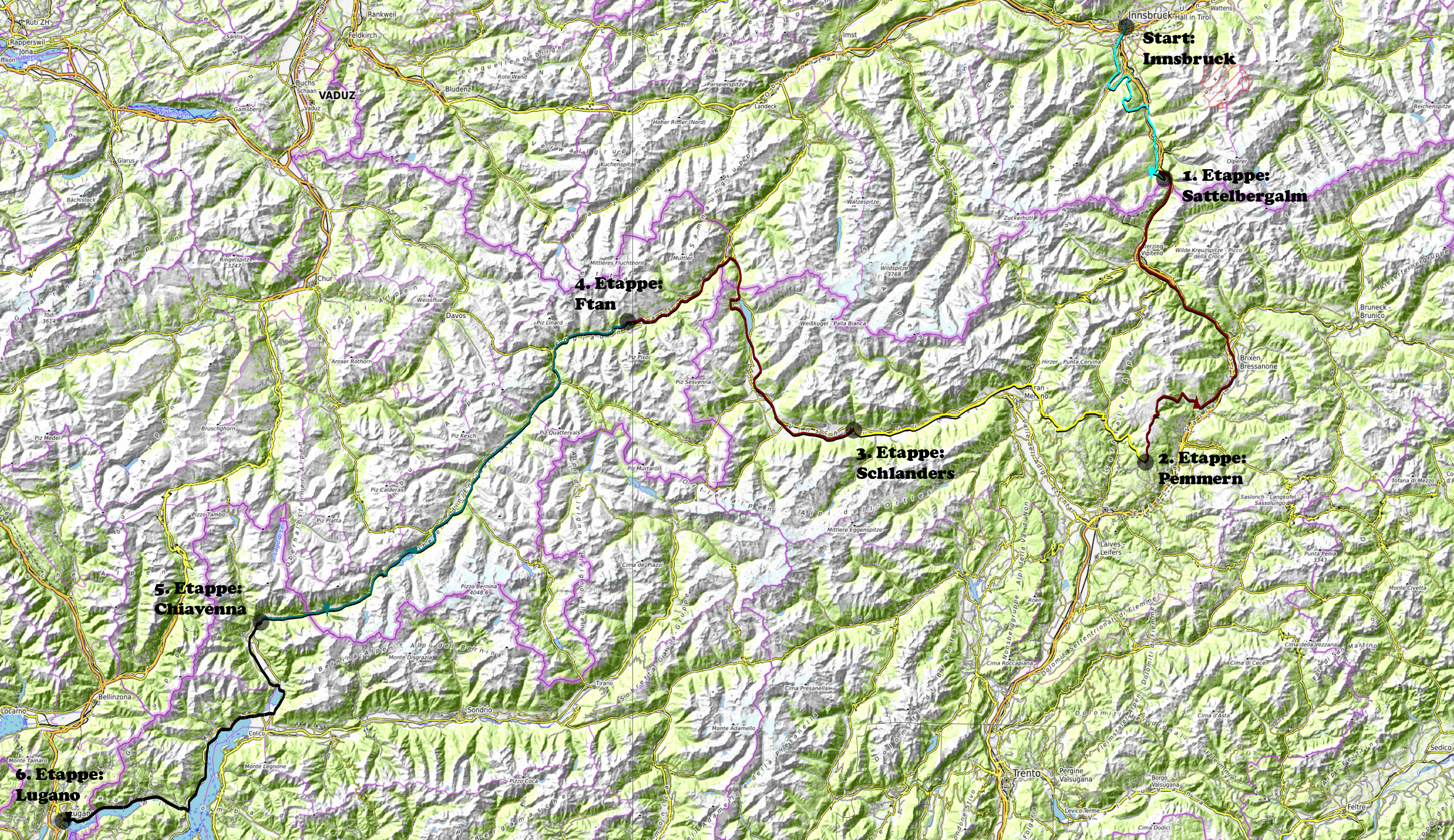 Biketour Innsbruck- Südtirol- Engadin- Lugano 554km, 11'526hm 14. bis 19. Jan 2024