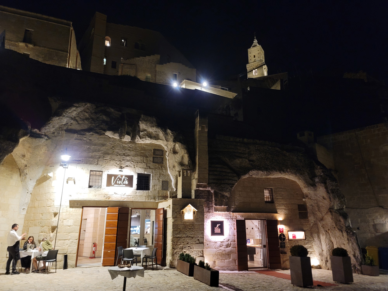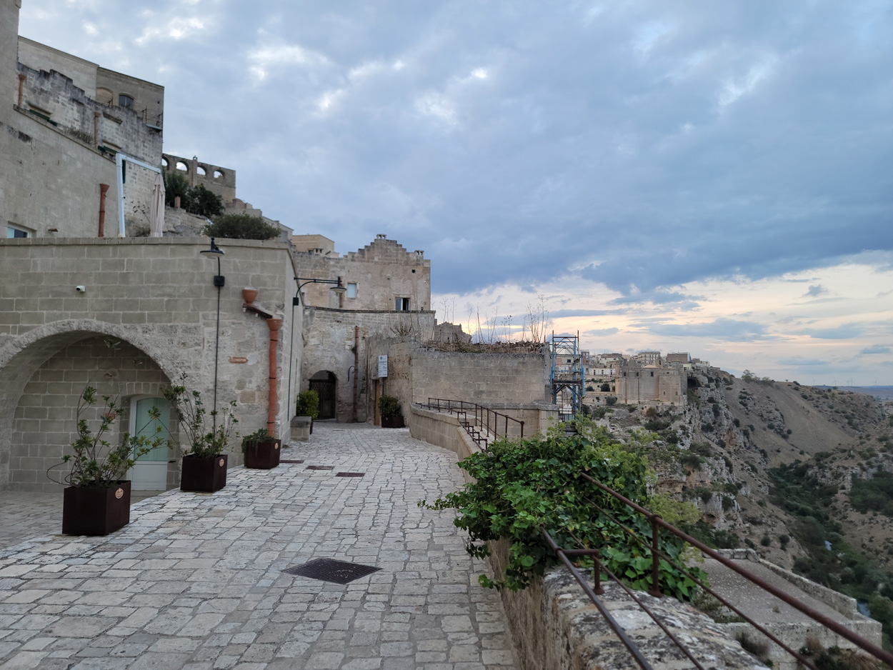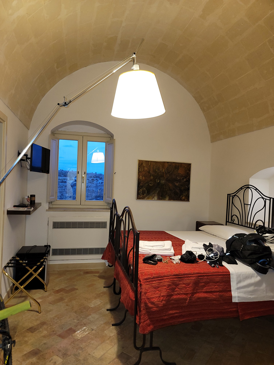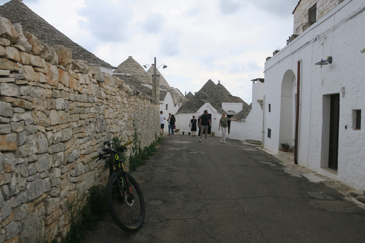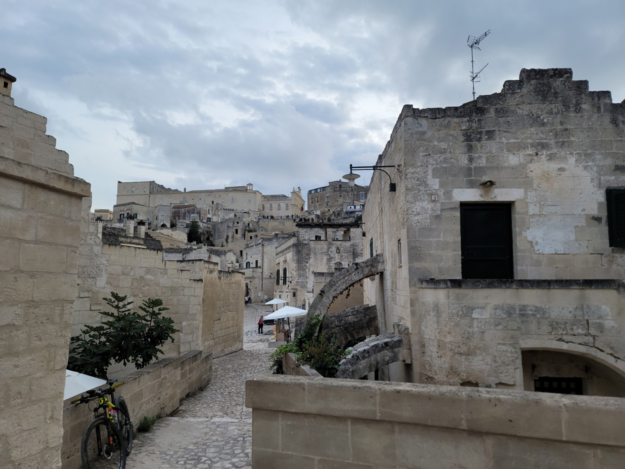 Nachdem ich am Samstag und Sonntag Vormittag zuhause noch Gartenarbeiten zu erledigen hatte, begann ich dann Gestern Mittag mal mein Zeugs zu packen. Ich Überlegte immer noch Intensiv welche Region für eine 2 Wöchige Biketour in Bezug auf das Wetter am besten sein könnte. In Mitteleuropa war es mehrheitlich wechselhaft bis regnerisch. Ich entschied mich dann für Süditalien und buchte dann kurz vor 15Uhr mal einen Liegeplatz im Nachtzug von Milano nach Lecce. Minuten später machte ich mich dann schon auf den Weg zum Bahnhof Frauenfeld wo um 15.18Uhr mein Zug fuhr. Den etwas längeren, gut einstündigen Zwischenhalt in Milano Centrale, nutzte ich dann um mir schon mal etwas fürs Morgenessen zu kaufen. Ich konnte mir dann mit der "To Good to Go App" etwas von einer edel Bäckerei im Hauptbahnhof Mailand zu einem günstigen Preis erwerben. Um 20.30Uhr fuhr dann in Milano mein Nachtzug nach Lecce. Das 4er Liegewagenabteil musste ich dabei mit 2 sympathischen Deutschen teilen. Das Bike ließ sich mit ausgebautem Hinter- und Vorderrad unter der unteren Pritsche verstauen. Während der Bahnfahrt entschied ich mich dann den Nachtzug vorzeitig um 7Uhr in Bari zu Verlassen. Hier stieg ich dann auf einen Regionalzug um der mich ins 80km weiter südlich gelegene Ostuni brachte. Während der Fahrt im Regionalzug baute ich mein Bike schon wieder fertig zusammen. Um 8.40 startete ich dann meine Tour am Bahnhof von Ostuni. Zuerst ging es dann mal gut 100Höhenmeter hinauf ins wunderschöne Stadtzentrum von Ostuni, wo ich mir dann ausreichend Zeit für die Besichtigung nahm. Danach fuhr ich auf Nebenstrassen und Radwegen über Cisternino und Locorotondo nach Alberobello. Hier in Alberobello, der für seine Trulli Häuser bekannten Kleinstadt in Apulien, kam ich dann nach etwa 40km Fahrt um 11.30Uhr an. Da die Ortschaft zum UNESCO-Welterbe zählt und wirklich sehr sehenswert war, tummelten sich auch zahlreiche Touristengruppen aus aller Welt durch die Gassen. Auch ich ließ es mir nicht nehmen so ein Trullihaus von innen anzusehen. Danach führte meine Route über die Ortschaft Noci weiter nach Gioa del Colle. Hier suchte ich mir dann um 14.30 eine Lokalität fürs Mittagessen. An der Via Roma fand ich dann ein offenes Bistro wo ich mich für 45min hinsetzte und Hamburger mit Pommes verspeiste. Danach waren noch knapp 40km bis zu meinem Tagesziel Matera zurückzulegen. Leider hatte ich dann auf den letzten Kilometern noch etwas mit Gegenwind zu Kämpfen. Etwa um 17.15Uhr erreichte ich dann den Hügel gegenüber der Stadt wo sich die ersten Felsenhöhlen befanden. Von hieraus musste ich dann etwa 100hm zu Fuss bis zum Bach Gravina di Matera hinunter und dann fast gleich viele Meter wieder hinauf ins Stadtzentrum von Matera laufen. Die Historische Altstadt über der Felsenklippe erreichte ich dann 17.50Uhr. Etwa eine Stunde Später konnte ich dann ein B&B Zimmer beziehen. Zum Abendessen fand ich dann etwas unterhalb der Unterkunft eine gute Pizzeria welche sich in einer Art von Felsenhöhle befand.