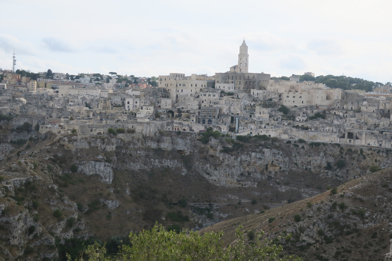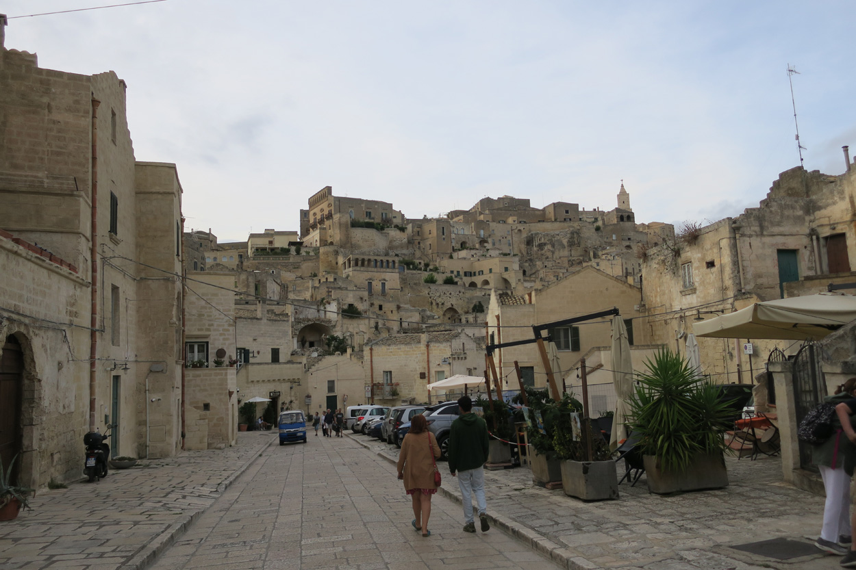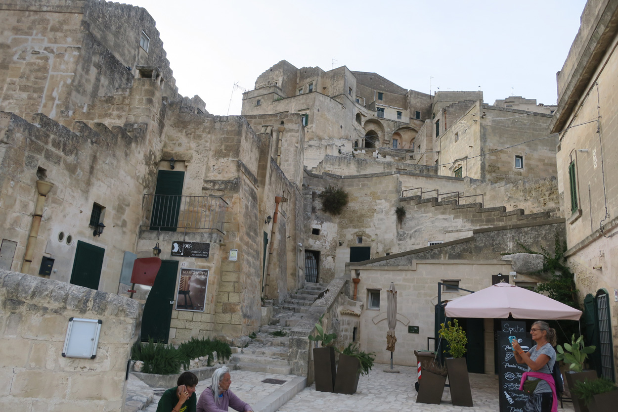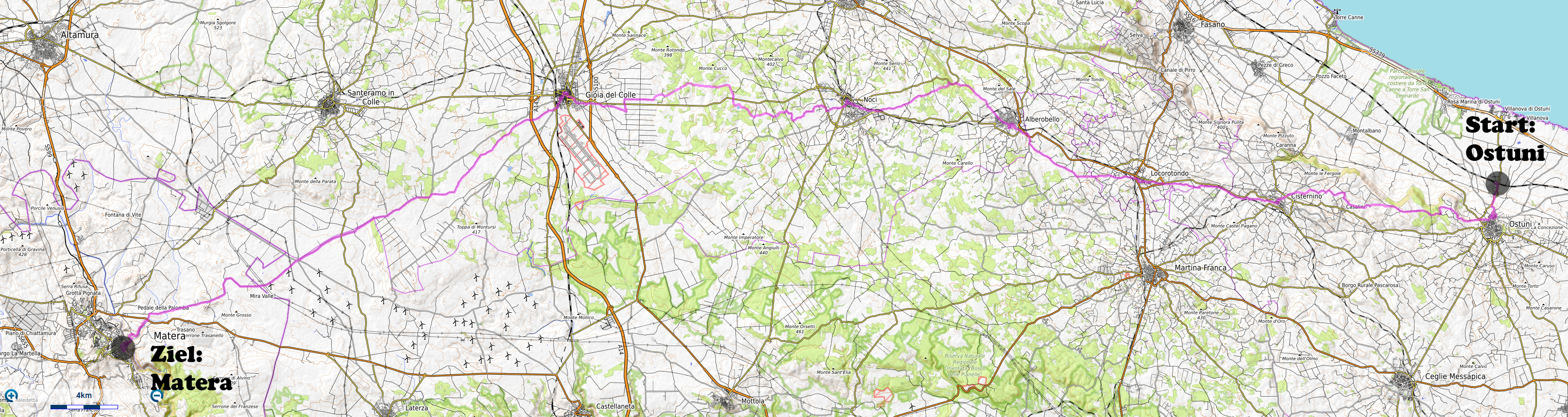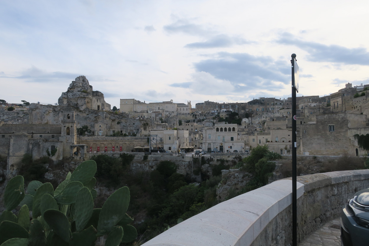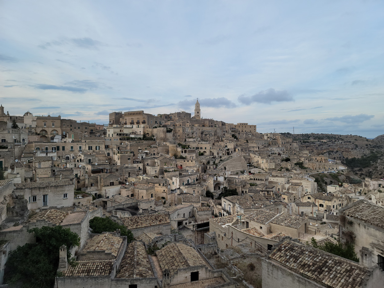 Nachdem ich am Samstag und Sonntag Vormittag zuhause noch Gartenarbeiten zu erledigen hatte, begann ich dann Gestern Mittag mal mein Zeugs zu packen. Ich Überlegte immer noch Intensiv welche Region für eine 2 Wöchige Biketour in Bezug auf das Wetter am besten sein könnte. In Mitteleuropa war es mehrheitlich wechselhaft bis regnerisch. Ich entschied mich dann für Süditalien und buchte dann kurz vor 15Uhr mal einen Liegeplatz im Nachtzug von Milano nach Lecce. Minuten später machte ich mich dann schon auf den Weg zum Bahnhof Frauenfeld wo um 15.18Uhr mein Zug fuhr. Den etwas längeren, gut einstündigen Zwischenhalt in Milano Centrale, nutzte ich dann um mir schon mal etwas fürs Morgenessen zu kaufen. Ich konnte mir dann mit der "To Good to Go App" etwas von einer edel Bäckerei im Hauptbahnhof Mailand zu einem günstigen Preis erwerben. Um 20.30Uhr fuhr dann in Milano mein Nachtzug nach Lecce. Das 4er Liegewagenabteil musste ich dabei mit 2 sympathischen Deutschen teilen. Das Bike ließ sich mit ausgebautem Hinter- und Vorderrad unter der unteren Pritsche verstauen. Während der Bahnfahrt entschied ich mich dann den Nachtzug vorzeitig um 7Uhr in Bari zu Verlassen. Hier stieg ich dann auf einen Regionalzug um der mich ins 80km weiter südlich gelegene Ostuni brachte. Während der Fahrt im Regionalzug baute ich mein Bike schon wieder fertig zusammen. Um 8.40 startete ich dann meine Tour am Bahnhof von Ostuni. Zuerst ging es dann mal gut 100Höhenmeter hinauf ins wunderschöne Stadtzentrum von Ostuni, wo ich mir dann ausreichend Zeit für die Besichtigung nahm. Danach fuhr ich auf Nebenstrassen und Radwegen über Cisternino und Locorotondo nach Alberobello. Hier in Alberobello, der für seine Trulli Häuser bekannten Kleinstadt in Apulien, kam ich dann nach etwa 40km Fahrt um 11.30Uhr an. Da die Ortschaft zum UNESCO-Welterbe zählt und wirklich sehr sehenswert war, tummelten sich auch zahlreiche Touristengruppen aus aller Welt durch die Gassen. Auch ich ließ es mir nicht nehmen so ein Trullihaus von innen anzusehen. Danach führte meine Route über die Ortschaft Noci weiter nach Gioa del Colle. Hier suchte ich mir dann um 14.30 eine Lokalität fürs Mittagessen. An der Via Roma fand ich dann ein offenes Bistro wo ich mich für 45min hinsetzte und Hamburger mit Pommes verspeiste. Danach waren noch knapp 40km bis zu meinem Tagesziel Matera zurückzulegen. Leider hatte ich dann auf den letzten Kilometern noch etwas mit Gegenwind zu Kämpfen. Etwa um 17.15Uhr erreichte ich dann den Hügel gegenüber der Stadt wo sich die ersten Felsenhöhlen befanden. Von hieraus musste ich dann etwa 100hm zu Fuss bis zum Bach Gravina di Matera hinunter und dann fast gleich viele Meter wieder hinauf ins Stadtzentrum von Matera laufen. Die Historische Altstadt über der Felsenklippe erreichte ich dann 17.50Uhr. Etwa eine Stunde Später konnte ich dann ein B&B Zimmer beziehen. Zum Abendessen fand ich dann etwas unterhalb der Unterkunft eine gute Pizzeria welche sich in einer Art von Felsenhöhle befand.