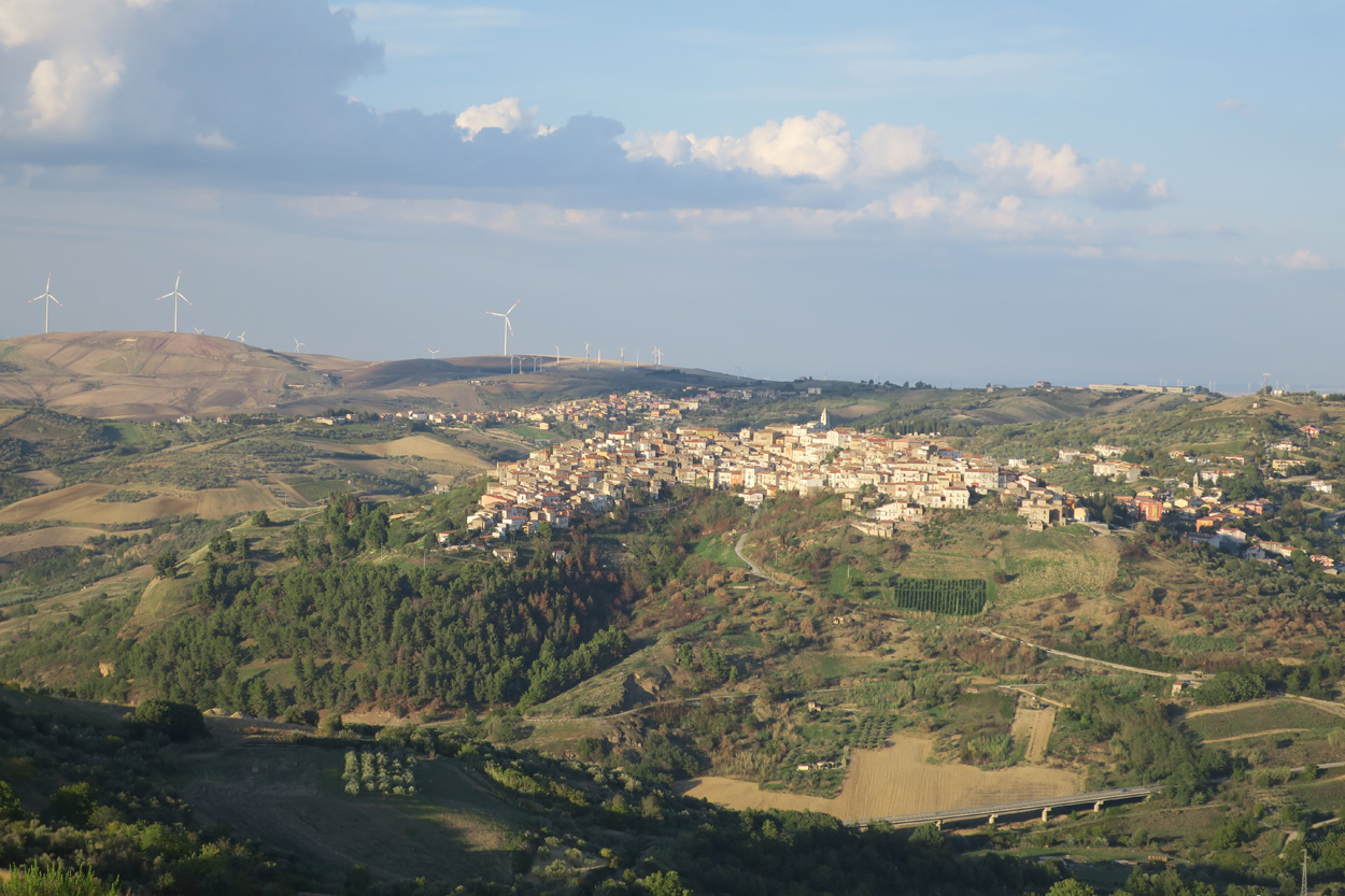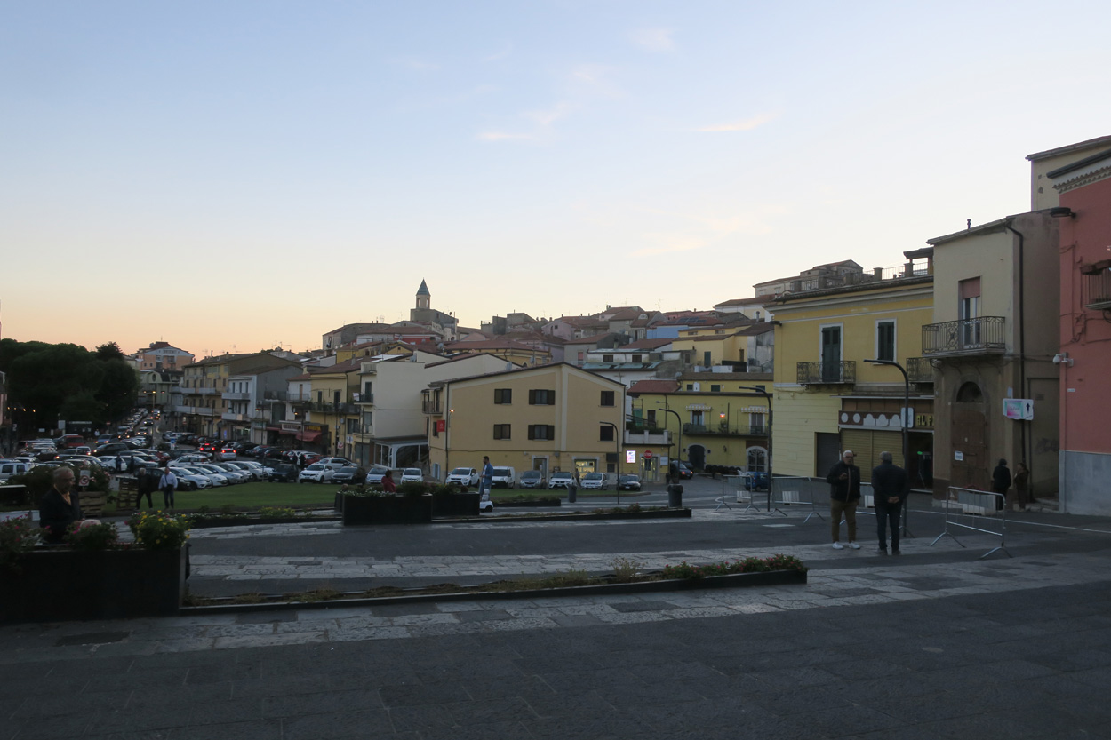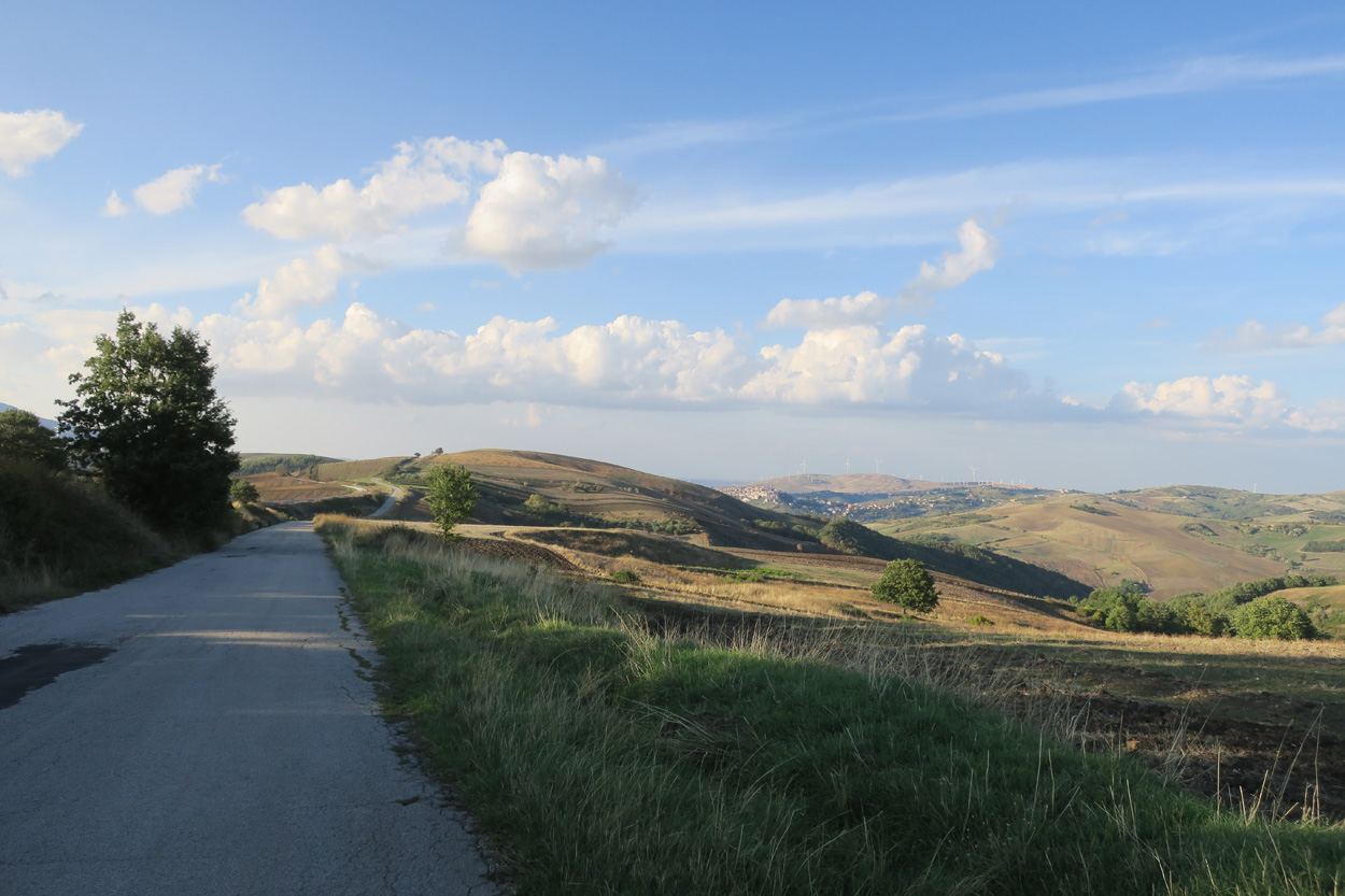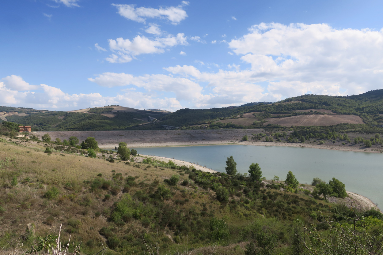 Heute morgen verliess ich um etwa 7.30Uhr meine Unterkunft im historischen Zentrum von Matera. Zuerst suchte ich dann die Bar neben dem Dom auf, wo ich im Auftrag des B&B mein Frühstück erhalten sollte. Es war dann aber sehr sehr bescheiden. Ein Heissgetränk und ein gefüllter Nutella Gipfel. Danach besichtigte ich noch kurz den Dom und komplettierte dann mein Morgenessen bei einem Supermarkt. Danach führte mein Weg etwa 5 Stunden durch fast unbewohntes Gebiet bis zur Ortschaft Oppido Lucano. Verkehr gab es auf meiner Route praktisch keiner. Da ich kurz vor der Ortschaft Oppido Lucano noch eine Platte hatte, schaffte ich es gerade noch knapp zum Supermarkt, bevor der um 13.30Uhr Siesta machte. Ich war froh konnte ich hier noch Getränke kaufen, denn es war recht warm und trocken. Nach dem Besuch des Supermarktes setzte ich mich dann noch in eine Bar-Gelateria. Danach radelte ich dann hinunter zum Acerenza Stausee. Hier gab es dann auf dem Weg nach Rionero di Vultra doch noch ein paar Offroadpisten und ein gut 900m hohes Pässli zu bezwingen. Etwa um 18Uhr erreichte ich dann die Stadt Rionero di Vultra. Zuerst machte ich mich dann auf die Suche nach einem Fahrradgeschäft um einen neuen Schlauch zu kaufen. Danach suchte ich noch einen Supermarkt auf bevor ich dann bei Sonnenuntergang (18.53Uhr) im Hotel eincheckte. Das Zimmer bekam ich hier in diesem 3***Schuppen für 50€ und das feine Abendessen mit Trüffel Pizza bekam ich für 22€. Somit hatte ich hier kaum mehr als die Hälfte bezahlt wie gestern im extrem touristischen Matera.