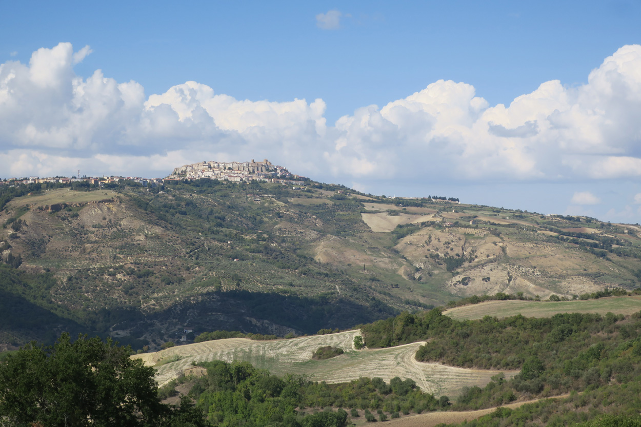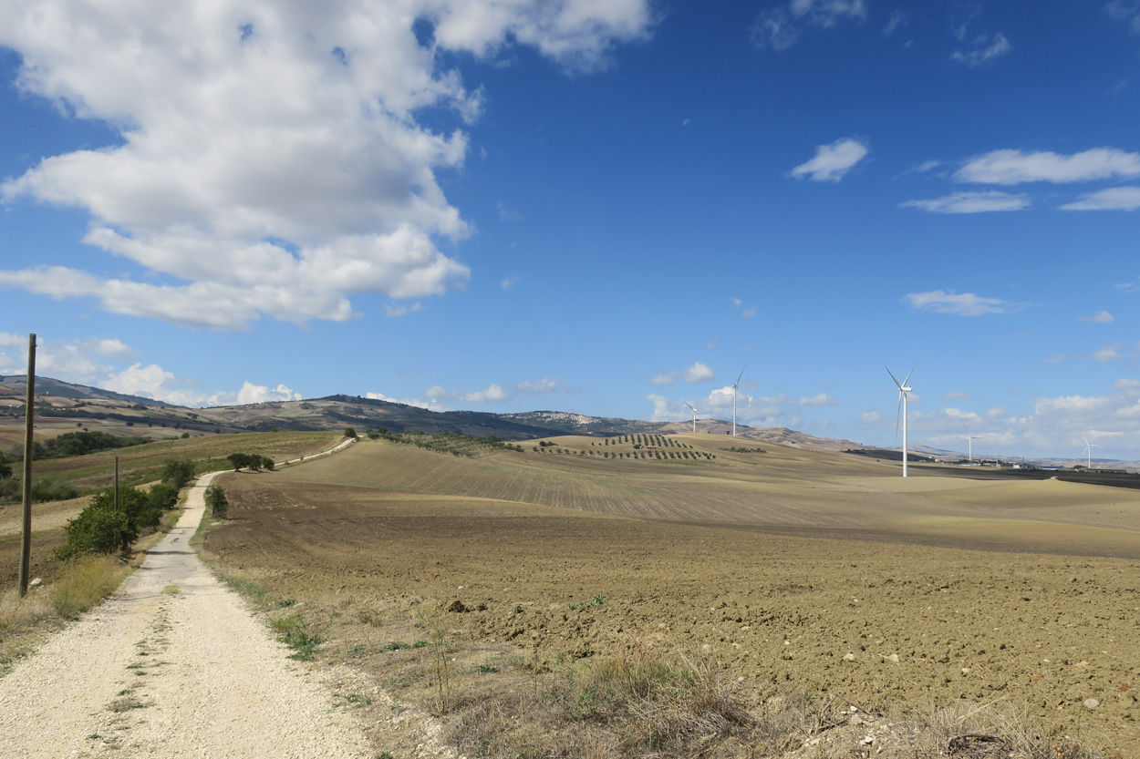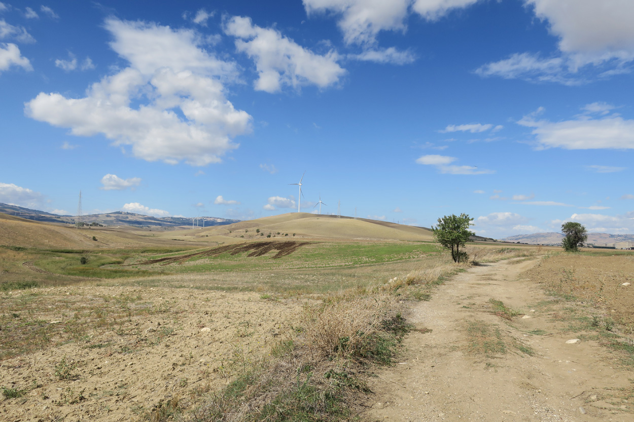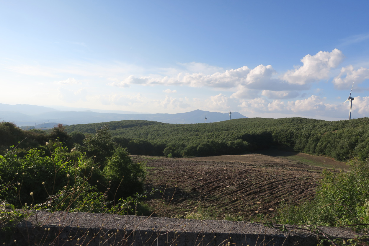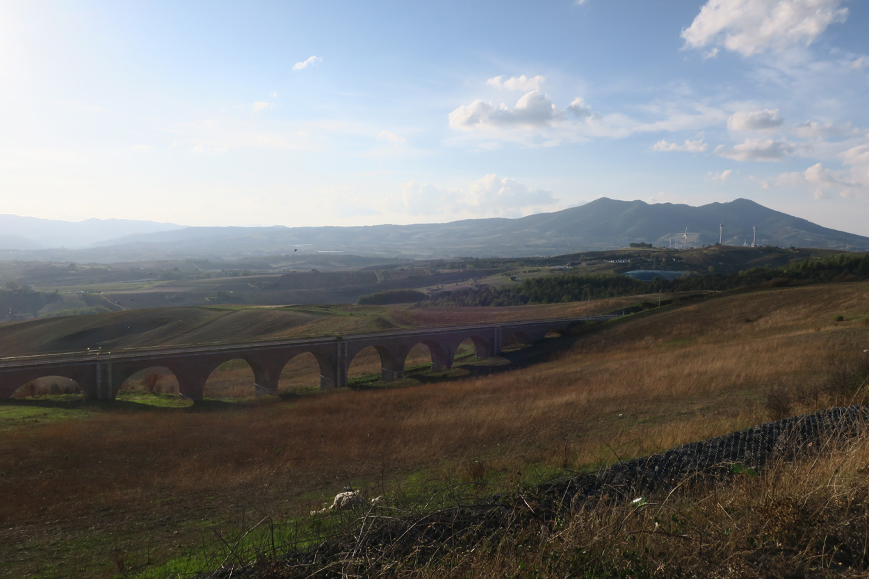 Heute morgen verliess ich um etwa 7.30Uhr meine Unterkunft im historischen Zentrum von Matera. Zuerst suchte ich dann die Bar neben dem Dom auf, wo ich im Auftrag des B&B mein Frühstück erhalten sollte. Es war dann aber sehr sehr bescheiden. Ein Heissgetränk und ein gefüllter Nutella Gipfel. Danach besichtigte ich noch kurz den Dom und komplettierte dann mein Morgenessen bei einem Supermarkt. Danach führte mein Weg etwa 5 Stunden durch fast unbewohntes Gebiet bis zur Ortschaft Oppido Lucano. Verkehr gab es auf meiner Route praktisch keiner. Da ich kurz vor der Ortschaft Oppido Lucano noch eine Platte hatte, schaffte ich es gerade noch knapp zum Supermarkt, bevor der um 13.30Uhr Siesta machte. Ich war froh konnte ich hier noch Getränke kaufen, denn es war recht warm und trocken. Nach dem Besuch des Supermarktes setzte ich mich dann noch in eine Bar-Gelateria. Danach radelte ich dann hinunter zum Acerenza Stausee. Hier gab es dann auf dem Weg nach Rionero di Vultra doch noch ein paar Offroadpisten und ein gut 900m hohes Pässli zu bezwingen. Etwa um 18Uhr erreichte ich dann die Stadt Rionero di Vultra. Zuerst machte ich mich dann auf die Suche nach einem Fahrradgeschäft um einen neuen Schlauch zu kaufen. Danach suchte ich noch einen Supermarkt auf bevor ich dann bei Sonnenuntergang (18.53Uhr) im Hotel eincheckte. Das Zimmer bekam ich hier in diesem 3***Schuppen für 50€ und das feine Abendessen mit Trüffel Pizza bekam ich für 22€. Somit hatte ich hier kaum mehr als die Hälfte bezahlt wie gestern im extrem touristischen Matera.