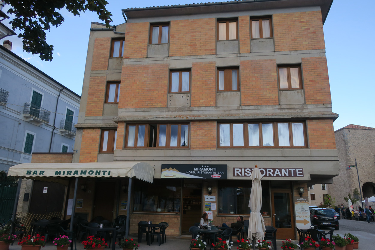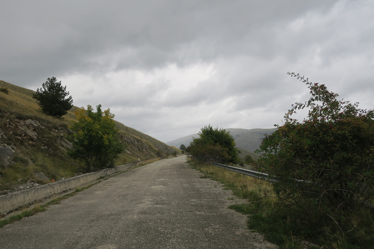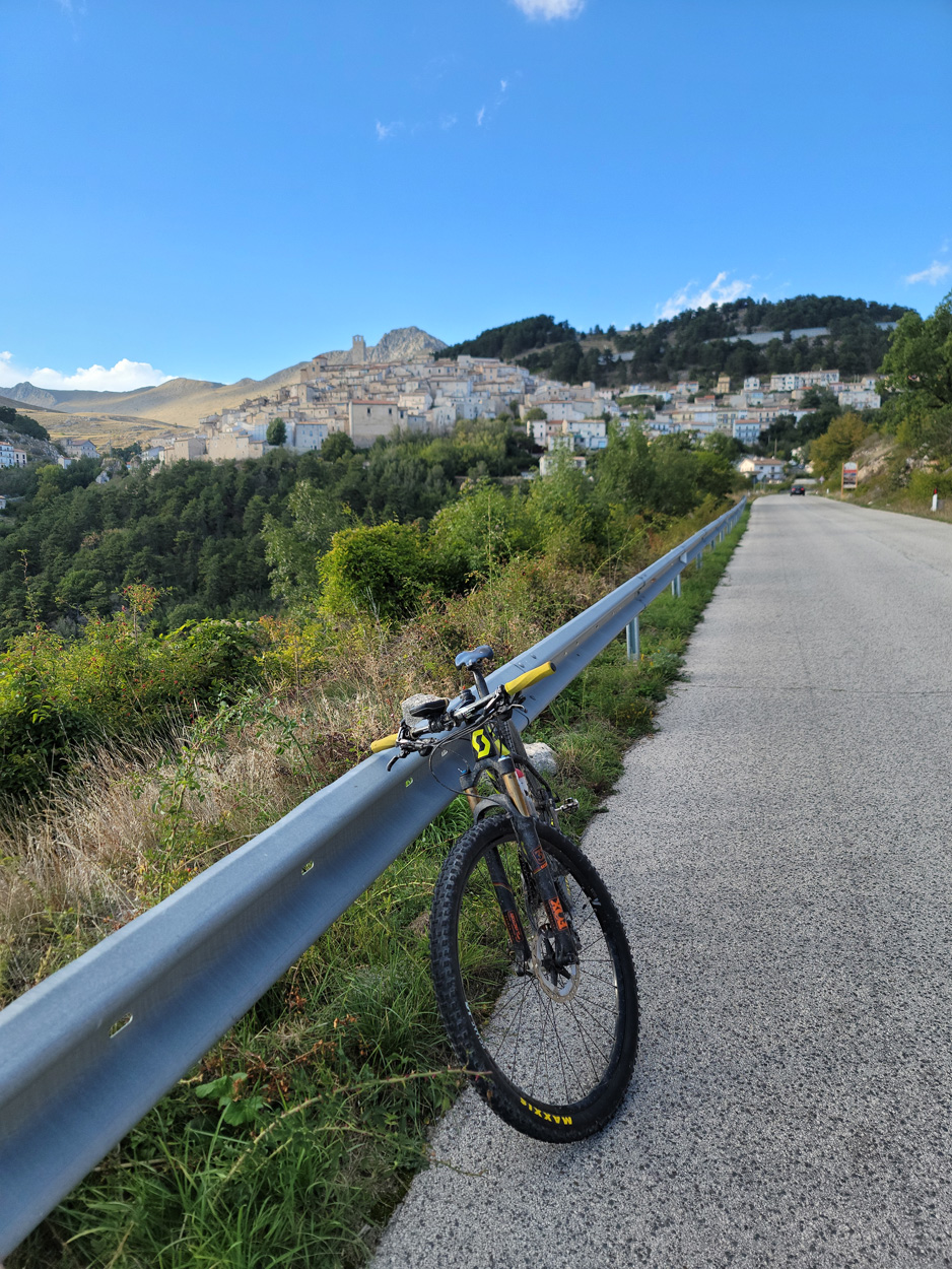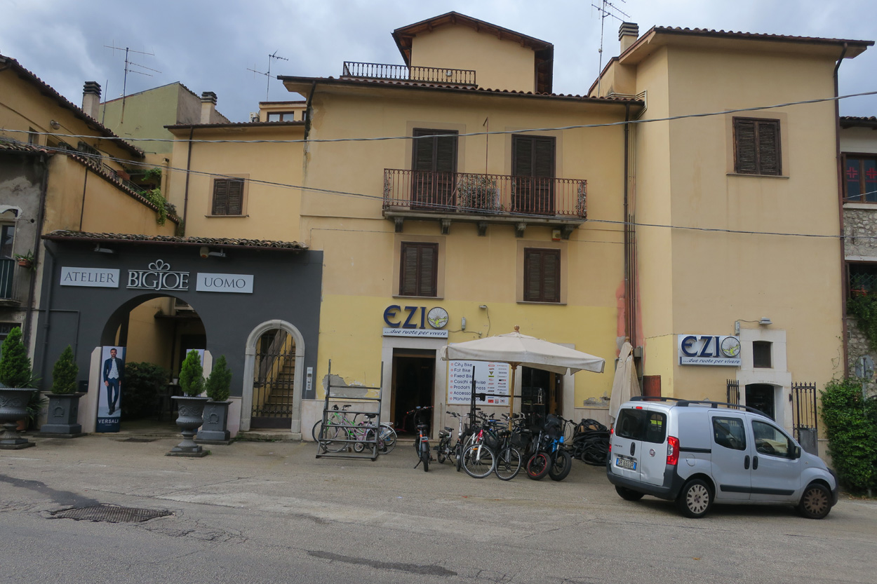 Heute Morgen gab es um 7.45Uhr das Frühstück. Es war Typisch Italienisch und bestand daher hauptsächlich aus diversen Kuchen. Etwa um 8.45Uhr startete ich dann. Leider kam ich nicht weit bis es zu regnen begann. Trotz des Regens entschied ich mich dann blöderweise für die Offroad Variante um nach Sulmona hinunter zu fahren. Der Weg war dann leider noch schlechter als ich vermutet hatte, besonders bei Nässe. Es gab teilweise lehmigen Untergrund der bei Nässe zur sofortigen Verstopfung des Hinterrades führte. Etwa um 11.15Uhr erreichte ich dann dss schöne Stadtzentrum von Sulmona. Hier putzte ich dann am erst besten Brunnen mein Velo. Da das Vorderrad leicht Luft verlor suchte ich dann den Veloladen im Industriegebiet auf. Ich wollte auf Nummer sicher gehen und kaufte einen neuen Reifen und ein Schlauch mit Dichtflüssigkeit (Slime). Ebenfalls konnte ich meine Schaltung wieder richten lassen, nach dem schweren Zwischenfall von Gestern. Gestern war mir in einem Aufstieg die Kette angerissen, hängte dadurch am Schaltwerk ein und riss es ins Rad. Die Folge war ein Verbogenes Schaltwerk und eine gebrochene Schraube im Schaltauge. Der Velomech nahm sich gerade Zeit für mich und offerierte mir noch ein Stück Pizza. Nach etwa 30min war dann mein Bike wieder fit. Auf Rad- und Wanderwegen fuhr ich dann nach Popoli Terme. Dabei gab es noch eine überflutete und daher unpassierbare Bahnunterführung. Ich überquerte dann ausnahmsweise die Geleise. Etwa um 13.45Uhr erreichte ich dann Popoli Terme und kaufte noch Saft. Über ein kleines Pässli führte dann eine Naturstrasse nach Bussi sul Trino. Hier entschied ich mich dann für die direkte Variante im Aufstieg nach Castel del Monte, wo ich vor kurzen ein Hotelzimmer gebucht hatte. Um 18Uhr erreichte ich dann die Ortschaft im Gran Sasso National Park. Nach der Besichtigung des historischen Zentrums und dem Kauf von Proviant, checkte ich dann im Hotel Miramonti ein. Hier bekam ich ein modernes Zimmer und konnte danach um 20Uhr noch ein gutes Abendessen genießen.