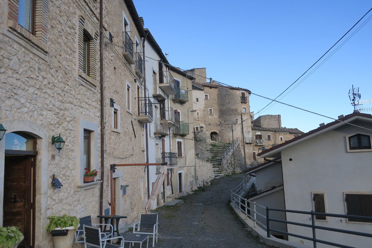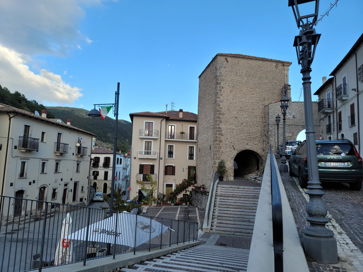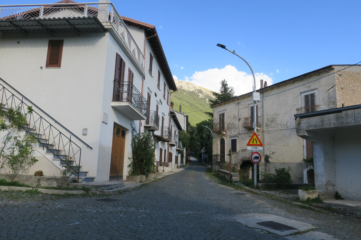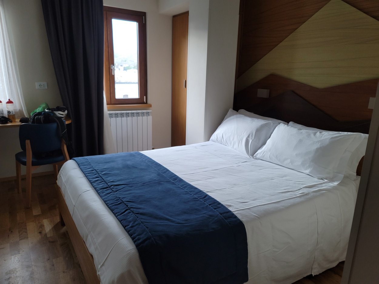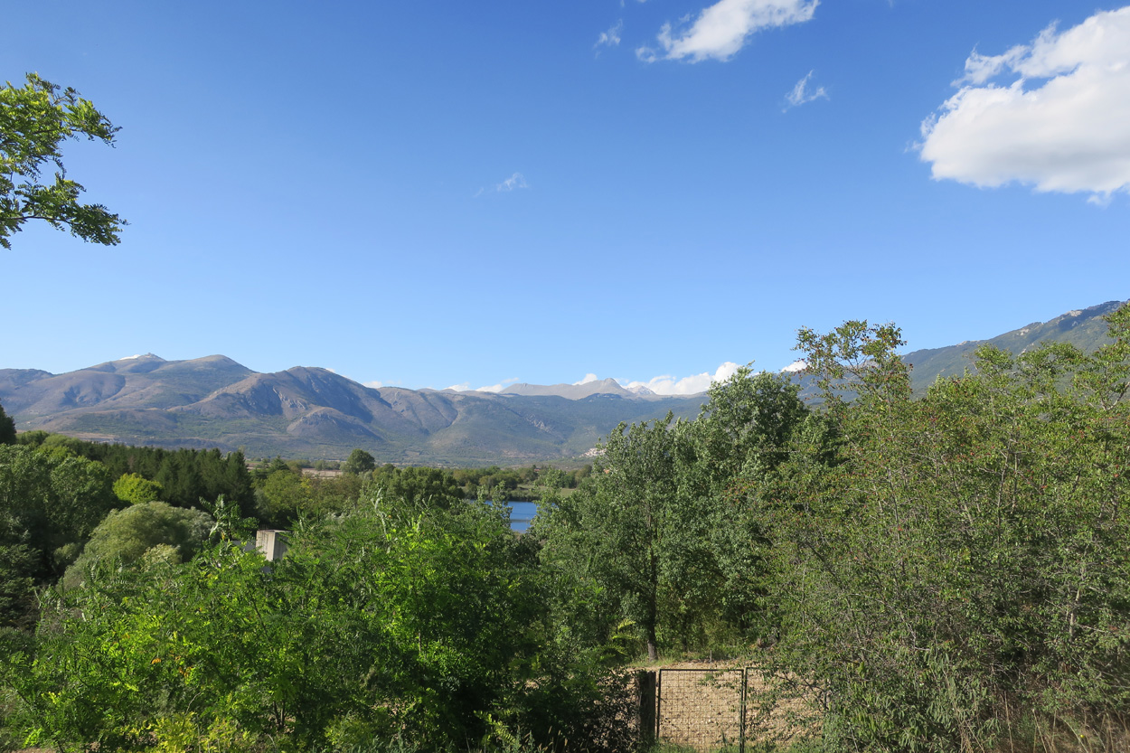 Heute Morgen gab es um 7.45Uhr das Frühstück. Es war Typisch Italienisch und bestand daher hauptsächlich aus diversen Kuchen. Etwa um 8.45Uhr startete ich dann. Leider kam ich nicht weit bis es zu regnen begann. Trotz des Regens entschied ich mich dann blöderweise für die Offroad Variante um nach Sulmona hinunter zu fahren. Der Weg war dann leider noch schlechter als ich vermutet hatte, besonders bei Nässe. Es gab teilweise lehmigen Untergrund der bei Nässe zur sofortigen Verstopfung des Hinterrades führte. Etwa um 11.15Uhr erreichte ich dann dss schöne Stadtzentrum von Sulmona. Hier putzte ich dann am erst besten Brunnen mein Velo. Da das Vorderrad leicht Luft verlor suchte ich dann den Veloladen im Industriegebiet auf. Ich wollte auf Nummer sicher gehen und kaufte einen neuen Reifen und ein Schlauch mit Dichtflüssigkeit (Slime). Ebenfalls konnte ich meine Schaltung wieder richten lassen, nach dem schweren Zwischenfall von Gestern. Gestern war mir in einem Aufstieg die Kette angerissen, hängte dadurch am Schaltwerk ein und riss es ins Rad. Die Folge war ein Verbogenes Schaltwerk und eine gebrochene Schraube im Schaltauge. Der Velomech nahm sich gerade Zeit für mich und offerierte mir noch ein Stück Pizza. Nach etwa 30min war dann mein Bike wieder fit. Auf Rad- und Wanderwegen fuhr ich dann nach Popoli Terme. Dabei gab es noch eine überflutete und daher unpassierbare Bahnunterführung. Ich überquerte dann ausnahmsweise die Geleise. Etwa um 13.45Uhr erreichte ich dann Popoli Terme und kaufte noch Saft. Über ein kleines Pässli führte dann eine Naturstrasse nach Bussi sul Trino. Hier entschied ich mich dann für die direkte Variante im Aufstieg nach Castel del Monte, wo ich vor kurzen ein Hotelzimmer gebucht hatte. Um 18Uhr erreichte ich dann die Ortschaft im Gran Sasso National Park. Nach der Besichtigung des historischen Zentrums und dem Kauf von Proviant, checkte ich dann im Hotel Miramonti ein. Hier bekam ich ein modernes Zimmer und konnte danach um 20Uhr noch ein gutes Abendessen genießen.