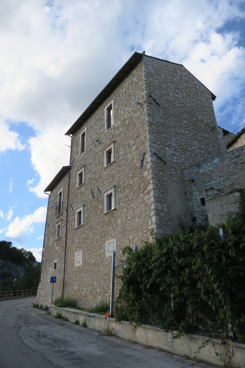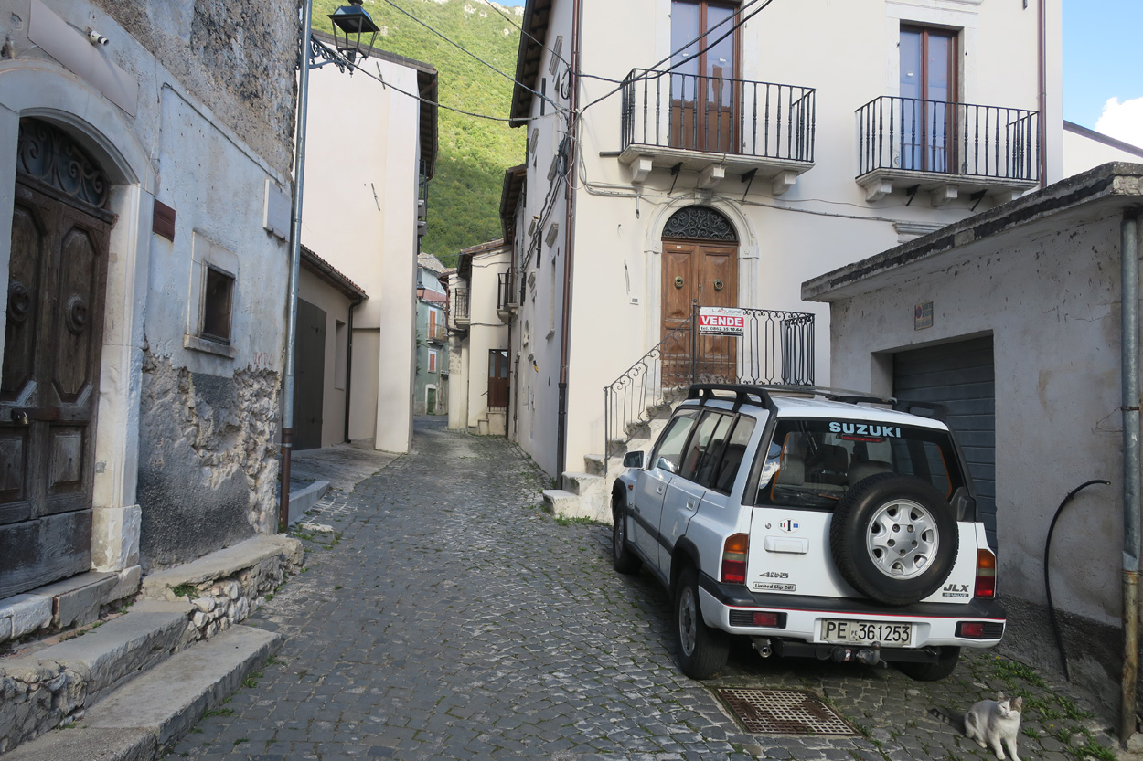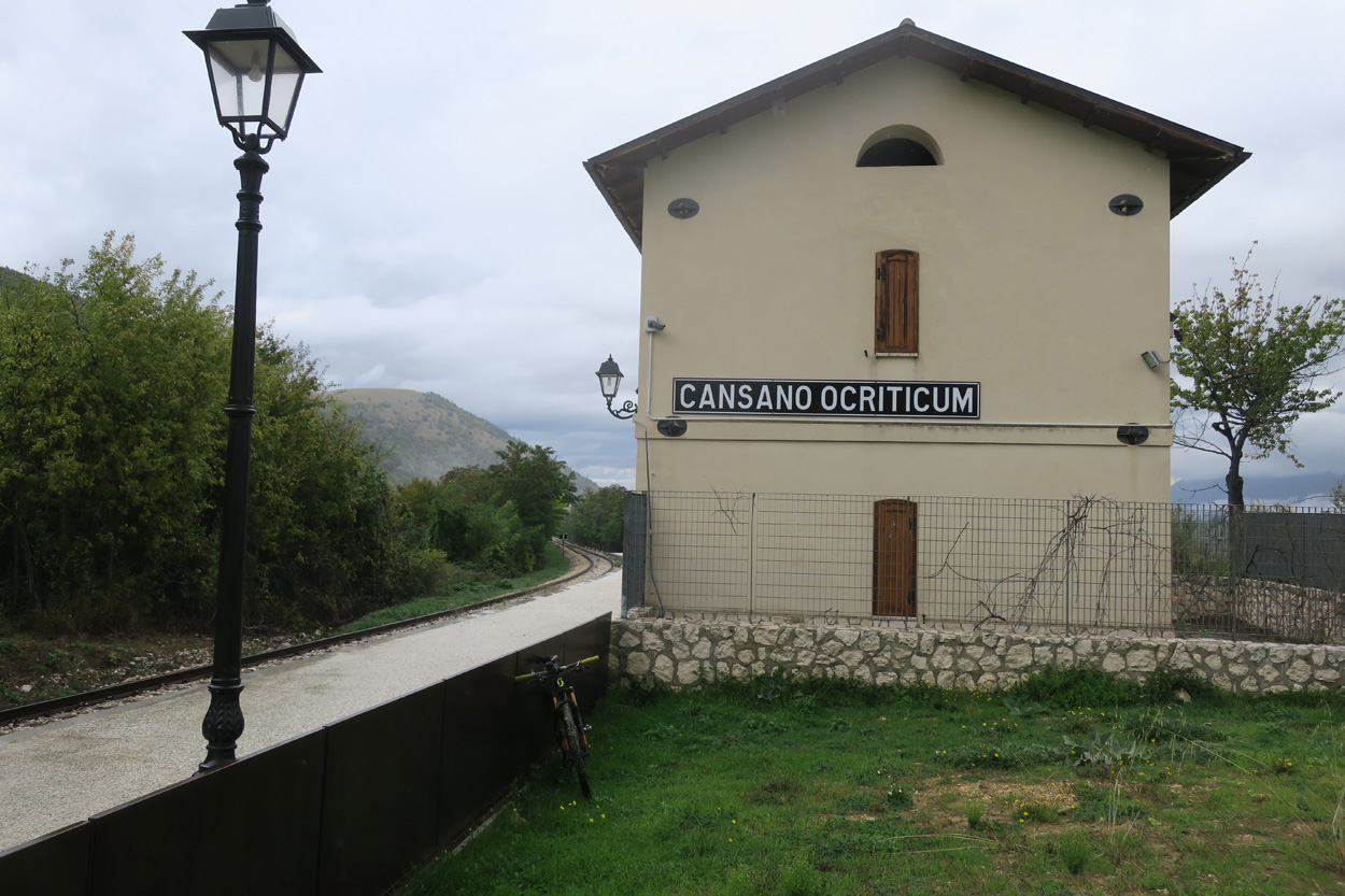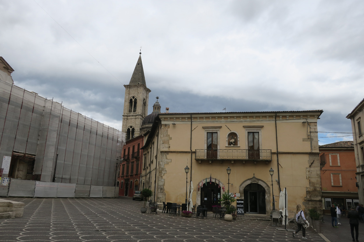 Heute Morgen gab es um 7.45Uhr das Frühstück. Es war Typisch Italienisch und bestand daher hauptsächlich aus diversen Kuchen. Etwa um 8.45Uhr startete ich dann. Leider kam ich nicht weit bis es zu regnen begann. Trotz des Regens entschied ich mich dann blöderweise für die Offroad Variante um nach Sulmona hinunter zu fahren. Der Weg war dann leider noch schlechter als ich vermutet hatte, besonders bei Nässe. Es gab teilweise lehmigen Untergrund der bei Nässe zur sofortigen Verstopfung des Hinterrades führte. Etwa um 11.15Uhr erreichte ich dann dss schöne Stadtzentrum von Sulmona. Hier putzte ich dann am erst besten Brunnen mein Velo. Da das Vorderrad leicht Luft verlor suchte ich dann den Veloladen im Industriegebiet auf. Ich wollte auf Nummer sicher gehen und kaufte einen neuen Reifen und ein Schlauch mit Dichtflüssigkeit (Slime). Ebenfalls konnte ich meine Schaltung wieder richten lassen, nach dem schweren Zwischenfall von Gestern. Gestern war mir in einem Aufstieg die Kette angerissen, hängte dadurch am Schaltwerk ein und riss es ins Rad. Die Folge war ein Verbogenes Schaltwerk und eine gebrochene Schraube im Schaltauge. Der Velomech nahm sich gerade Zeit für mich und offerierte mir noch ein Stück Pizza. Nach etwa 30min war dann mein Bike wieder fit. Auf Rad- und Wanderwegen fuhr ich dann nach Popoli Terme. Dabei gab es noch eine überflutete und daher unpassierbare Bahnunterführung. Ich überquerte dann ausnahmsweise die Geleise. Etwa um 13.45Uhr erreichte ich dann Popoli Terme und kaufte noch Saft. Über ein kleines Pässli führte dann eine Naturstrasse nach Bussi sul Trino. Hier entschied ich mich dann für die direkte Variante im Aufstieg nach Castel del Monte, wo ich vor kurzen ein Hotelzimmer gebucht hatte. Um 18Uhr erreichte ich dann die Ortschaft im Gran Sasso National Park. Nach der Besichtigung des historischen Zentrums und dem Kauf von Proviant, checkte ich dann im Hotel Miramonti ein. Hier bekam ich ein modernes Zimmer und konnte danach um 20Uhr noch ein gutes Abendessen genießen.