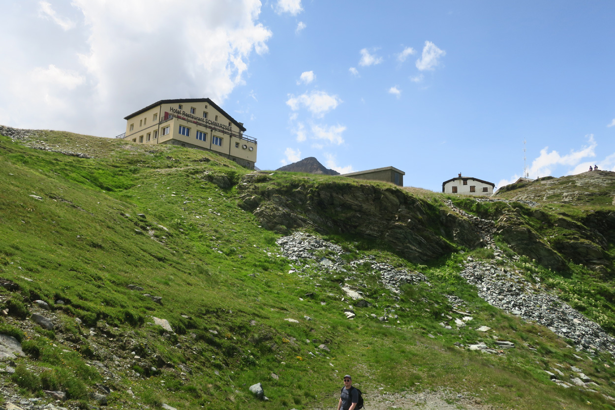 in der Abfahrt zum Furgg, Blick zurück auf das Hotel Schwarzsee