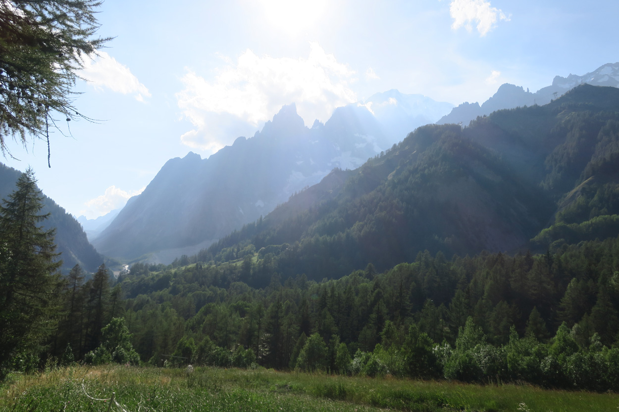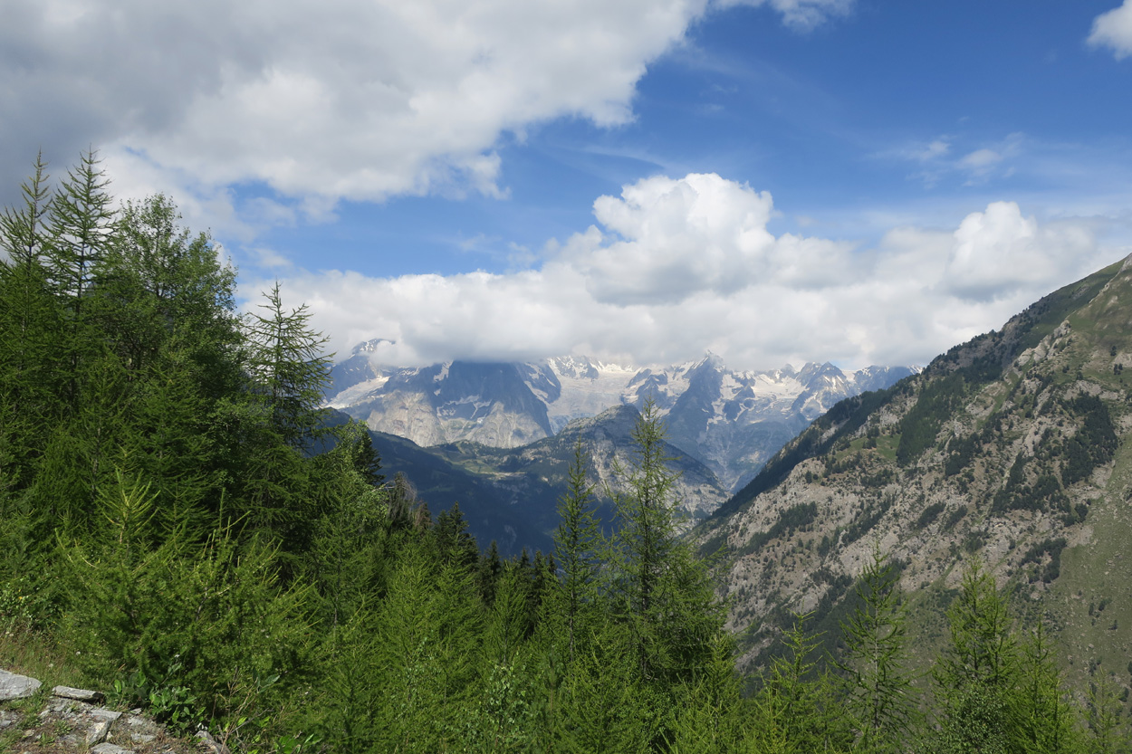 Aufstieg ins Val Ferret, Blick zum Mont Blanc Massiv