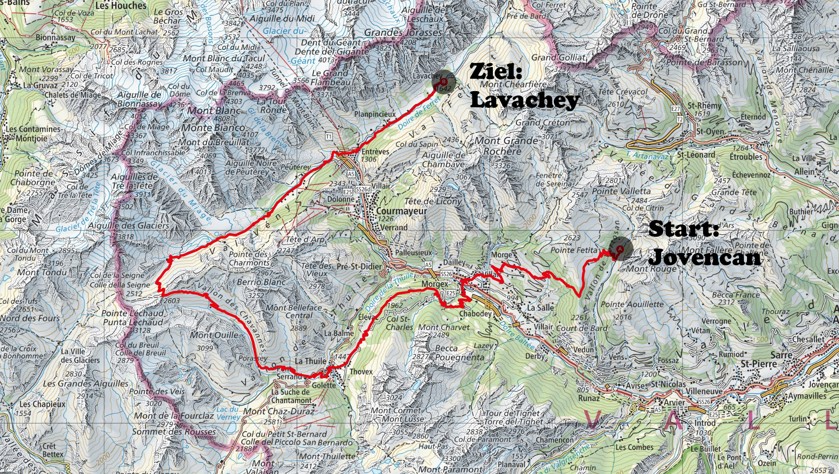 Etappe: Lavachey- Rifugio Elena- Grand Col Ferret- La Peule- Ferret- La Fouly-