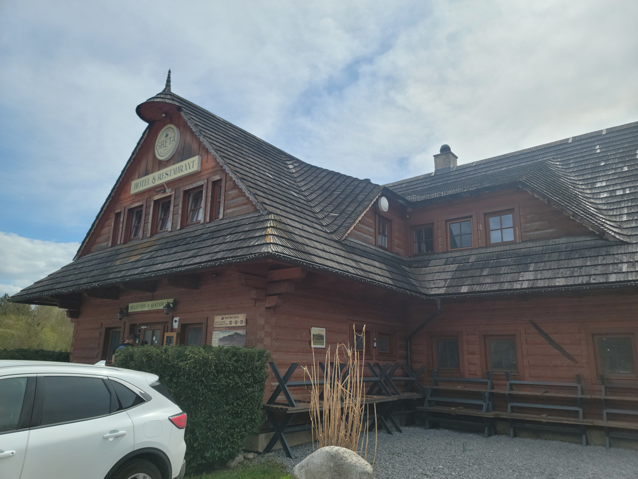 90km Fahrt, Mittagspause in einem schönen Restaurant in einem Holzbau.