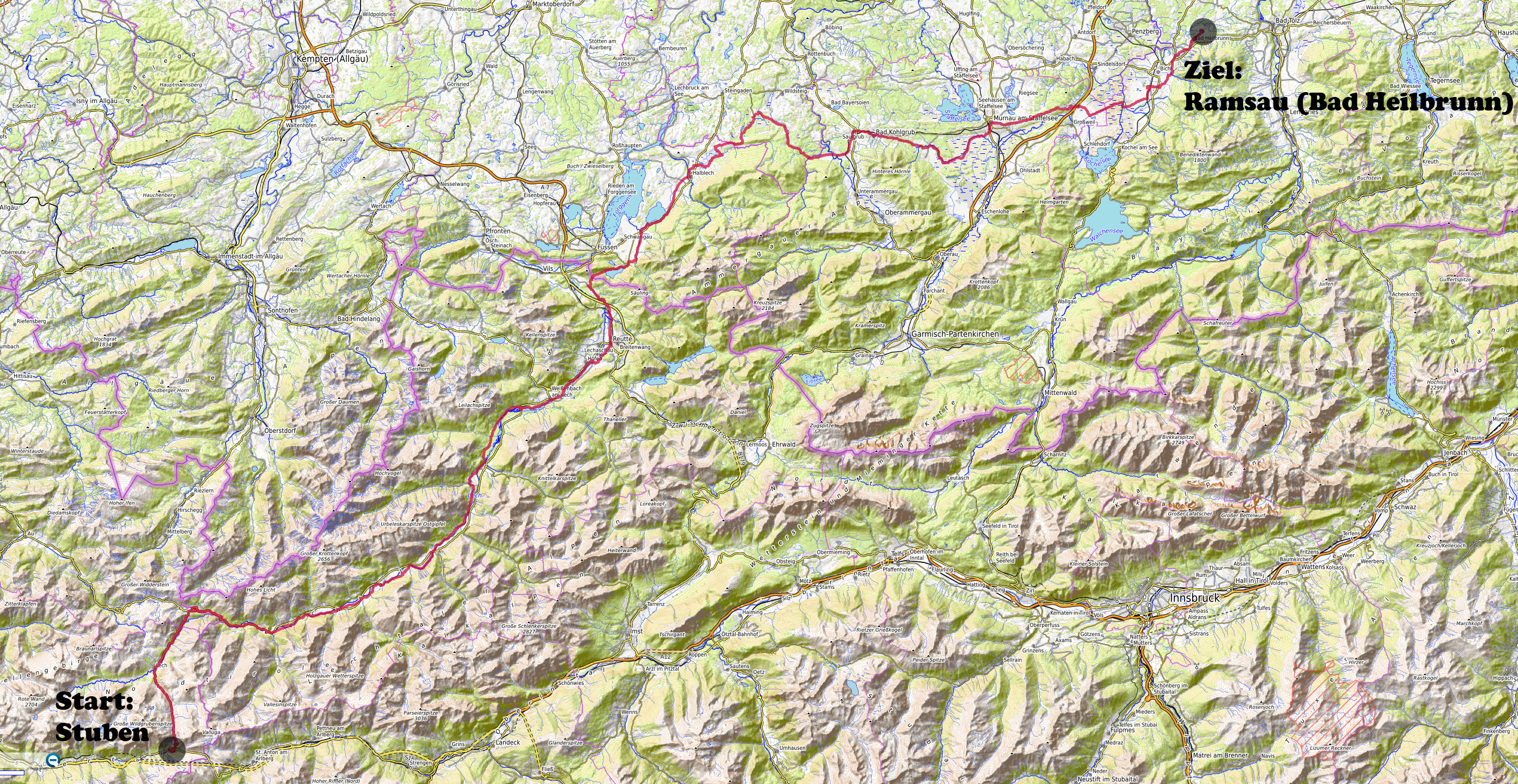 Heute morgen starteten wir nach einem mässigen Frühstück um 8.30Uhr. Etwa um 9.15Uhr erreichten wir dann mit dem Flexenpass den wahrscheinlich höchsten Punkt dieser Tour. Danach radelten wir bis Lech teilweise auf Naturpisten ausserhalb der Schutzgalerien. Auf der Strasse fuhren wir dort dann weiter nach Steeg, wo wir dann auf dem schönen Radweg durchs Lechtal bis Reutte weiterfahren konnten. Wir kamen auf diesem teilweise asphaltierten Radweg gut vorwärts und die wenigen Regentropfen machten uns nicht nass. Auch für den Rest des Tages blieb dann der angekündigte Regen aus..... gut für uns, schlecht für die ausgetrocknete Natur.... Etwa um 13Uhr waren wir dann am Alpsee bei Neuschwaanstein. Hier hatte es wahnsinnig viele Touristen. Wir verzichteten hier dann auf eine mögliche Mittagspause und radelten dann weiter zur Wieskirche wo es in deren Umgebung preiswertere Restaurants gab. Um 15.30Uhr fuhren wir dann nach einer grossen Portion Nudeln, meist auf staubtrocken Naturstrassen weiter. Das Murnauer Moos sowie Murnau waren sehr schön. Um 18.30Uhr fragen wir dann in Benediktbeuren erstmals um ein Zimmer. Doch der Gasthof war anscheinend "Ausgebucht" oder besser gesagt man wollte Feierabend. Etwa 8km weiter in Ramsau bei Bad Heilbrunn, wurden wir dann aber fündig und hatten mit einem urig schönen Gasthof einen Volltreffer