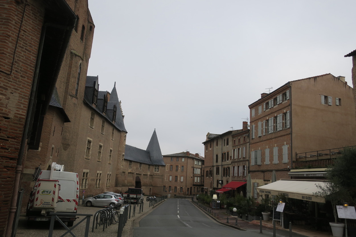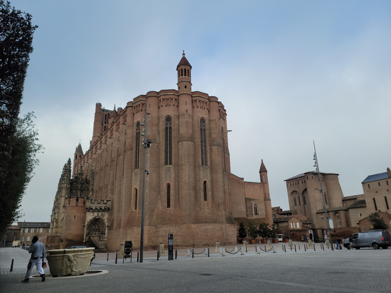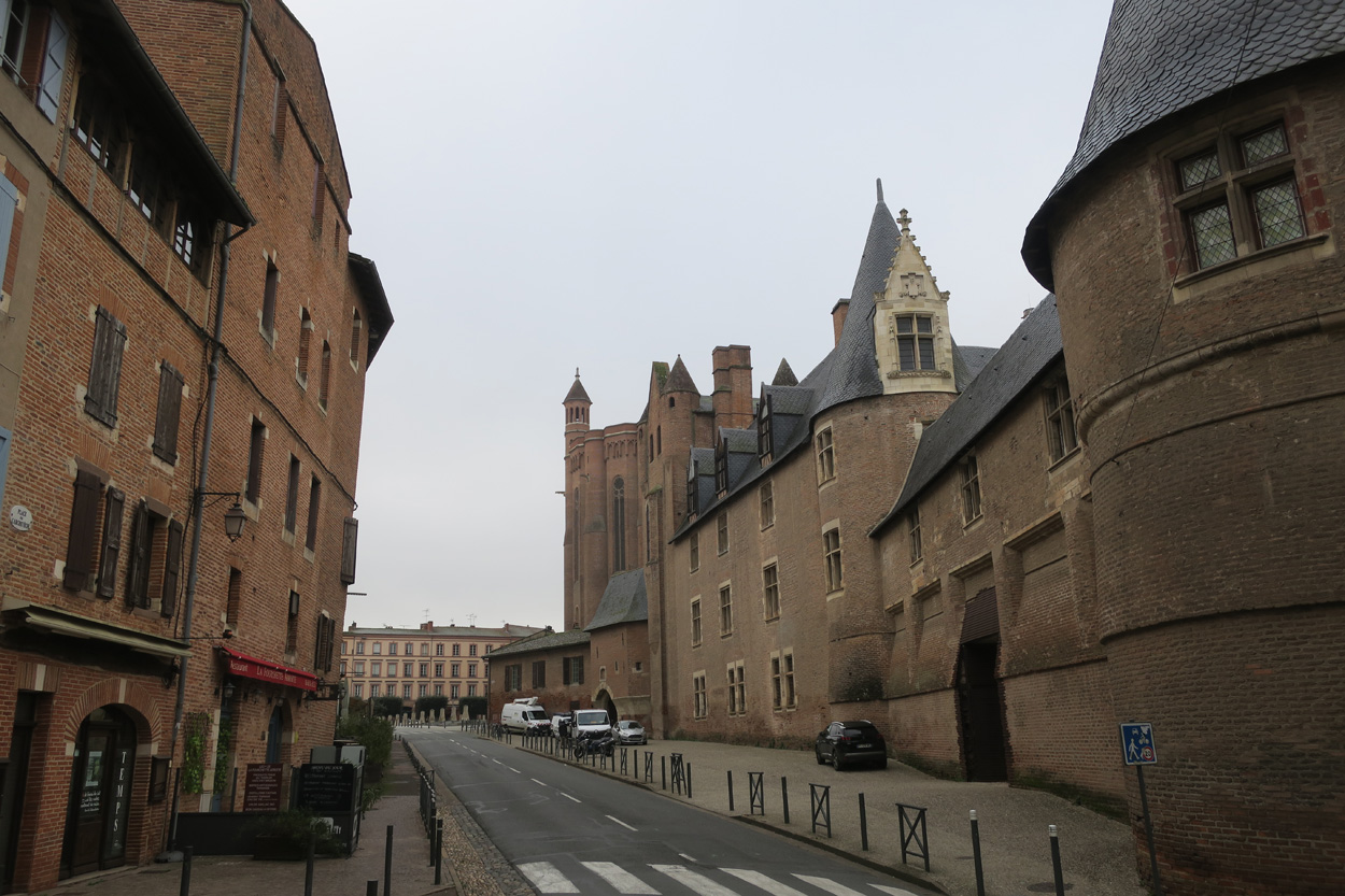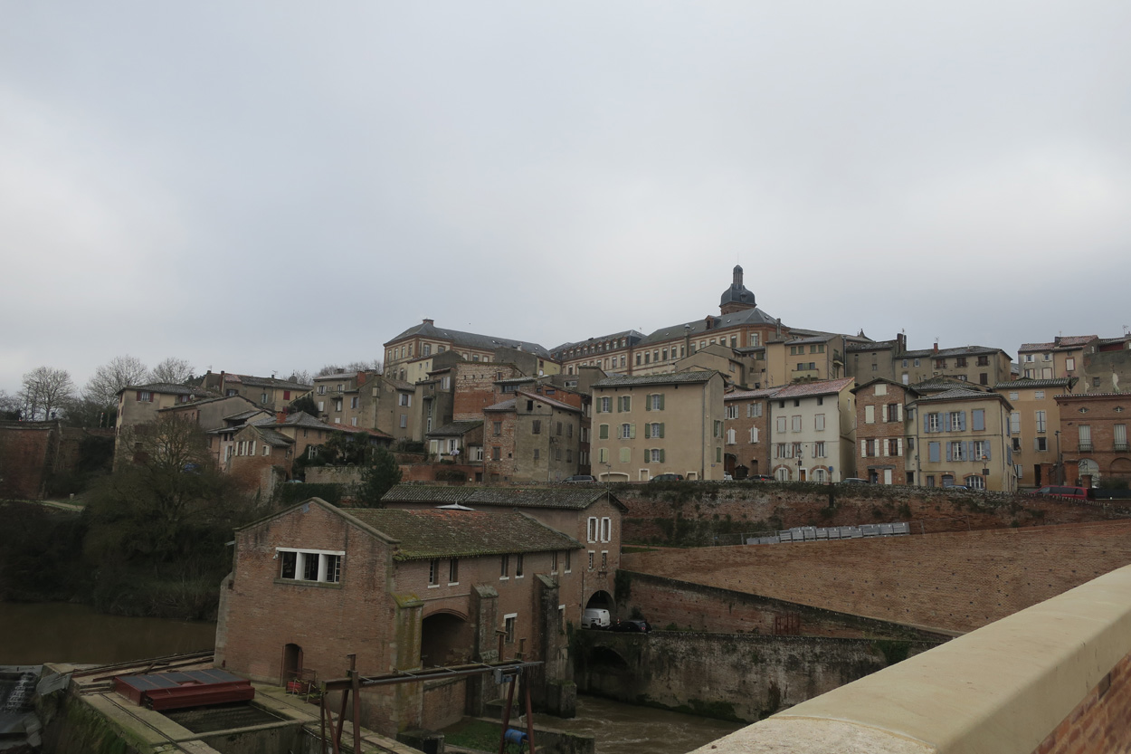 Heute morgen gab es in meinem 4****ab 7Uhr ein gutes Frühstücksbüffet. Da der Sonnenaufgang erst um 8.20Uhr war, ging ich aber erst um 7.30Uhr zum Morgenessen. Um 8.45Uhr radelte ich dann los bis zum ersten Supermarkt, wo ich mich noch mit Getränken eindeckte. Etwa um 9Uhr war ich dann auf dem Voie Verte Bahntrasseradweg. Auf dieser 40km langen, mit Feinkiesbelag versehenen Trasse, fuhr ich dann in zügigem Tempo nach Albi wo ich dann um etwa 11.15Uhr in der Altstadt ankam. Die Altstadt von Albi mit der riesigen Kathedrahle gehört im übrigen zum UNESCO- Weltkulturgut. Daher ließ ich es mir auch nicht nehmen, zumindest den frei zugänglichen Teil der Kathedrale anzusehen. Leider war es heute bis Albi bedeckt mit Temperaturen unter dem Gefrierpunkt, so dass ich praktisch alle Kleider am Leibe trug. Selbst so hatte ich nicht sonderlich warm. Nach Albi folgte dann ein weiterer, aber nur relativ kurzer Bahntrasseradweg von etwa 5km Länge welcher zu einem Bergwerksgelände bei Cagnac les Mines führte. Die Minen sind aber nicht mehr in betrieb und das Abbaugebiet ist mit einem großen Solarpark überbaut. Immerhin hatte ich jetzt dass Glück, dass für den Rest des Tages die Sonne zum Vorschein kam, welche doch sofort für ein angenehmeres Klima sorgte. Über hügeliges Gelände erreichte ich dann um 13.20Uhr die Ortschaft Cordes sur Ciel welche sich teilweise auf einem Gipfels eines Hügels befand. Hier bot sich mir die Gelgenheit, mich in einem Supermarkt nochmals mit Treibstoff einzudecken. 10min später radelte ich dann schon wieder weiter. Meine Marschtabelle ließ es leider nicht zu, noch das Zentrum der Ortschaft auf dem Hügel zu besichtigen. Über einen weiteren Hügelzug kam ich dann zum Fluss L' Aveyron. Dem Fluss entlang durch ein Landschaftlich sehr reizvolles Tal, erreichte ich dann um 15Uhr die historische Kleinstadt Saint Antonin Noble. Obwohl mein Zeitplan eher knapp war und noch 50km bis zu meinem Tagesziel fehlten, ließ ich es mir nicht nehmen das schöne Städtchen noch kurz zu besichtigen, inklusive dessen Kirche. Danach ging es im hügeligen Gelände weiter bis nach Cahors meinem Tagesziel, welches ich kurz vor Einbruch der Dunkelheit um 17.50Uhr erreichte. Leider führte meine Route etwa 25km vor meinem Tagesziel noch über eine gut 5km lange Naturpiste. Diese war teilweise noch tiefgefroren, teilweise aber auch lehmig-feucht, so dass mein Velo doch einiges an Dreck abbekam. Um 18Uhr checkte ich dann im erst besten Hotel am Fluss Lot gegenüber von Chahors ein. Bis ich aber mit mein Velo ins Zimmer ging, war ich sicherlich noch 15Minuten damit beschäftig, es vom gröbsten Dreck zu befreien. Im diesem doch eher teuren 3***Hotel (104€ inkl. Frühstück) konnte ich dann auch noch eine warme Badewanne und ein Gutes Abendessen genießen.