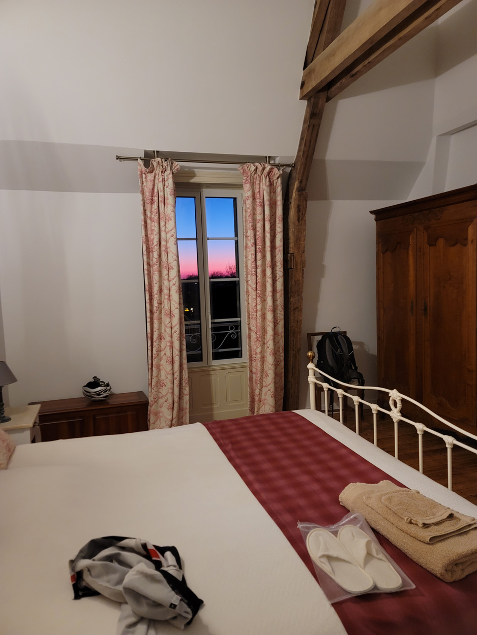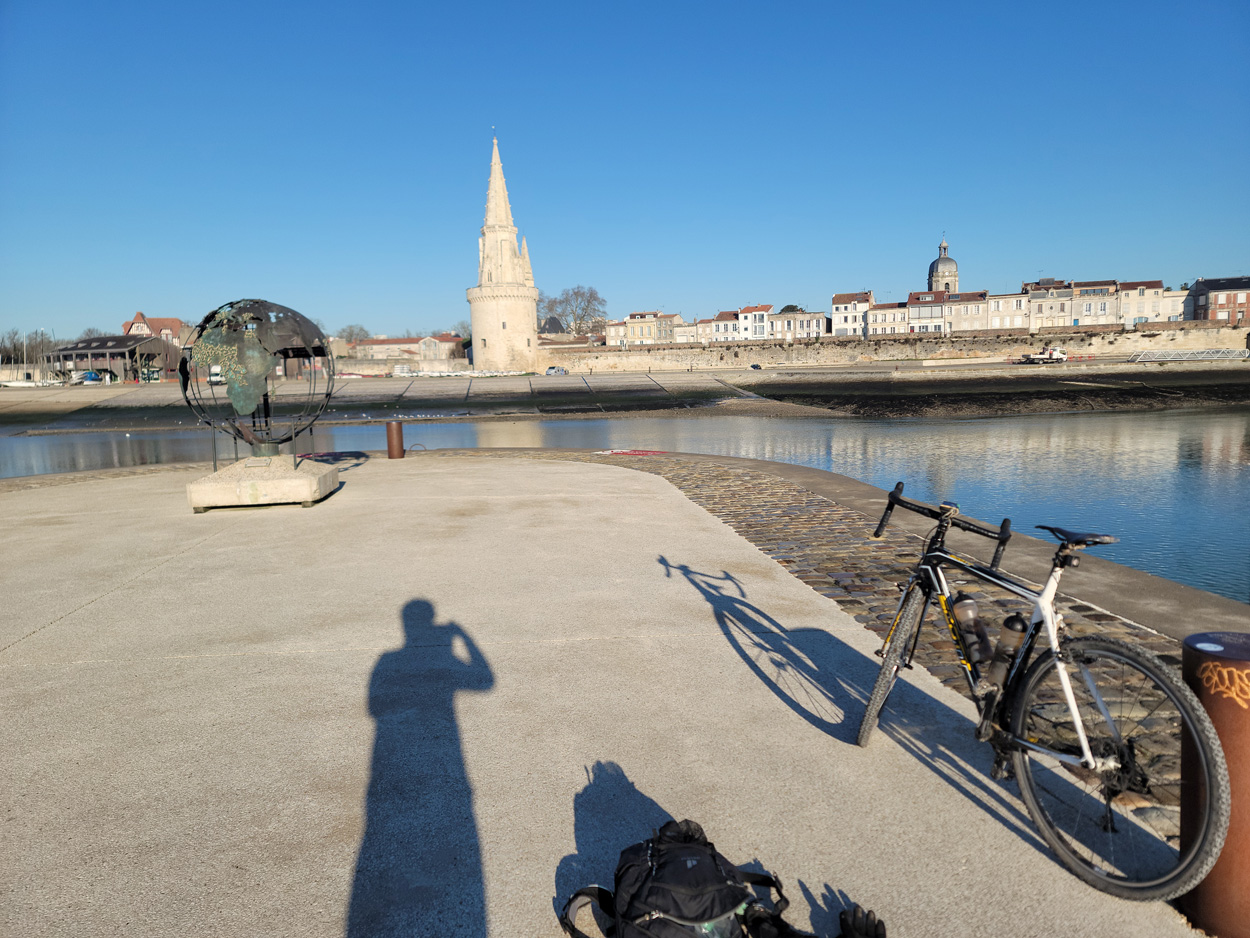 Heute Morgen ging ich um 7.45Uhr zum Frühstück. Es gab es sehr gutes Büffet. So um 8.45Uhr verliess ich dann das Hotel. In der Fussgängerzone von Fouras suchte ich dann noch ein Supermarkt auf um Getränke zu Kaufen. Danach fuhr ich auf der Eurovelo 1 Radroute ins Zentrum von La Rochelle. Auf diesem Abschnitt gab es ein paar ganz schöne Küstenabschnitte. Auch ein paar kürzere Sandpistenabschnitte waren dabei. In der Nähe des Historischen Hafens von La Rochelle suchte ich dann noch ein Velogeschäft auf, um ein Schlauch zu kaufen, weil ich gestern eine Platte hatte. Danach sah ich mir noch Teile der schönen Altstadt rund um den Hafen an. Darauf setzte ich dann meine Fahrt auf der Eurovelo 1 Route fort für die nächsten 40km. Es war eine fürs Quervelo optimale Route. Nur hatte sie durch den gerade auftauenden Boden etwas mehr Rollwiederstand als sonst. Aber einen guten 20er Schnitt liess sich auch so noch fahren. Irgendwo im Schilfried verließ ich dann diese internationale Veloroute und fuhr auf einem Damm bis Lucon. Ebenfalls alles auf Naturwegen. In Lucon wo ich um etwa 13.45Uhr ankam, besichtigte ich noch die prächtige Klosterkirche und suchte danach noch einen Kebabimbiss auf. Gestärkt mit Kebab und Pommes radelte ich dann um 14.30Uhr wieder weiter und nahm die nächsten 65km in Angriff. Nun ging es meist über kleinere Asphaltstraßen in Richtung der 60'000 Einwohnerstadt La Roche sur Yon. Nach dessen Durchquerung folgten dann noch 10km auf einer Voie Verte, also auf einem Bahntrasseradweg. Etwa um 17Uhr folgten dann noch die letzten 14km bis zu meinem Tagesziel Saint Etienne du Bois, wo ich bereits am Morgen ein Zimmer in einem B&B gebucht hatte. Auf diesem Abschnitt gab es dann auch noch einen kurzen nicht so tollen Abschnitt über eine Weide. Um 18Uhr noch kurz vor dem Eindunkeln hatte ich dann mein Etappenort erreicht. Hier suchte ich dann zuerst eine Bäckerei und ein Supermarkt auf um was für Abendessen zu kaufen. Meine Recherchen hatten nämlich ergeben, dass es hier kein Restaurant mehr gibt. Einzig ein Pizzaautomat und zufälligerweise ein Food Truck hätte es heute noch gegeben. Um 18.30Uhr checkte ich dann im B&B in einem kleinen Schlossgebäude ein. Die private Gastgeberin hat mich freundlich empfangen und bot mir sogar an mich in ein Restaurant ins Nachbardorf zu fahren. Da ich aber jetzt Nahrung dabei hatte, genoss ich den ruhigen Abend im Zimmer und schlief dann bald mal ein. Auch die Kleider konnte ich von ihr waschen lassen, was für die morgige lange Bahnfahrt sicher von Vorteil ist