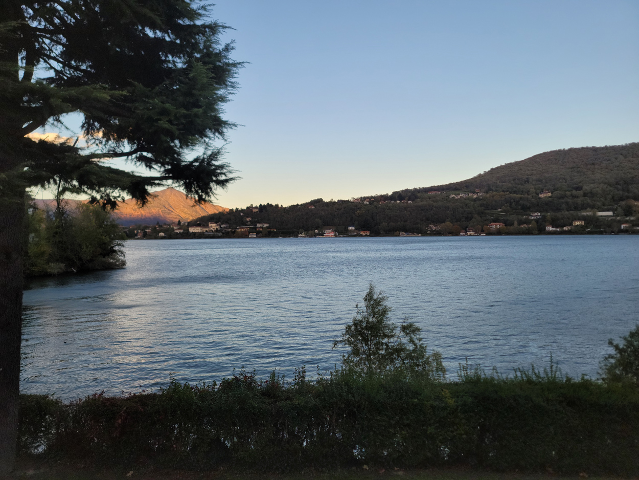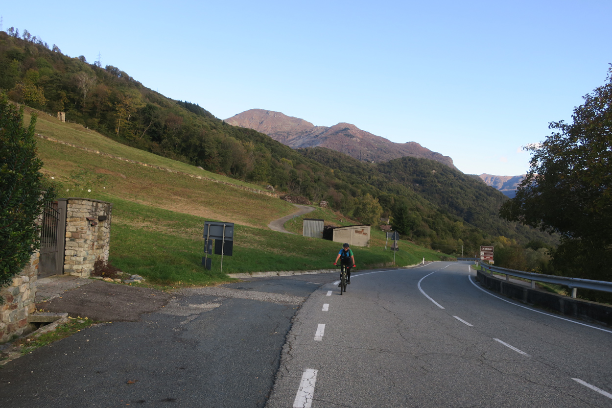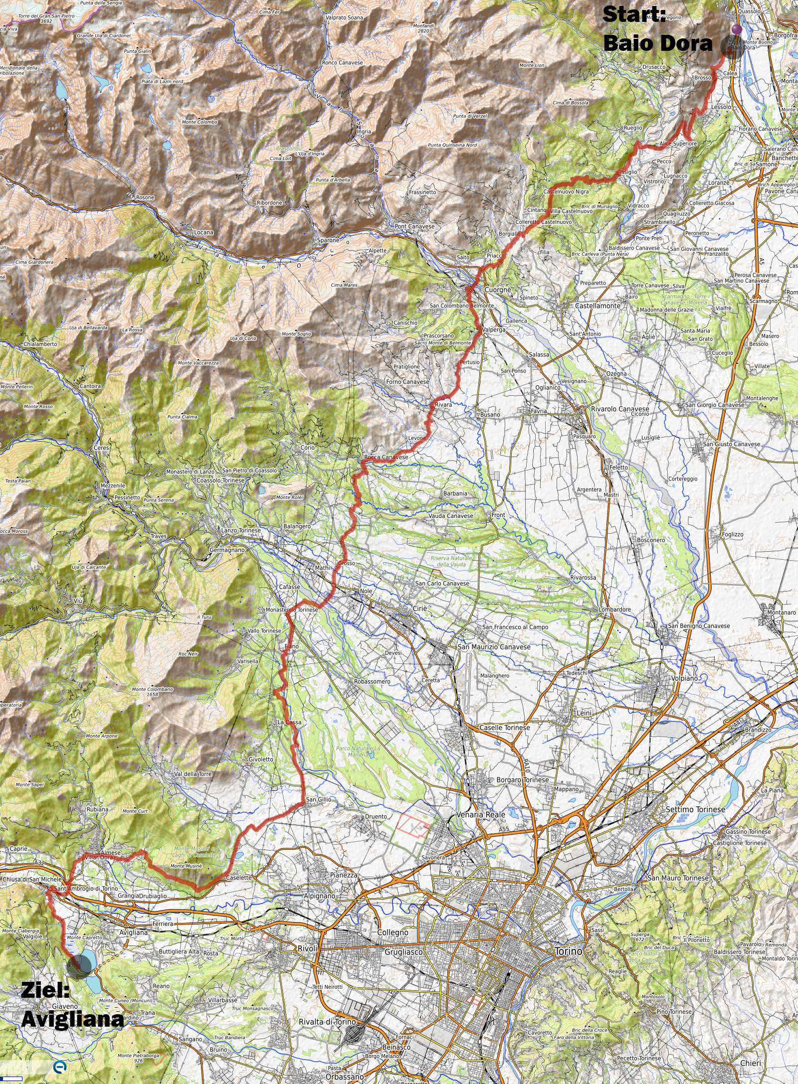 Für heute morgen konnten wir uns im B&B aushandeln, dass wir das Frühstück schon um 6:30 bekamen. Etwa um 7:15 Uhr waren wir dann startbereit. Im ersten Teil des heutigen Tages ging es meist über Pisten, Trails und Nebenstraßen nach Courgne. Hier kamen wir dann etwa um 11 Uhr an und schauten noch das schöne Stadtzentrum an. Danach ging es flach weiter im Hinterland von Turin. Kurz vor 13 Uhr musste ich dann noch eine Platte beklagen. Während ich die Platte flickte, konnte sich mein Kollege etwas mit Proviant verpflegen. Etwa um 15Uhr waren wir dann am Rande des Valle di Susa. Hier wurde dann das Gelände wieder gebirgiger und wir konnten dem Berghang entlang in Richtung Almese fahren. Etwa um 16Uhr waren wir dann in Sant Abrogio di Torino. Hier wollten wir uns dann ein Hotel in der Ortschaft Giaveno buchen. Doch leider war dort nichts verfügbar. Somit machten wir dann etwas früher als vorgesehen, am Lago Grande di Avigliana Feierabend. Im Hotel Chalet del Lago Avigliana bekam wir dann ein Zimmer mit Seeblick. Der Preis für 100 EUR miteinander war dafür völlig OK. Dafür war das Restaurant eher teuer. Aber mit einer Zusatzportion Pommes-Frites, konnten wir unseren Kalorienbedarf dann trotzdem decken