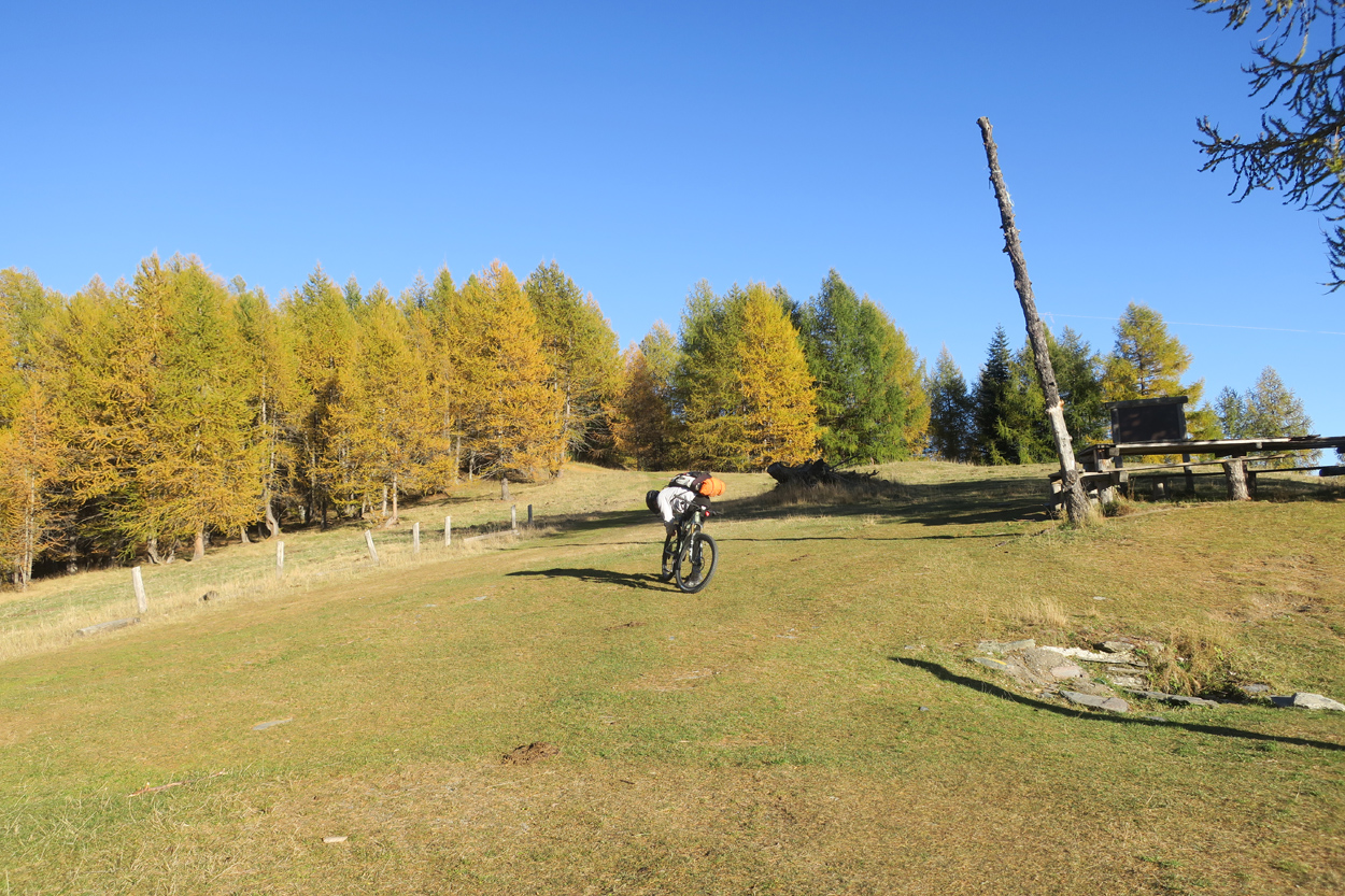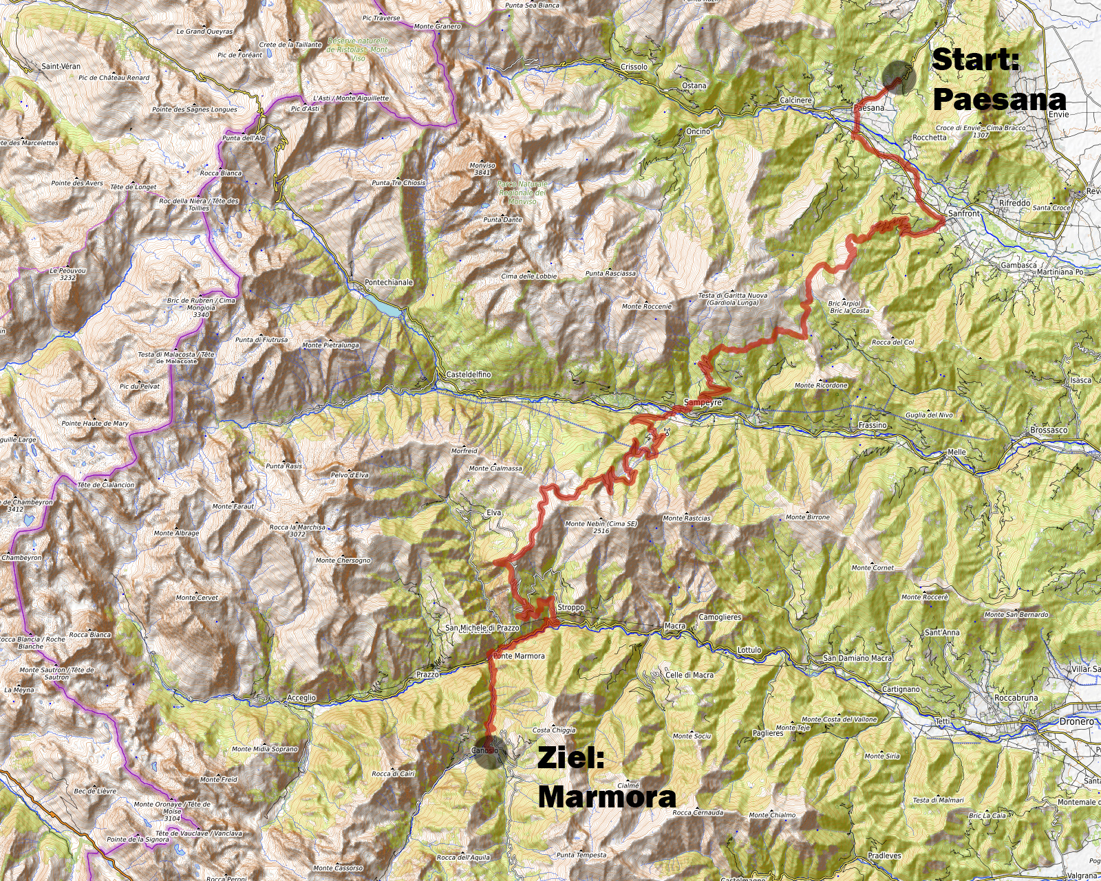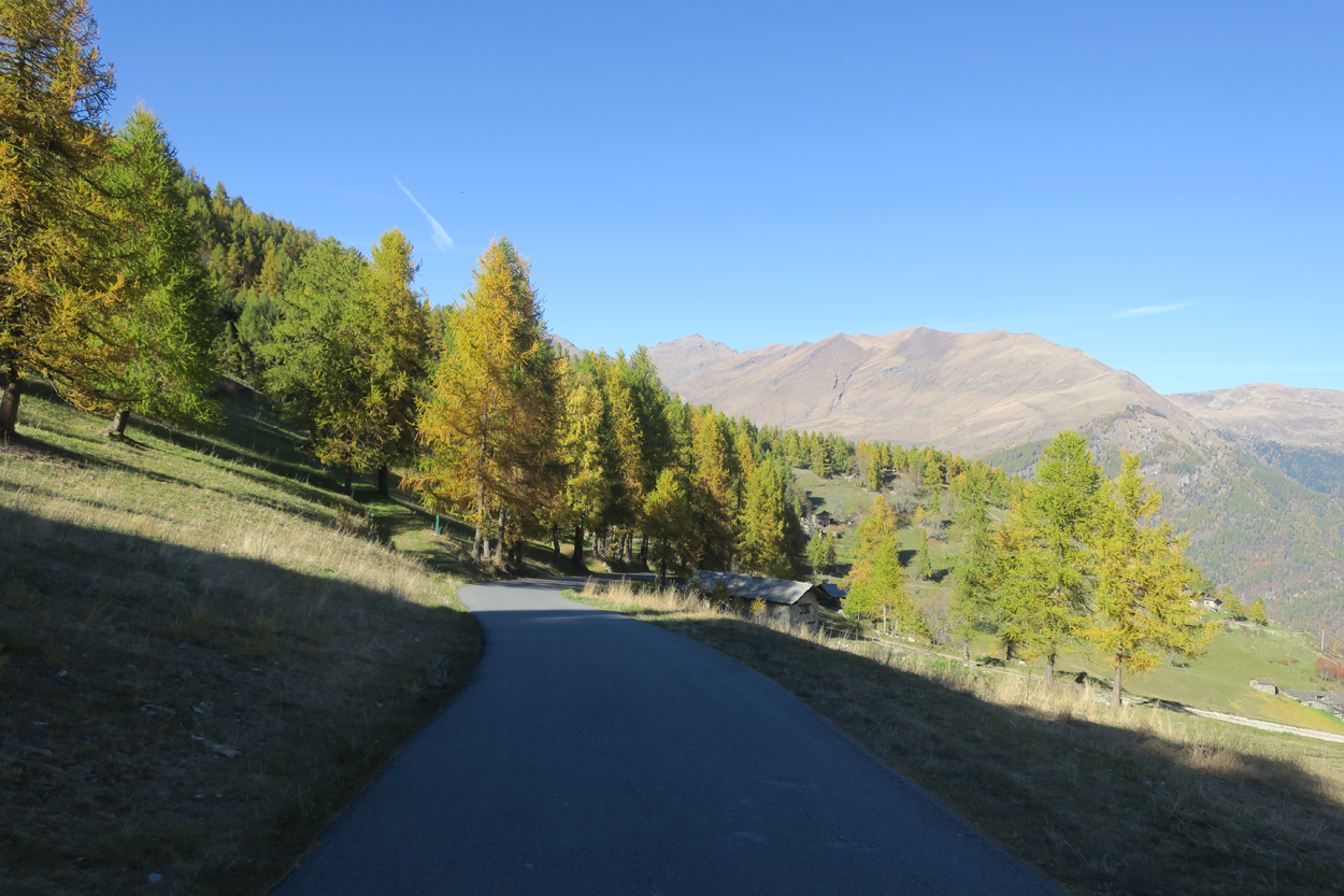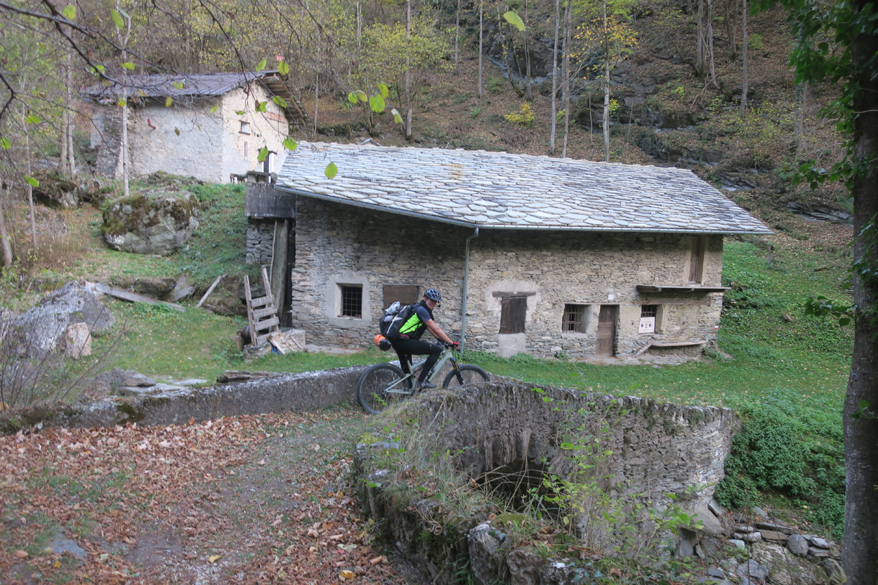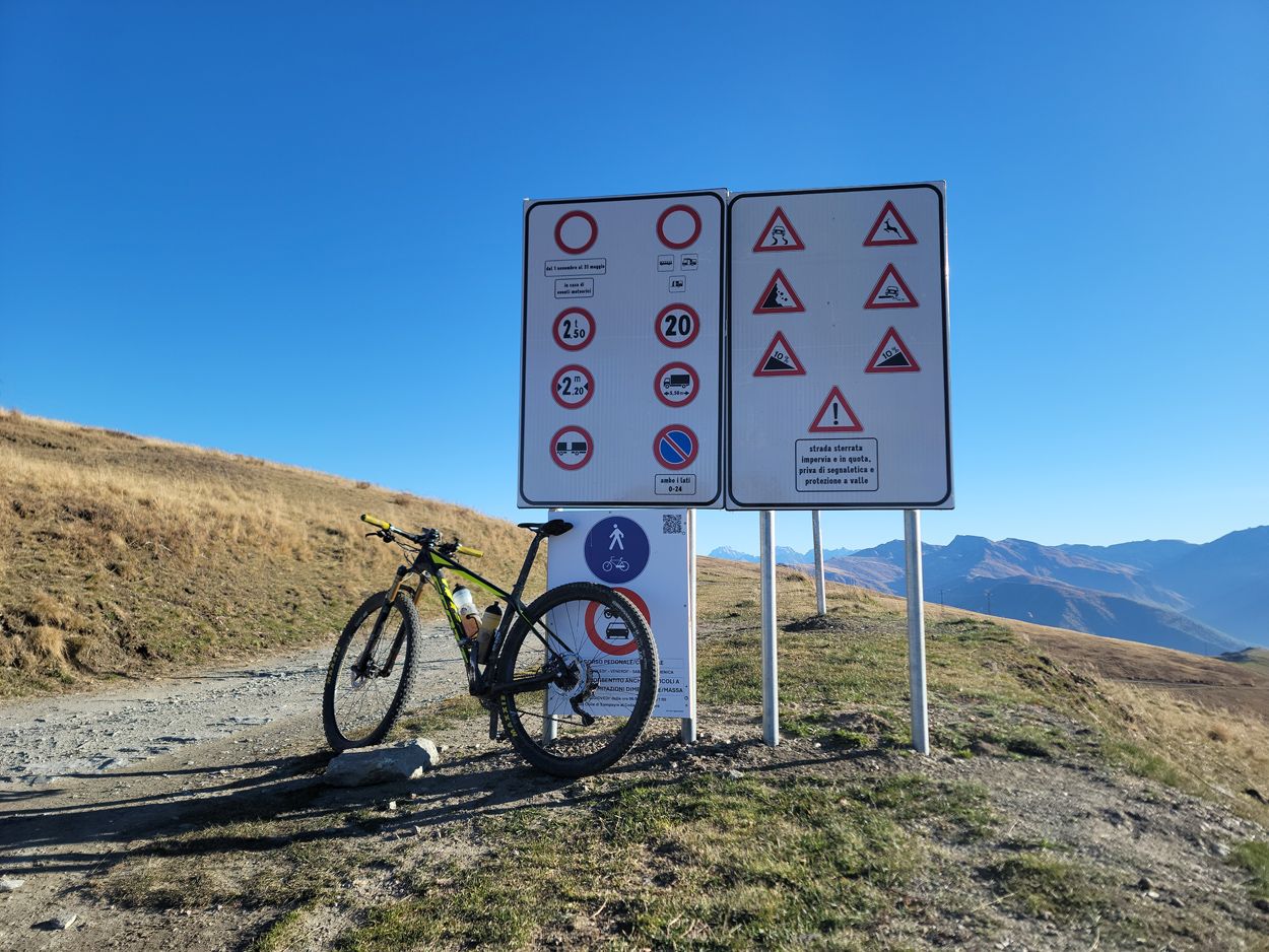 Heute Morgen durften wir schon um 6.30Uhr ans sehr gute Frühstücksbüffet. Etwa um 7:15Uhr starteten wir dann. Zuerst ging es mehr oder weniger flach über Paesana nach Sanfort. In der Ortschaft Robella konnten wir dann noch in einem Dorfladen Saft kaufen. Etwa um 8 Uhr begannen wir dann in Sanfort mit dem Aufstieg über San Bernardo und den Colle di Gilba zum Colle delle Prete. Den Colle del Prete auf 1716m ü M, erreichten wir dann kurz vor 11Uhr auf einer schönen Naturstrasse. Ab hier folgte dann die Piste dem Hang entlang zum Weiler Rua hinunter. Den letzten Teil der Abfahrt nach Sampeyre machten wir dann auf einem Trail. Etwa um 11.40 hatten wir dann Sampeyre erreicht. Hier kaufte ich dann noch etwas Saft in einem Laden. Fürs Mittagessen fanden wir dann in der Nähe des Hauptplatzes sogar noch ein offenes Restaurant wo wir ein gutes Mittagsmenü für 15€ genießen konnten. Etwa um 13Uhr begannen wir dann mit dem gut 1300hm umfassenden Aufstieg zum Colle Sampeyre. Etwa um 15.30Uhr hatten wir dann diesen Übergang ins Valle Maira auf 2284m erreicht. Nach einen Fotoshooting mit der grandiosen Landschaft, begann dann eine ebenso grandiose Trailabfahrt nach Stroppo im Talgrund des Valle Mairas. Zum Abschluss des Tages standen dann nochmals 200hm Aufstieg nach Marmora an. Kurz vor Einbruch der Dunkelheit, erreichten wir dann um 17.40Uhr, die wunderschöne Pensione Ceaglio. Hier bekamen wir ein gutes Zimmer und konnten danach ein 8-gängiges Abendessen genießen. Bei fast jedem Gang wurde noch nachgeschöpft. Schlussendlich aß ich mich mit den guten Sachen so voll, das ich kaum mehr gehen konnte