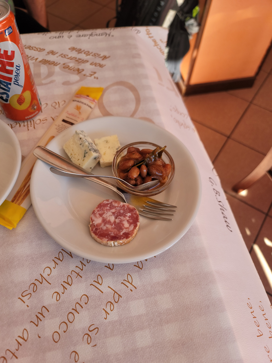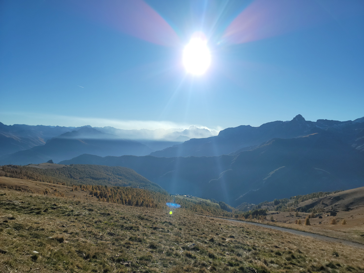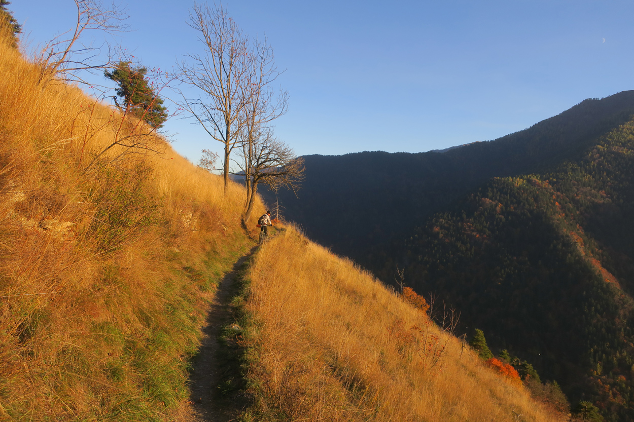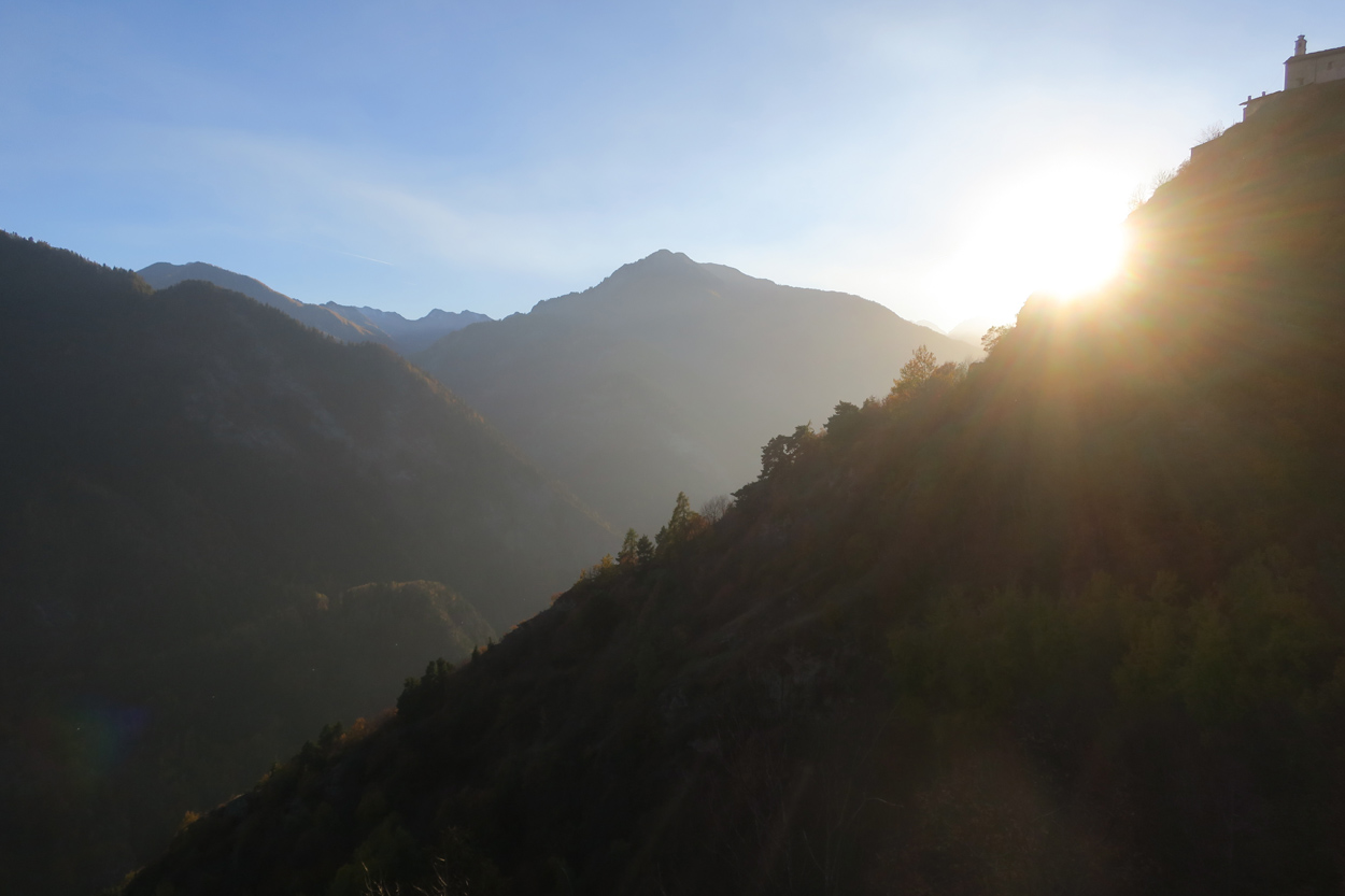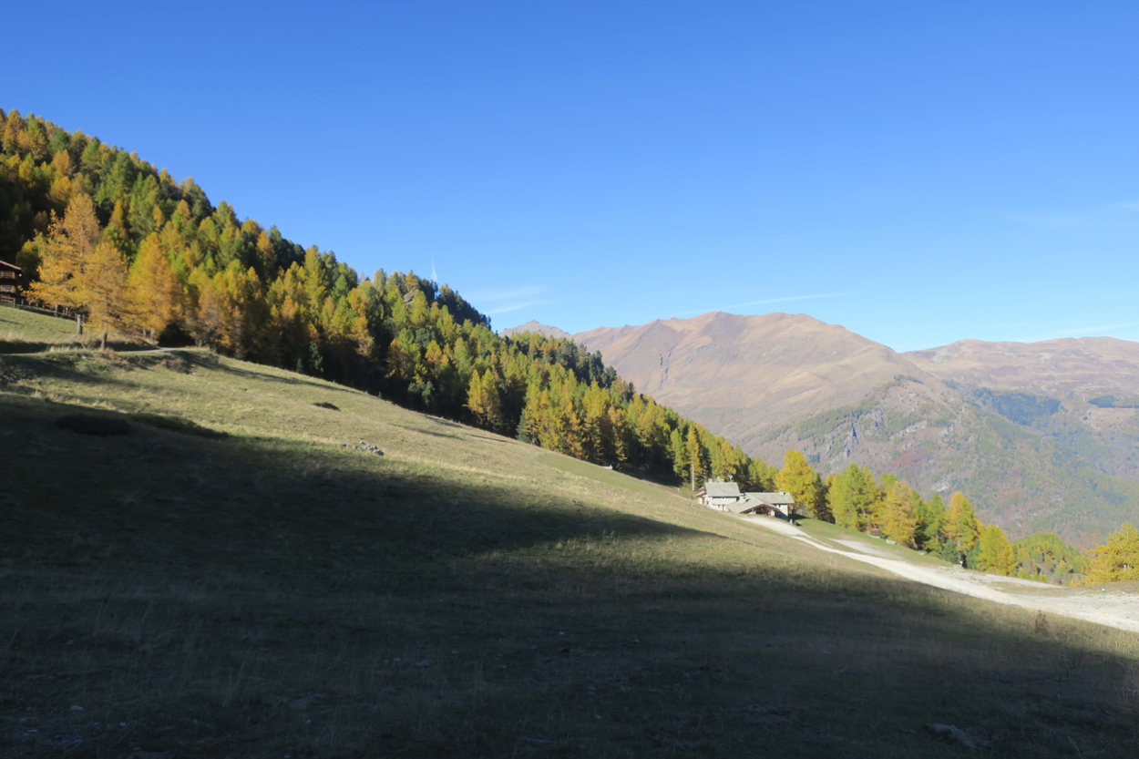 Heute Morgen durften wir schon um 6.30Uhr ans sehr gute Frühstücksbüffet. Etwa um 7:15Uhr starteten wir dann. Zuerst ging es mehr oder weniger flach über Paesana nach Sanfort. In der Ortschaft Robella konnten wir dann noch in einem Dorfladen Saft kaufen. Etwa um 8 Uhr begannen wir dann in Sanfort mit dem Aufstieg über San Bernardo und den Colle di Gilba zum Colle delle Prete. Den Colle del Prete auf 1716m ü M, erreichten wir dann kurz vor 11Uhr auf einer schönen Naturstrasse. Ab hier folgte dann die Piste dem Hang entlang zum Weiler Rua hinunter. Den letzten Teil der Abfahrt nach Sampeyre machten wir dann auf einem Trail. Etwa um 11.40 hatten wir dann Sampeyre erreicht. Hier kaufte ich dann noch etwas Saft in einem Laden. Fürs Mittagessen fanden wir dann in der Nähe des Hauptplatzes sogar noch ein offenes Restaurant wo wir ein gutes Mittagsmenü für 15€ genießen konnten. Etwa um 13Uhr begannen wir dann mit dem gut 1300hm umfassenden Aufstieg zum Colle Sampeyre. Etwa um 15.30Uhr hatten wir dann diesen Übergang ins Valle Maira auf 2284m erreicht. Nach einen Fotoshooting mit der grandiosen Landschaft, begann dann eine ebenso grandiose Trailabfahrt nach Stroppo im Talgrund des Valle Mairas. Zum Abschluss des Tages standen dann nochmals 200hm Aufstieg nach Marmora an. Kurz vor Einbruch der Dunkelheit, erreichten wir dann um 17.40Uhr, die wunderschöne Pensione Ceaglio. Hier bekamen wir ein gutes Zimmer und konnten danach ein 8-gängiges Abendessen genießen. Bei fast jedem Gang wurde noch nachgeschöpft. Schlussendlich aß ich mich mit den guten Sachen so voll, das ich kaum mehr gehen konnte