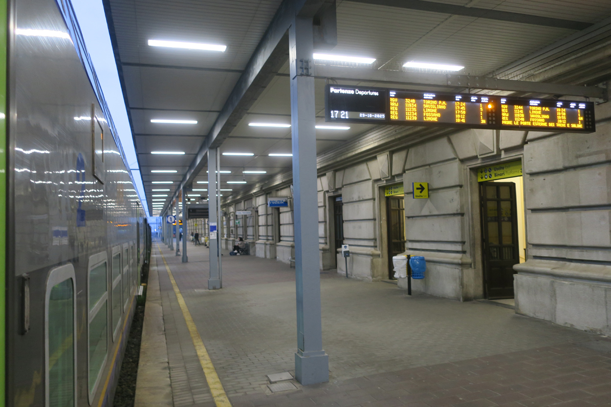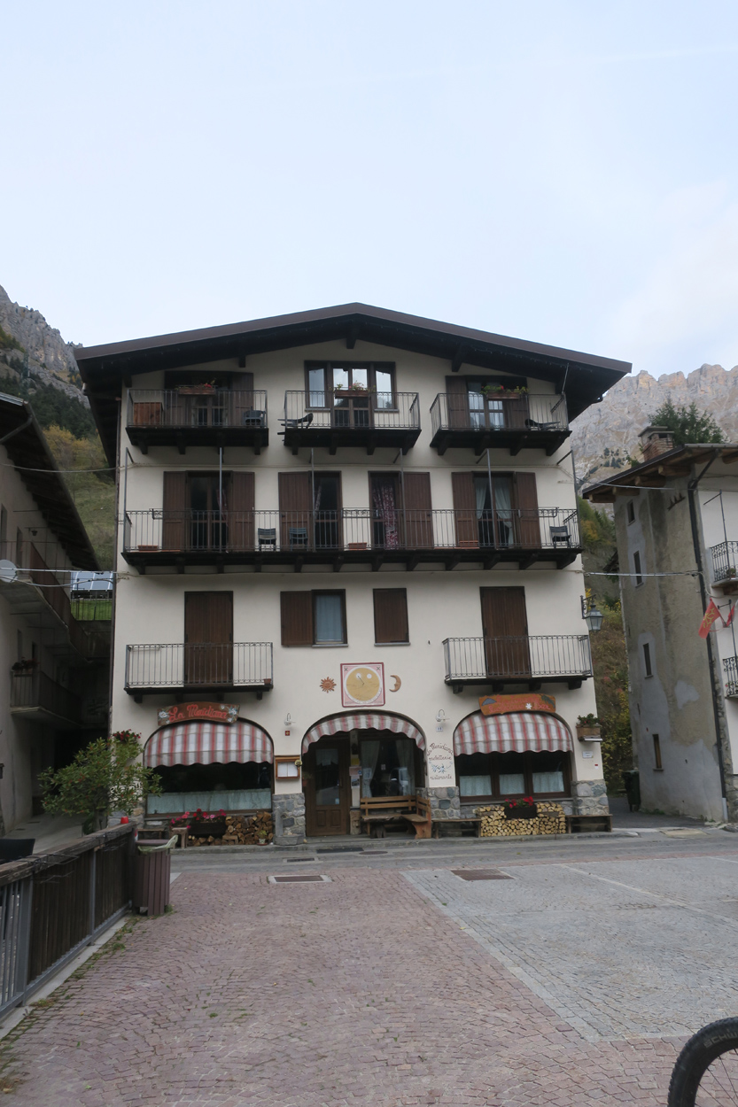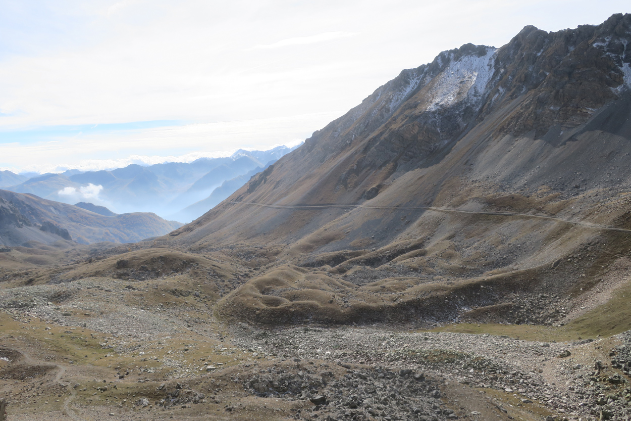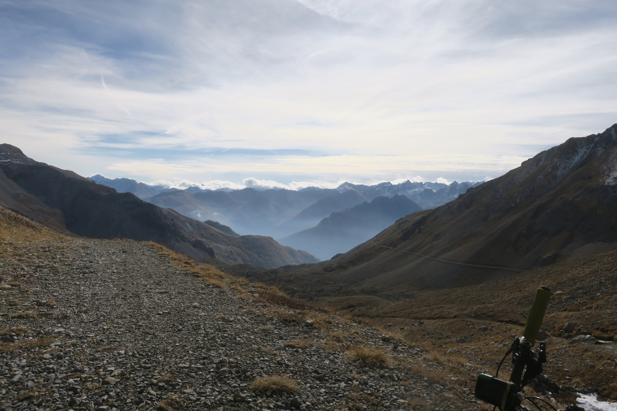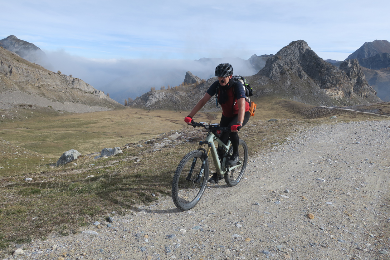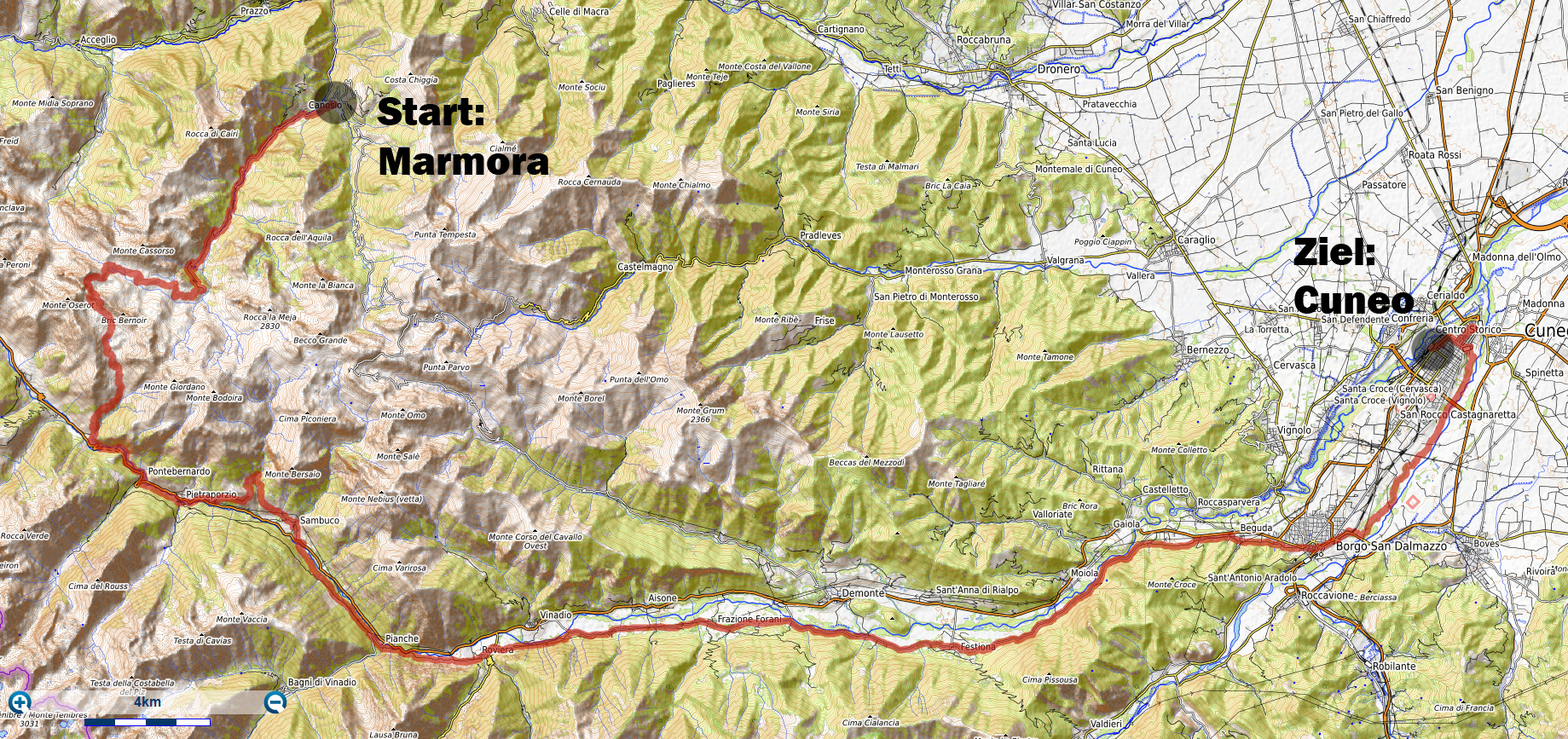 Heute Morgen gab es um 7.30Uhr ein kleines aber sehr gutes Frühstücksbüffet. Etwa um 8.30Uhr waren wir dann startbereit. im Gegensatz zu den letzten Tagen war der Himmel heute wolkenverhangen. Nach einer kurzen Besichtigung des Dörfchens Marmora und einer ganz kurzen Abfahrt begann dann der etwa 1400hm umfassende Aufstieg zur Gardetta Hichebene und zum Passo di Roccia Branca. Etwa auf 2000m ü M lichteten sich dann die Wolken und die Sonne kam zum Vorschein. Der Wegabschnitt vom Passo della Gardetta bis zum Passo di Rocca Brancia war im Gegensatz zu früher in sehr gutem Zustand so dass wir alles fahren konnten. Ziemlich genau zur Mittagszeit (12Uhr) hatten wir dann die Passhöhe erreicht. Da hier auf 2620m ein kalter Wind wehte, zogen wir noch mehr Kleider an. Wenig später machten wir dann an einem sonnigen und windgeschützen Plätzchen unsere Mittagspause und vesperten die Brötchen welche wir von unserer Unterkunft, der Pensione Ceaglio bekommen hatten. Etwa um 13.15Uhr war dann die lange und tolle Trailabfahrt unterhalb von Bersezio zu Ende. Aber auch ab hier ging es dann auf einer Bikeroute abseits der Hauptstrasse nach Sambucco weiter. Sambucco erreichten wir dann um 14Uhr. Leider war hier das Bikehotel Osteria del Pace schon in der Winterpause. So setzten wir dann die Fahrt auf dem Radweg ins knapp 50km entfernte Cuneo fort. Leider verschlechterte sich dann das Wetter relativ schnell. Aber wir hatten das Glück dass wir nur ein paar Tropfen abbekamen und somit gegen 16.30Uhr noch trocken die 50'000Einwohner Metropole Cuneo erreichten. Hier deckten wir uns dann noch mit Proviant für die Heimreise ein. Pünktlich um 17.24Uhr fuhr dann unser Regio-Express Zug in Richtung Torino ab.