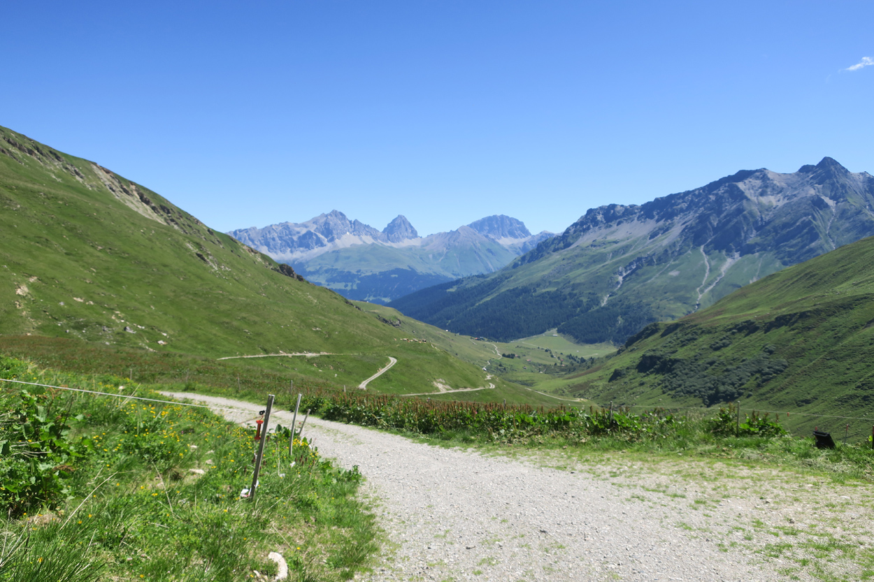 einer sanft ansteigenden Alpstrasse noch den Rest zum Durannapass hinauf ging.